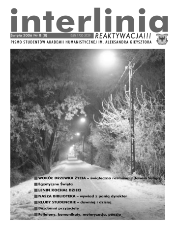 interlinia Święta 2006 Nr 8 (8) ISSN 1730-3729 REAKTYWACJA!!! PISMO STUDENTÓW AKADEMII HUMANISTYCZNEJ IM. ALEKSANDRA GIEYSZTORA ■ WOKÓŁ DRZEWKA ŻYCIA – świąteczna rozmowa z Janem Suligą ■ Egzotyczne Święta ■ LENIN KOCHAŁ DZIECI ■ NASZA BIBLIOTEKA – wywiad z panią dyrektor ■ KLUBY STUDENCKIE – dawniej i dzisiaj ■ Bezdomni przyjaciele ■ Felietony, komunikaty, motoryzacja, poezja W numerze: WOKÓŁ DRZEWKA ŻYCIA O świątecznych obyczajach opowiada Jan Suliga . . . . . . . . . . . . . . . . .3 Egzotyczne Święta . . . . . . . . . . . . . . . . . . . .4 LENIN KOCHAŁ DZIECI (tow. Bierut też) . . . .5 Zakupowe szaleństwo (felieton) . . . . . . . . . .6 Niezapomnianych doznañ BIBLIOTEKA - magazyn wiedzy Wywiad z Jadwigą Miecznikowską, dyrektorem Biblioteki Głównej AH . . . . . . . .8 i osi¹gania szczytów mo¿liwoœci KLUB CZY PUB . . . . . . . . . . . . . . . . . . . .10 w nadchodz¹ce Œwiêta, Wiśniowa zima (felieton) . . . . . . . . . . . . . .11 a przede wszystkim BEZDOMNY PRZYJACIEL - w azylu dla psów w Józefowie . . . . . . . . .12 w Nowym Roku Sezon motoryzacyjny się skończył . . . . . . . .15 ¿yczy Wiersze . . . . . . . . . . . . . . . . . . . . . . . . . .16 Redakcja Numer przygotowany w ramach zajęć warsztatów prasowych Zespół redakcyjny - III rok Wydziału Nauk Politycznych, specjalizacja - dziennikarstwo: Emilia Graużul (red. naczelna) Martyna Chrobak Aleksandra Maksjan Dorota Wermuth Patryk Bielecki Piotr Grzymkowski Kamil Wyrzykowski Wydawca: Akademia Humanistyczna Im. Aleksandra Gieysztora w Pułtusku 06-100 Pułtusk, ul. Daszyńskiego 17 www.ah.edu.pl e-mail: [email protected] 2 Chcecie umieścić na naszych łamach Wasze wiersze, podzielić się swoją opinią na każdy temat, kogoś pozdrowić lub coś ogłosić to piszcie na nasz adres: [email protected]. Zapraszamy do współpracy! Oddamy w dobre ręce!!! Dwa młode, szczepione i zadbane psiaki czekają na właścicieli. Możliwe, że to pół labradory. (Na zdjęciu to czarny i ten u góry.) Kontakt: 606 333 086 lub [email protected]. Święta Bożego Narodzenia Wokół drzewka życia Dekorujemy choinkę, siadamy przy wigilijnym stole, rozpakowujemy prezenty... Wydaje się nam, że tak było zawsze, bo przecież wiemy, że święta Bożego Narodzenia mają tradycję jeszcze przedchrześcijańską. Wtedy były związane z przesileniem zimowym i nazywano je godami. Tamto pogańskie święto zbiegło się z obchodami Bożego Narodzenia po dokładnym ustaleniu daty narodzin Chrystusa, co nastąpiło w V w n.e. O tym, jak ukształtował się znany nam obyczaj obchodzenia Świąt opowiada etnograf, dr Jan Witold Suliga, były dyrektor Państwowego Muzeum Etnograficznego w Warszawie. ■ Dzisiaj nie wyobrażamy sobie Świąt bez udekorowanej choinki w domu. Skąd się wziął w Polsce ten obyczaj? – Choinka jaką znamy dzisiaj jest obyczajem niemieckim odnotowanym po raz pierwszy w XVIII wieku. Wcześniej najprawdopodobniej stawiano choinkę w Niemczech południowych i zachodnich. Dotarła ona do Polski w wieki XIX. Początkowo zadomowiła się w miastach i rodzinach mieszczańskich, dopiero pod koniec międzywojnia przenosi się na wieś. Po wojnie stawianie choinki staje się obyczajem powszechnym. Mało kto wie, że w Polsce mieliśmy swoją własną choinkę, która na- Tradycyjna choinka w luterańskiej Finlandii zywała się podłaźniczka. Był to obcięty szczyt jakiegoś iglaka li symbolem Boga, który nas w tę wieszany pod sufitem czubkiem noc obdarowuje. w dół. Przyozdabiano go orzechami, jabłkami, ciastami, wstążkami. Jabł- ■ Od jak dawna dajemy i dostajemy ka od prawieków Słowianie kojarzyprezenty? li ze świętami. Orzech natomiast jest – Zwyczaj przyszedł poniekąd symbolem nowego życia. W jego również z Niemiec razem z choinką. wnętrzu jest to jądro, które się uro- Obdarowywanie się prezentami, to dzi po rozbiciu skorupki. Choinka stary obyczaj. Początkowo były to musi być świetlista, gdyż jest drzew- podarki symboliczne np. ciasta. kiem życia. Jest centrum świata czy- W XVIII wieku wspomina się o oby- czaju obdarowywania w środowisku szlacheckim. ■ No i wreszcie postać najsilniej kojarzona ze Świętami – Święty Mikołaj. Skąd do nas przywędrował? – Jest to zbitka postaci prawdziwych i mitycznych, nawiązująca do biskupa z Mitry, który żył na przełomie III–IV w. W Polsce pojawił się najpierw jako jedna z postaci w korowodzie kolędników, którzy chodzili od dom do domu i śpiewali kolędy pobierając za to drobne datki. Poprzez śpiew obdarowywali dobrem, życzyli “wszystkiego najlepszego, żeby się rodziło, płodziło...”. Wcześniejsze postaci kolędnicze nie przypominają wcale tego Mikołaja, którego znamy dzisiaj z Hollywood. Obyczaj, że to Święty Mikołaj jest darczyńcą zrodził się na pograniczu Niemiec i Holandii, dość późno bo w wieku XIX, a do nas dotarł 100 lat później. Jako ciekawostkę można dodać, że Święty Mikołaj został przetransportowany do Stanów Zjednoczonych głównie przez emigrację irlandzką i tam stał się tym brzuchatym świętym znanym z filmów. W różnych re- 3 gionach Polski obowiązywała inna tradycja, w Galicji na przykład prezenty przynosił Aniołek. Mikołaj pojawił się znacznie później. Jego tradycyjnym strojem wcale nie była początkowo czerwona czapeczka i kapotka, ale niebieska bądź biała szata. Z czasem zaczęła przemieniać się w kubraczek i dzisiejszy Mikołaj bardziej przypomina dużego skrzata niż chrześcijańskiego świętego. ■ W niektórych krajach prezenty są wkładane do skarpety. To – z naszego punktu widzenia – dość dziwny zwyczaj... – Podarki wkładane w skarpetkę to obyczaj niemiecko-holenderski, jak również i włoski. Próbuje się go narzucić i w Polsce, lecz nie chce się u nas przyjąć. Objął natomiast te tereny, do których sięgała tradycja celtycka. Przy czym we Włoszech wkłada s