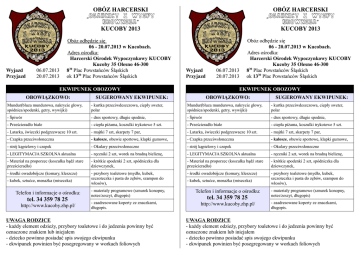OBÓZ HARCERSKI „Osadnicy z Wyspy Brownsea” KUCOBY 2013 Wyjazd Przyjazd 06.07.2013 20.07.2013 Obóz odbędzie się 06 - 20.07.2013 w Kucobach. Adres ośrodka: Harcerski Ośrodek Wypoczynkowy KUCOBY Kucoby 35 Olesno 46-300 30 8 Plac Powstańców Śląskich ok 1330 Plac Powstańców Śląskich OBÓZ HARCERSKI „Osadnicy z Wyspy Brownsea” KUCOBY 2013 Wyjazd Przyjazd 06.07.2013 20.07.2013 EKWIPUNEK OBOZOWY OBOWIĄZKOWO: Obóz odbędzie się 06 - 20.07.2013 w Kucobach. Adres ośrodka: Harcerski Ośrodek Wypoczynkowy KUCOBY Kucoby 35 Olesno 46-300 30 8 Plac Powstańców Śląskich ok 1330 Plac Powstańców Śląskich EKWIPUNEK OBOZOWY SUGEROWANY EKWIPUNEK: OBOWIĄZKOWO: SUGEROWANY EKWIPUNEK: Mundur(bluza mundurowa, nakrycie głowy, spódnica/spodenki, getry, wywijki) - kurtka przeciwdeszczowa, ciepły sweter, polar Mundur(bluza mundurowa, nakrycie głowy, spódnica/spodenki, getry, wywijki) - kurtka przeciwdeszczowa, ciepły sweter, polar - Śpiwór - dres sportowy, długie spodnie, - Śpiwór - dres sportowy, długie spodnie, - Prześcieradło białe - ciepła piżama, koszulki trykotowe 5 szt. - Prześcieradło białe - ciepła piżama, koszulki trykotowe 5 szt. - Latarka, świeczki podgrzewacze 10 szt. - majtki 7 szt, skarpety 7 par, - Latarka, świeczki podgrzewacze 10 szt. - majtki 7 szt, skarpety 7 par, - Czapka przeciwsłoneczna - kalosze, obuwie sportowe, klapki gumowe, - Czapka przeciwsłoneczna - kalosze, obuwie sportowe, klapki gumowe, - strój kąpielowy i czepek - Okulary przeciwsłoneczne - strój kąpielowy i czepek - Okulary przeciwsłoneczne - LEGITYMACJA SZKOLNA aktualna - ręczniki 2 szt, worek na brudną bieliznę, - LEGITYMACJA SZKOLNA aktualna - ręczniki 2 szt, worek na brudną bieliznę, - Materiał na proporzec (koszulka bądź stare prześcieradło) - krótkie spodenki 2 szt, spódniczka dla dziewczynek, - Materiał na proporzec (koszulka bądź stare prześcieradło) - krótkie spodenki 2 szt, spódniczka dla dziewczynek, - środki owadobójcze (komary, kleszcze) - przybory toaletowe (mydło, kubek, szczoteczka i pasta do zębów, szampon do włosów), - środki owadobójcze (komary, kleszcze) - przybory toaletowe (mydło, kubek, szczoteczka i pasta do zębów, szampon do włosów), - kubek, sztućce, menażka (miseczka) Telefon i informacje o ośrodku: tel. 34 359 78 25 http://www.kucoby.zhp.pl/ - materiały programowe (sznurek konopny, notes/zeszyt, długopis) - zaadresowane koperty ze znaczkami, długopis. UWAGA RODZICE - każdy element odzieży, przybory toaletowe i do jedzenia powinny być oznaczone znakiem lub inicjałem - dziecko powinno posiadać spis swojego ekwipunku - ekwipunek powinien być posegregowany w workach foliowych - kubek, sztućce, menażka (miseczka) Telefon i informacje o ośrodku: tel. 34 359 78 25 http://www.kucoby.zhp.pl/ - materiały programowe (sznurek konopny, notes/zeszyt, długopis) - zaadresowane koperty ze znaczkami, długopis. UWAGA RODZICE - każdy element odzieży, przybory toaletowe i do jedzenia powinny być oznaczone znakiem lub inicjałem - dziecko powinno posiadać spis swojego ekwipunku - ekwipunek powinien być posegregowany w workach foliowych