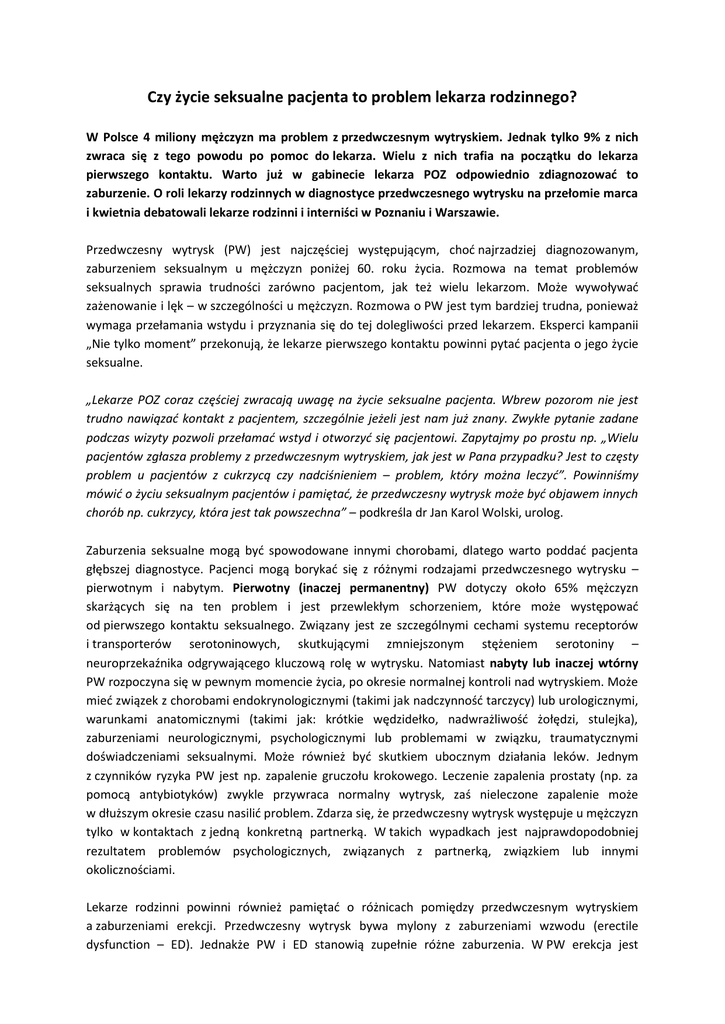 Czy życie seksualne pacjenta to problem lekarza rodzinnego? W Polsce 4 miliony mężczyzn ma problem z przedwczesnym wytryskiem. Jednak tylko 9% z nich zwraca się z tego powodu po pomoc do lekarza. Wielu z nich trafia na początku do lekarza pierwszego kontaktu. Warto już w gabinecie lekarza POZ odpowiednio zdiagnozować to zaburzenie. O roli lekarzy rodzinnych w diagnostyce przedwczesnego wytrysku na przełomie marca i kwietnia debatowali lekarze rodzinni i interniści w Poznaniu i Warszawie. Przedwczesny wytrysk (PW) jest najczęściej występującym, choć najrzadziej diagnozowanym, zaburzeniem seksualnym u mężczyzn poniżej 60. roku życia. Rozmowa na temat problemów seksualnych sprawia trudności zarówno pacjentom, jak też wielu lekarzom. Może wywoływać zażenowanie i lęk – w szczególności u mężczyzn. Rozmowa o PW jest tym bardziej trudna, ponieważ wymaga przełamania wstydu i przyznania się do tej dolegliwości przed lekarzem. Eksperci kampanii „Nie tylko moment” przekonują, że lekarze pierwszego kontaktu powinni pytać pacjenta o jego życie seksualne. „Lekarze POZ coraz częściej zwracają uwagę na życie seksualne pacjenta. Wbrew pozorom nie jest trudno nawiązać kontakt z pacjentem, szczególnie jeżeli jest nam już znany. Zwykłe pytanie zadane podczas wizyty pozwoli przełamać wstyd i otworzyć się pacjentowi. Zapytajmy po prostu np. „Wielu pacjentów zgłasza problemy z przedwczesnym wytryskiem, jak jest w Pana przypadku? Jest to częsty problem u pacjentów z cukrzycą czy nadciśnieniem – problem, który można leczyć”. Powinniśmy mówić o życiu seksualnym pacjentów i pamiętać, że przedwczesny wytrysk może być objawem innych chorób np. cukrzycy, która jest tak powszechna” – podkreśla dr Jan Karol Wolski, urolog. Zaburzenia seksualne mogą być spowodowane innymi chorobami, dlatego warto poddać pacjenta głębszej diagnostyce. Pacjenci mogą borykać się z różnymi rodzajami przedwczesnego wytrysku – pierwotnym i nabytym. Pierwotny (inaczej permanentny) PW dotyczy około 65% mężczyzn skarżących się na ten problem i jest przewlekłym schorzeniem, które może występować od pierwszego kontaktu seksualnego. Związany jest ze szczególnymi cechami systemu receptorów i transporterów serotoninowych, skutkującymi zmniejszonym stężeniem serotoniny – neuroprzekaźnika odgrywającego kluczową rolę w wytrysku. Natomiast nabyty lub inaczej wtórny PW rozpoczyna się w pewnym momencie życia, po okresie normalnej kontroli nad wytryskiem. Może mieć związek z chorobami endokrynologicznymi (takimi jak nadczynność tarczycy) lub urologicznymi, warunkami anatomicznymi (takimi jak: krótkie wędzidełko, nadwrażliwość żołędzi, stulejka), zaburzeniami neurologicznymi, psychologicznymi lub problemami w związku, traumatycznymi doświadczeniami seksualnymi. Może również być skutkiem ubocznym działania leków. Jednym z czynników ryzyka PW jest np. zapalenie gruczołu krokowego. Leczenie zapalenia prostaty (np. za pomocą antybiotyków) zwykle przywraca normalny wytrysk, zaś nieleczone zapalenie może w dłuższym okresie czasu nasilić problem. Zdarza się, że przedwczesny wytrysk występuje u mężczyzn tylko w kontaktach z jedną konkretną partnerką. W takich wypadkach jest najprawdopodobniej rezultatem problemów psychologicznych, związanych z partnerką, związkiem lub innymi okolicznościami. Lekarze rodzinni powinni również pamiętać o różnicach pomiędzy przedwczesnym wytryskiem a zaburzeniami erekcji. Przedwczesny wytrysk bywa mylony z zaburzeniami wzwodu (erectile dysfunction – ED). Jednakże PW i ED stanowią zupełnie różne zaburzenia. W PW erekcja jest prawidłowa, lecz wytrysk następuje przed rozpoczęciem penetracji pochwy lub 1-2 minuty od rozpoczęcia penetracji. PW charakteryzuje niezdolność do kontroli lub opóźnienia wytrysku; występuje częściej niż ED. Zaburzenia erekcji są trwałą niezdolnością do uzyskania i utrzymania erekcji pozwalającej na satysfakcjonujący stosunek seksualny. Nie mają nic wspólnego z kontrolą wytrysku. Występują częściej w starszym wieku, zaburzenia wzwodu często związane są z innymi chorobami. „Przedwczesny wytrysk współwystępuje z niektórymi schorzeniami. Dlatego diagnozując zaburzenia wytrysku, pytamy pacjentów o różne schorzenia, które mogą do niego predysponować, np.: zbyt krótkie wędzidełko napletka, zapalenie żołędzi lub gruczołu krokowego, czy też cukrzyca, sprzyjająca powstawaniu stanów zapalnych żołędzi prącia. Na pojawienie się przedwczesnego wytrysku wpłynąć mogą również schorzenia układowe oraz przyjmowanie niektórych leków, działających na ośrodkowy układ nerwowy. Schorzenia te należy wyleczyć lub odpowiednio kontrolować, przed rozpoczęciem leczenia przedwczesnego wytrysku” – zaznaczył dr Andrzej Depko, seksuolog, Prezes Polskiego Towarzystwa Medycyny Seksualnej. O czym powinien pamiętać każdy lekarz pierwszego kontaktu? Utrata funkcji seksualnej może być objawem choroby lub efektem działania leków Zaburzenia seksualne są powszechne Ważna jest prewencja chorób przenoszonych drogą płciową Życie seksualne jest związane ze zdrowiem (jest elementem zdrowia) i z cyklem życiowym O problemie przedwczesnego wytrysku eksperci kampanii „Nie tylko moment” rozmawiali podczas Top Medical Trends w Poznaniu oraz XIII Krajowej Konferencji Szkoleniowej TIP w Warszawie. Sesje poprowadzili wybitni eksperci: urolog prof. Piotr Radziszewski, seksuolog dr Andrzej Depko oraz psychiatra prof. Marcin Wojnar. Podczas spotkania przedstawiono problem PW oraz aktualne wytyczne dotyczące jego leczenia. Nowością w terapii PW, przedstawioną podczas spotkań, jest Priligy (dapoksetyna), który jest pierwszym i jedynym lekiem zarejestrowanym do leczenia przedwczesnego wytrysku. Zaznaczono również, że lekarze pierwszego kontaktu i interniści są prawdopodobnie najwięk