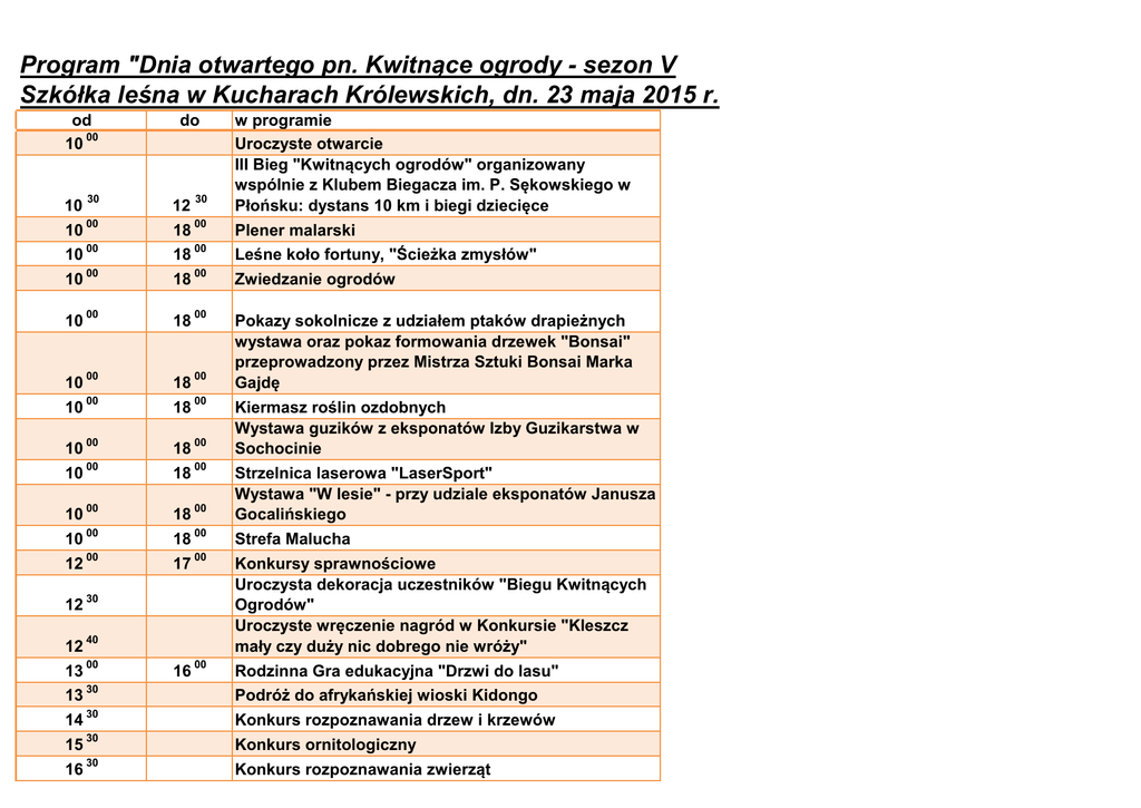 Program "Dnia otwartego pn. Kwitnące ogrody - sezon V Szkółka leśna w Kucharach Królewskich, dn. 23 maja 2015 r. od 10 00 do 10 30 12 30 w programie Uroczyste otwarcie III Bieg "Kwitnących ogrodów" organizowany wspólnie z Klubem Biegacza im. P. Sękowskiego w Płońsku: dystans 10 km i biegi dziecięce 10 00 18 00 Plener malarski 00 00 10 18 Leśne koło fortuny, "Ścieżka zmysłów" 10 00 18 00 Zwiedzanie ogrodów 10 00 18 00 10 00 18 00 Pokazy sokolnicze z udziałem ptaków drapieżnych wystawa oraz pokaz formowania drzewek "Bonsai" przeprowadzony przez Mistrza Sztuki Bonsai Marka Gajdę 10 00 18 00 10 00 18 00 10 00 00 10 00 18 00 Strzelnica laserowa "LaserSport" Wystawa "W lesie" - przy udziale eksponatów Janusza Gocalińskiego 10 00 18 00 Strefa Malucha 00 00 12 18 Kiermasz roślin ozdobnych Wystawa guzików z eksponatów Izby Guzikarstwa w Sochocinie 17 12 30 12 40 13 00 16 00 Konkursy sprawnościowe Uroczysta dekoracja uczestników "Biegu Kwitnących Ogrodów" Uroczyste wręczenie nagród w Konkursie "Kleszcz mały czy duży nic dobrego nie wróży" Rodzinna Gra edukacyjna "Drzwi do lasu" 13 30 Podróż do afrykańskiej wioski Kidongo 14 30 Konkurs rozpoznawania drzew i krzewów 15 30 Konkurs ornitologiczny 16 30 Konkurs rozpoznawania zwierząt