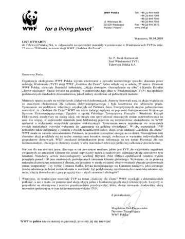 WWF Polska ul. Wiśniowa 38 02-520 Warszawa Polska / Poland Tel: +48 22 849 8469 +48 22 848 7364 +48 22 848 7592 +48 22 848 7593 Fax: +48 22 646 3672 www.wwf.pl Warszawa, 08.04.2010 LIST OTWARTY do Telewizji Polskiej SA, w odpowiedzi na nierzetelne materiały wyemitowane w Wiadomościach TVP1w dniu 27 marca 2010 roku, na temat akcji WWF „Godzina dla Ziemi”. Sz. P. Jacek Karnowski Szef Wiadomości TVP1 Telewizja Polska S.A. Szanowny Panie, Organizacja ekologiczna WWF Polska wyraża ubolewanie z powodu nierzetelnego sposobu ukazania przez redakcję Wiadomości TVP1 akcji WWF „Godzina dla Ziemi”, która odbyła się w sobotę, 27 marca. Zdaniem WWF Polska, materiały Dominiki Jabłońskiej „Akcja ekologów. Oszczędzanie na niby” i Kamila Dziubki „Terror ekologów. Zgasić światło na godzinę” wyemitowane tego dnia w Wiadomościach TVP1 nie spełniały podstawowych standardów dziennikarstwa, jakich należy oczekiwać od publicznych mediów. Materiały oparte zostały na wybiórczych i fałszywych informacjach. Autorzy forsowali tezę, że akcja wiązała się ze znacznym obciążeniem dla systemu elektroenergetycznego i była kosztowna dla odbiorców prądu. Tymczasem na podstawie informacji uzyskanych od Polskich Sieci Energetycznych można jednoznacznie stwierdzić, że „Godzina dla Ziemi” WWF nie miała żadnego wpływu na poprawne funkcjonowanie Krajowego Systemu Elektroenergetycznego. Zgodnie z opinią Polskiego Towarzystwa Przesyłu i Rozdziału Energii Elektrycznej, zważywszy na zasięg akcji, nie mogła ona spowodować znaczących zmian zapotrzebowania na moc. Co więcej, w zapowiedzi materiału pani Jabłońskiej pojawiło się nieprawdziwe stwierdzenie, że WWF apelował o wyłączenie wszystkich sprzętów elektrycznych. Tymczasem nasza organizacja we wszystkich swoich materiałach wzywała wyłącznie do „zgaszenia na godzinę oświetlenia”. W obu materiałach TVP pominięto także informację o jednym z dwóch zasadniczych celów akcji, czyli edukacji. „Godzina dla Ziemi” WWF miała za zadanie uświadomienie Polakom, że powinni oszczędzać energię na co dzień. Niewątpliwie taki charakter akcji przekłada się na realne zmniejszenie kosztów energii, zwłaszcza w wymiarze indywidualnych gospodarstw domowych. WWF przekazał dziennikarzom jasne informacje na ten temat. Pozostaje dla nas niezrozumiałym, dlaczego te elementy zostały w obu materiałach telewizji publicznej całkowicie przemilczane. Nie jest dla nas również jasne, dlaczego w tak poważnym medium, jakim jest TVP, do wyjaśniania zagadnień związanych ze zmianami klimatu nie został zaproszony żaden z naukowców zajmujących się zawodowo tym tematem. Narodowy serwis meteorologiczny Wielkiej Brytanii (Met Office) opublikował ostatnio wyniki przeglądu ponad 100 prac naukowych, poświęconych zmianom klimatu globalnego. Wykazano, że za pomocą naturalnych przyczyn zmienności klimatu, nie jesteśmy w stanie wyjaśnić obserwowanych obecnie gwałtownych zmian temperatury. Czy wybór Tomasza Rożka, fizyka niezajmującego się klimatem naukowo, jako jedynego źródła informacji na temat zmian klimatu w materiale, był podyktowany rzetelnością dziennikarską autorów czy raczej chęcią dowiedzenia z góry przyjętej tezy o złych zamiarach ekologów? Wierzymy, że tendencyjne materiały TVP na temat „Godziny dla Ziemi” WWF wynikają z dziennikarskich potknięć, a nie z faktu, że patronat nad akcją objęła jedna z konkurencyjnych stacji telewizyjnych. Liczymy w przyszłości na obiektywne i uczciwe przedstawianie przedsięwzięć, które, służąc ratowaniu środowiska, służą interesom społecznym, w tym także interesom widzów TVP. Z poważaniem, Magdalena Dul-Komosińska Dyrektor Zarządzający WWF Polska WWF to pełna nazwa naszej organizacji, prosimy jej nie rozwijać