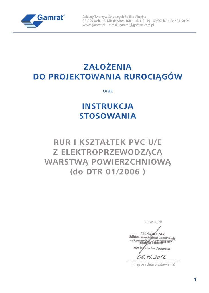 Zakłady Tworzyw Sztucznych Spółka Akcyjna 38-200 Jasło, ul. Mickiewicza 108 • tel. (13) 491 60 00, fax (13) 491 50 94 www.gamrat.pl • e-mail: [email protected] ZAŁOŻENIA DO PROJEKTOWANIA RUROCIĄGÓW oraz INSTRUKCJA STOSOWANIA RUR I KSZTAŁTEK PVC U/E Z ELEKTROPRZEWODZĄCĄ WARSTWĄ POWIERZCHNIOWĄ (do DTR 01/2006 ) Zatwierdził ................................................ (podpis pieczątką) ...................................................... (miejsce i data wystawienia) 1 Zakłady Tworzyw Sztucznych Spółka Akcyjna 38-200 Jasło Mickiewicza 108 INSTRUKCJA STOSOWANIA Rury i kształtki z poli(chlorku winylu) z elektroprzewodzącą warstwą powierzchniową typu PVC-U/E do DTR - 01/2006 Edycja 4 październik 2012r. strona 3/24 OPIS WYROBU I PRZEZNACZENIE Rury i kształtki z PVC-U/E z elektroprzewodzącą warstwą powierzchniową są wyrobami trudnopalnymi o czasie samo gaśnięcia <5 sekund i rezystancji powierzchniowej poniżej 106Ω. Maksymalne ciśnienia robocze wynoszą 2,5 MPa, a temperatura pracy do 40 °C. Rury produkowane są na bazie rur PVC-U (z nieplastyfikowanego poli(chlorku winylu), posiadających w zakresach ciśnień: 0÷25 bar (0÷2,5 MPa). Zakres średnic wynika z wymiarów produkowanych rur i kształtek PVC-U, które mogą być zarówno metryczne jak i calowe, dopuszczone do obrotu na rynku krajowym. Przewiduje się maksymalne średnice rur: 225mm (dotyczy to średnicy zewnętrznej rur) dla połączeń kołnierzowych, do 200mm dla połączeń kielichowych klejonych oraz z elastyczną uszczelką do 630mm. Podstawowa długość produkowanych rur wynosi 6mb, która może być dzielona na dowolne odcinki. Połączenia tulei kołnierzowej z rurą wykonywane są przez producenta rur natomiast połączenia kielichowe służą do łączenia w miejscu montażu. Parametry techniczne rur i kształtek predysponują je do stosowania w odwodnieniu oddziałowym, międzypoziomowym, rurociągach szybowych w tym rurociągach przeciwpożarowych w przedziałach dopuszczalnych ciśnień. Dodatkowo rury i kształtki zabezpieczone warstwą elektroprzewodzącą na powierzchni zewnętrznej, wewnętrznej i czołowej mogą być stosowane do przesyłania powietrza do 6 atm. Parametry palności i elektroprzewodności pozwalają na stosowanie ich do budowy rurociągów w pomieszczeniach wyrobisk podziemnych zakładów górniczych ze stopniem niebezpieczeństwa wybuchu metanu: „a”, „b”, „c”. Zastosowany system połączeń umożliwia łatwy i szybki montaż rurociągu. System ten jest spójny z produkowanym już systemem rur i kształtek produkowanych przez Zakłady Tworzyw Sztucznych GAMRAT S.A., co stwarza możliwość szerokiego ich zastosowania w każdych niemal warunkach zakładów górniczych. System rur i kształtek z PVC-U/E produkowany przez firmę GAMRAT jest spójny z systemem rur stalowych. Rury i kształtki z PVC-U/E z elektroprzewodzącą warstwą powierzchniową przeznaczone są do zabudowy w podziemnych wyrobiskach pionowych i poziomych o stopniach niebezpieczeństwa wybuchu metanu „a”, „b” oraz „c”. W szczególności zalecane są do budowy rurociągów: • odwadniających, • przeciwpożarowych, • sprężonego powietrza, • emulsji wodno-olejowych, • wody technologicznej, TRANSPORT RUR I KSZTAŁTEK Transport rur i kształtek z tworzyw sztucznych takich jak poli(chlorek winylu) PVC-U ze względu na swoje właściwości fizyko-mechaniczne powinien być prowadzony w sposób uniemożliwiający uszkodzenie materiału. Transport rur i kształtek może być prowadzony w podziemnych wyrobiskach zakładów górniczych środkami przeznaczonymi do transportu długich materiałów. Z uwagi na specyficzne właściwości rur z PVC-U/E należy przy transporcie zachować następujące wymagania: • Prace załadunkowe powinny się odbywać przy temperaturach powietrza w przedziale od +5°C do +30°C. Szczególną ostrożność, głównie przy transporcie i przeładunku rur z PVC-U/E należy zachować w temperaturze bliskiej 0°C i niższej z uwagi na kruchość materiału rur w tych temperaturach. 3 Zakłady Tworzyw Sztucznych Spółka Akcyjna 38-200 Jasło Mickiewicza 108 INSTRUKCJA STOSOWANIA Rury i kształtki z poli(chlorku winylu) z elektroprzewodzącą warstwą powierzchniową typu PVC-U/E do DTR - 01/2006 Edycja 4 październik 2012r. strona 4/24 UWAGA ! Podczas prac przeładunkowych, rur nie należy rzucać. • Transport rur nie pakietowanych: rury powinny być układane na równym podłożu na podkładach drewnianych ułożonych prostopadle do osi rur i zabezpieczone przed zarysowaniem przez podłożenie tektury falistej i desek pod łańcuchy spinające boczne ściany skrzyń samochodowych. Szerokość podkładek oddzielających warstwy rur powinna wynosić co najmniej 10 cm, a grubość powinna być tak dobrana by kołnierze nie uszkodziły powierzchni sąsiadujących rur. Zabezpieczenie przed przesuwaniem się warstw rur można dokonać za pomocą kołków i klinów drewnianych. Rury powinny leżeć kielichami naprzemianlegle. Na rurach nie wolno przewozić innych materiałów. • Bezpieczny i prawidłowy transport rur to przede wszystkim podparcie ładunku na całej długości, odpowiednie jego zabezpieczenie przed przemieszczaniem się. • W trakcie za i rozładunku przy użyciu żurawi należy stosować liny miękkie np. nylonowe, bawełniano-konopne czy z tworzyw sztucznych. Nie wolno stosować metalowych lin i łańcuchów. • Rury z PVC-U/E produkowane przez GAMRAT S.A. dostarczane są do odbiorcy w fabrycznych opakowaniach (pakietach), co zapewnia odpowiednie zabezpieczenie podczas składowania, załadunku i transportu. Należy jedynie zapewnić im odpowiednie płaskie ułożenie i zabezpieczyć przed przemieszczaniem się. Podczas załadunku lub rozładunku należy zwracać uwagę na ostrożne obchodzenia się z rurami, nie wolno ich rzucać, co może spowodować ich uszkodzenie, nie przeciągać po twardym podłożu, aby nie znis