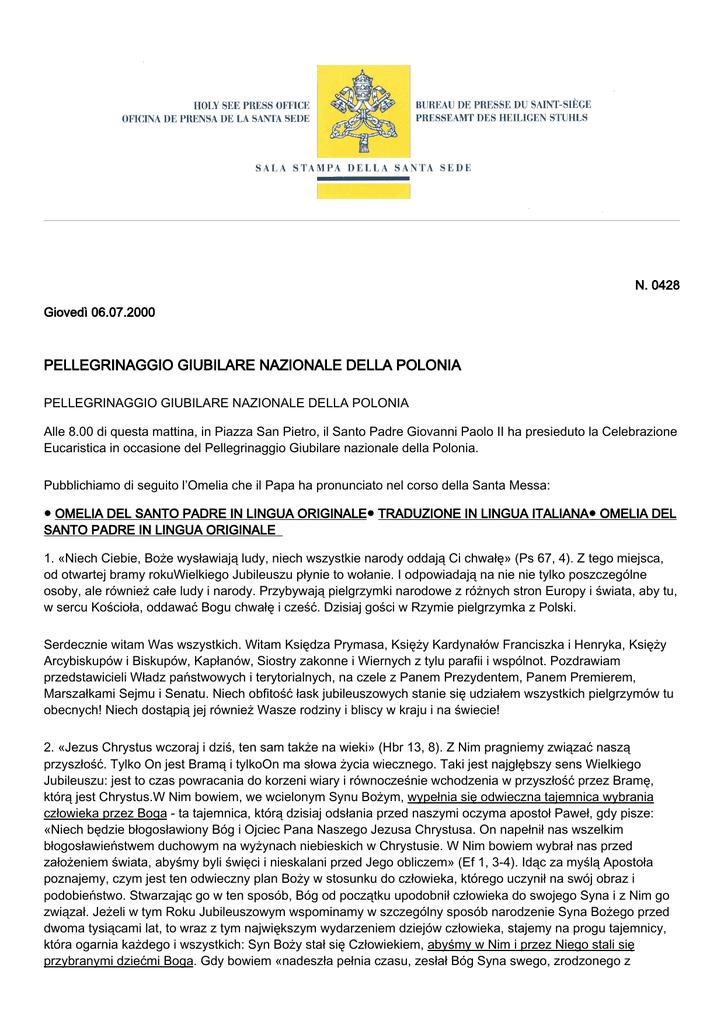 N. 0428 Giovedì 06.07.2000 PELLEGRINAGGIO GIUBILARE NAZIONALE DELLA POLONIA PELLEGRINAGGIO GIUBILARE NAZIONALE DELLA POLONIA Alle 8.00 di questa mattina, in Piazza San Pietro, il Santo Padre Giovanni Paolo II ha presieduto la Celebrazione Eucaristica in occasione del Pellegrinaggio Giubilare nazionale della Polonia. Pubblichiamo di seguito l’Omelia che il Papa ha pronunciato nel corso della Santa Messa: ● OMELIA DEL SANTO PADRE IN LINGUA ORIGINALE● TRADUZIONE IN LINGUA ITALIANA● OMELIA DEL SANTO PADRE IN LINGUA ORIGINALE 1. «Niech Ciebie, Boże wysławiają ludy, niech wszystkie narody oddają Ci chwałę» (Ps 67, 4). Z tego miejsca, od otwartej bramy rokuWielkiego Jubileuszu płynie to wołanie. I odpowiadają na nie nie tylko poszczególne osoby, ale również całe ludy i narody. Przybywają pielgrzymki narodowe z różnych stron Europy i świata, aby tu, w sercu Kościoła, oddawać Bogu chwałę i cześć. Dzisiaj gości w Rzymie pielgrzymka z Polski. Serdecznie witam Was wszystkich. Witam Księdza Prymasa, Księży Kardynałów Franciszka i Henryka, Księży Arcybiskupów i Biskupów, Kapłanów, Siostry zakonne i Wiernych z tylu parafii i wspólnot. Pozdrawiam przedstawicieli Władz państwowych i terytorialnych, na czele z Panem Prezydentem, Panem Premierem, Marszałkami Sejmu i Senatu. Niech obfitość łask jubileuszowych stanie się udziałem wszystkich pielgrzymów tu obecnych! Niech dostąpią jej również Wasze rodziny i bliscy w kraju i na świecie! 2. «Jezus Chrystus wczoraj i dziś, ten sam także na wieki» (Hbr 13, 8). Z Nim pragniemy związać naszą przyszłość. Tylko On jest Bramą i tylkoOn ma słowa życia wiecznego. Taki jest najgłębszy sens Wielkiego Jubileuszu: jest to czas powracania do korzeni wiary i równocześnie wchodzenia w przyszłość przez Bramę, którą jest Chrystus.W Nim bowiem, we wcielonym Synu Bożym, wypełnia się odwieczna tajemnica wybrania człowieka przez Boga - ta tajemnica, którą dzisiaj odsłania przed naszymi oczyma apostoł Paweł, gdy pisze: «Niech będzie błogosławiony Bóg i Ojciec Pana Naszego Jezusa Chrystusa. On napełnił nas wszelkim błogosławieństwem duchowym na wyżynach niebieskich w Chrystusie. W Nim bowiem wybrał nas przed założeniem świata, abyśmy byli święci i nieskalani przed Jego obliczem» (Ef 1, 3-4). Idąc za myślą Apostoła poznajemy, czym jest ten odwieczny plan Boży w stosunku do człowieka, którego uczynił na swój obraz i podobieństwo. Stwarzając go w ten sposób, Bóg od początku upodobnił człowieka do swojego Syna i z Nim go związał. Jeżeli w tym Roku Jubileuszowym wspominamy w szczególny sposób narodzenie Syna Bożego przed dwoma tysiącami lat, to wraz z tym największym wydarzeniem dziejów człowieka, stajemy na progu tajemnicy, która ogarnia każdego i wszystkich: Syn Boży stał się Człowiekiem, abyśmy w Nim i przez Niego stali się przybranymi dziećmi Boga. Gdy bowiem «nadeszła pełnia czasu, zesłał Bóg Syna swego, zrodzonego z 2 niewiasty, zrodzonego pod Prawem, aby wykupił tych, którzy podlegali Prawu, abyśmy mogli otrzymać przybrane synostwo» (Ga 4, 4-5). Jeżeli dziś pielgrzymujemy do świętej bramy Wielkiego Jubileuszu, to przede wszystkim po to, ażeby dziękować Bogu za wielką łaskę przybranego synostwa Bożego, które wraz z narodzeniem Chrystusa stało się udziałem człowieka. Tę łaskę - jak pisze św. Paweł - otrzymaliśmy od Boga, "abyśmy byli święci i nieskalani przed Jego obliczem" (Ef 1, 4) i "byśmy istnieli ku chwale Jego majestatu" (Ef 1, 12). Nie można osiągnąć świętości, nie można istnieć dla chwały Boga inaczej, jak tylko przez Chrystusa, z Chrystusem i w Chrystusie. "W Nim mamy odkupienie przez Jego krew - odpuszczenie występków, według bogactwa Jego łaski" (Ef 1, 7). Dlatego w tym Roku Jubileuszowym w szczególny sposób Kościół prowadzi nas drogą pokuty i pojednania, abyśmy zbliżyli się z ufnością do Chrystusa i zaczerpnęli z niewyczerpanych ródeł Jego miłosierdzia. "On odpuszcza wszystkie nasze winy, On leczy wszystkie choroby, On nasze życie ratuje od zguby, otacza nas łaską i zmiłowaniem" (por. Ps 103, 3). Jeżeli Kościół odwołuje się dziś do starodawnej praktyki odpustu i do niej zachęca, to właśnie dlatego, że czas jubileuszowy jest szczególnie sposobny do tego, by człowiek otworzył swoje serce na działanie tej łaski, która wypływa z otwartego Serca Odkupiciela. Pisze św. Paweł: Chrystus "jest zadatkiem naszego dziedzictwa w oczekiwaniu na odkupienie, które nas czyni własnością [Boga], ku chwale Jego majestatu" (Ef 1, 14). Jakże więc nie korzystać z łaski tego czasu, który przybliża nas do Chrystusa i pozwala pełniej uczestniczyć w tym dziedzictwie, jakie Ojciec przygotował nam w swojej chwale! 3. Kiedyś w Nazarecie Chrystus powiedział o sobie: "Duch Pański spoczywa na Mnie, ponieważ Mnie namaścił i posłał Mnie, abym ubogim niósł dobrą nowinę, więniom głosił wolność, a niewidomym przejrzenie; abym uciśnionych odsyłał wolnymi, abym obwoływał rok łaski od Pana. (...) Dziś spełniły się te słowa Pisma, któreście słyszeli" (Łk 4, 18-19.21). To «dziś» trwa nieustannie od dnia, w którym Syn Boży przyszedł na ziemię. Po Jego śmierci i zmartwychwstaniu to «dziś» trwa w Kościele, w którym Chrystus jest obecny, aż do skończenia świata. To «dziś» dokonuje się w każdym z nas, którzy przez chrzest zostaliśmy włączeni w Chrystusa. Trzeba, abyśmy w roku Wielkiego Jubileuszu w szczególny sposób uświadomili sobie tę prawdę. Trzeba, abyśmy pamiętali, że to Chrystusowe «dziś» ma trwać w przyszłych wiekach, aż do Jego powtórnego przyjścia. Ta świadomość niech wyznacza program życia Kościoła i życia każdego z nas w nowym tysiącleciu. Do tego ewangelicznego programu nawiązywały w ostatnich latach poszczególne diecezje podczas lokalnych synodów duszpasterskich i cały Koś