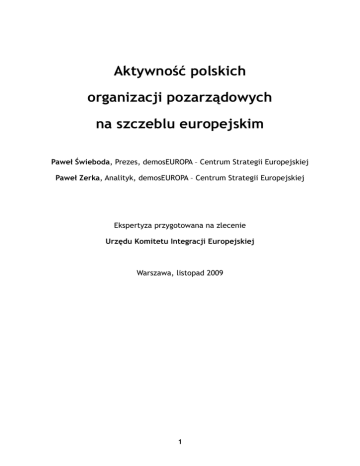 Aktywność polskich organizacji pozarządowych na szczeblu europejskim Paweł Świeboda, Prezes, demosEUROPA – Centrum Strategii Europejskiej Paweł Zerka, Analityk, demosEUROPA – Centrum Strategii Europejskiej Ekspertyza przygotowana na zlecenie Urzędu Komitetu Integracji Europejskiej Warszawa, listopad 2009 1 Spis treści Wstęp ............................................................................... 3 1. Organizacje pozarządowe i wolontariat w Polsce i za granicą .. 9 2. Działanie NGOsów na szczeblu UE .................................... 25 3. Polskie NGOs o aktywności na szczeblu europejskim ............ 4. NGOs a Prezydencja ..................................................... 68 5. Rekomendacje ............................................................ 80 51 Bibliografia ........................................................................ 93 Aneks ............................................................................... 96 2 Wstęp Cel ekspertyzy Przedmiotem ekspertyzy jest aktywność polskich organizacji pozarządowych (NGOs) na szczeblu europejskim, ze szczególnym uwzględnieniem ich wpływu na proces decyzyjny w Unii Europejskiej (UE). Zgromadzone dane mają służyć do realizacji dwóch celów. Po pierwsze, mają pozwolić na sformułowanie rekomendacji dla administracji co do wykorzystania potencjału krajowych NGOsów podczas polskiej Prezydencji w Radzie UE w drugiej połowie 2011 r. Silny nacisk położony został na aktywność europejską tych organizacji, które działają w obszarach związanych z prawdopodobnymi priorytetami polskiego przewodnictwa, aczkolwiek badania objęły również te NGOs, których obszar działania nie pokrywa się bezpośrednio z tymi priorytetami. Dodatkowo, zbadany został wolontariat jako instrument, który mógłby zostać wykorzystywany przez NGOs podczas polskiej Prezydencji. Po drugie, ekspertyza ma pomóc polskim NGOsom w rozwoju działalności na szczeblu europejskim, poprzez zademonstrowanie sposobów rozpoczęcia lub rozwoju takiej aktywności, korzyści z nią związanych oraz potencjalnych źródeł finansowania. Ekspertyza wpisuje się w harmonogram przygotowań polskiej administracji do sprawowania Prezydencji w Radzie UE. W ramach tych przygotowań, administracja publiczna dąży do ustanowienia mechanizmów współpracy z sektorem pozarządowym w zakresie przygotowania Prezydencji, co z jednej strony ma pomóc rządowi w skuteczniejszej realizacji priorytetów, a z drugiej strony służyć rozwojowi trzeciego sektora w Polsce. Polski rząd rok temu podjął pierwsze działania mające na celu nawiązanie współpracy z polskimi organizacjami pozarządowymi w zakresie przygotowania Prezydencji. W 2008 r. Urząd Komitetu Integracji Europejskiej (UKIE) zlecił Instytutowi Spraw Publicznych przygotowanie ekspertyzy pt. "Polska Prezydencja w Radzie Unii Europejskiej: współpraca administracji publicznej z sektorem pozarządowym", która została opublikowana w tym samym roku. Z kolei w lipcu 2009 r. UKIE 3 zaprosił przedstawicieli ok. 30 NGOsów na spotkanie, które miało zapoczątkować współpracę Urzędu z trzecim sektorem w zakresie prowadzenia działań informacyjnych na temat polskiego przewodnictwa w Radzie UE. Podczas spotkania przedstawiono założenia strategii komunikacyjnej, które w części miałyby być realizowane przez organizacje, na zasadzie konkursów. We wrześniu, podczas Mazowieckiego Forum Inicjatyw Pozarządowych odbyła się debata „Polska Prezydencja w Radzie UE w 2011 – perspektywy współpracy III sektora i administracji publicznej”. Zarówno biorący w niej udział urzędnicy UKIE, jak i przedstawiciele Ogólnopolskiej Federacji Organizacji Pozarządowych (OFOP), zapewniali o chęci i gotowości do współpracy, aczkolwiek strona pozarządowa, nie do końca zadowolona z dotychczasowej współpracy, postulowała stworzenie bardziej interaktywnej formy dialogu. W międzyczasie, UKIE zlecił NGOsom przygotowanie szeregu ekspertyz na tematy dotyczące współpracy administracji i trzeciego sektora w kontekście Prezydencji. W grudniu 2009 r., zgodnie z jedną z rekomendacji zawartych w ekspertyzie ISP, UKIE we współpracy z Przedstawicielstwem Komisji Europejskiej w Polsce zorganizuje konferencję "Współpraca administracji rządowej z trzecim sektorem w kontekście wyzwań związanych z członkostwem Polski w Unii Europejskiej". Podczas tego wydarzenia, poza prezentacją wyników ekspertyz, ma zostać rozwinięty dialog między administracją a NGOsami, a także wypracowane założenia stałej współpracy między nimi. Niniejsza praca stanowi, pod wieloma względami, rozwinięcie ekspertyzy ISP z 2008 r. Zadaniem tamtej ekspertyzy było "sformułowanie rekomendacji dla polskiej administracji państwowej, jak należy włączyć sektor pozarządowy w proces przygotowania i przeprowadzenia Prezydencji w Unii Europejskiej w 2011 r.". Jednym z jej głównych wniosków była potrzeba wykorzystania kontaktów polskich NGOsów z partnerami zagranicznymi i ich doświadczenia w dziedzinie europejskiej. W niniejszej ekspertyzie pogłębiamy to zagadnienie, badając jakie konkretnie doświadczenia mają polskie NGOs we wpływaniu na unijny proces decyzyjny, a także czy i w jakim zakresie utrzymują kontakty z zagranicznymi NGOsami. Analiza ta ma pozwolić na sformułowanie przez administrację publiczną strategii działań w zakresie promocji priorytetów polskiej Prezydencji. 4 Definicje Temat ekspertyzy wymaga wyjaśnienia zawartych w nim podstawowych pojęć: „organizacja pozarządowa” oraz „aktywność na szczeblu europejskim”, a także związanych z nimi kategorii „wolontariatu” i „lobbingu”. Aktywność na szczeblu europejskim została zdefiniowana jako: z Wywieranie wpływu na stanowienie prawa na szczeblu UE oraz kształt realizowanej polityki, zarówno bezpośrednio (np. poprzez udział w konsultacjach i przedkładanie rekomendacji), jak i po