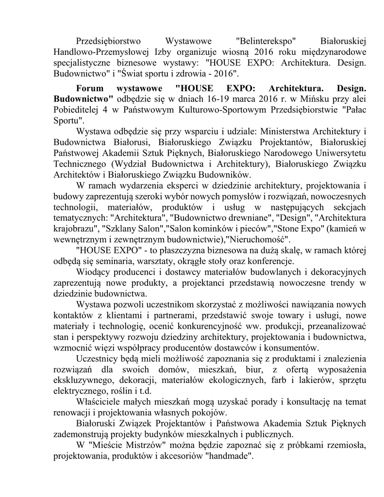 Przedsiębiorstwo Wystawowe "Belinterekspo" Białoruskiej Handlowo-Przemysłowej Izby organizuje wiosną 2016 roku międzynarodowe specjalistyczne biznesowe wystawy: "HOUSE EXPO: Architektura. Design. Budownictwo" i "Świat sportu i zdrowia - 2016". Forum wystawowe "HOUSE EXPO: Architektura. Design. Budownictwo" odbędzie się w dniach 16-19 marca 2016 r. w Mińsku przy alei Pobieditelej 4 w Państwowym Kulturowo-Sportowym Przedsiębiorstwie "Pałac Sportu". Wystawa odbędzie się przy wsparciu i udziale: Ministerstwa Architektury i Budownictwa Białorusi, Białoruskiego Związku Projektantów, Białoruskiej Państwowej Akademii Sztuk Pięknych, Białoruskiego Narodowego Uniwersytetu Technicznego (Wydział Budownictwa i Architektury), Białoruskiego Związku Architektów i Białoruskiego Związku Budowników. W ramach wydarzenia eksperci w dziedzinie architektury, projektowania i budowy zaprezentują szeroki wybór nowych pomysłów i rozwiązań, nowoczesnych technologii, materiałów, produktów i usług w następujących sekcjach tematycznych: "Architektura", "Budownictwo drewniane", "Design", "Architektura krajobrazu", "Szklany Salon","Salon kominków i pieców","Stone Expo" (kamień w wewnętrznym i zewnętrznym budownictwie),"Nieruchomość". "HOUSE EXPO" - to płaszczyzna biznesowa na dużą skalę, w ramach której odbędą się seminaria, warsztaty, okrągłe stoły oraz konferencje. Wiodący producenci i dostawcy materiałów budowlanych i dekoracyjnych zaprezentują nowe produkty, a projektanci przedstawią nowoczesne trendy w dziedzinie budownictwa. Wystawa pozwoli uczestnikom skorzystać z możliwości nawiązania nowych kontaktów z klientami i partnerami, przedstawić swoje towary i usługi, nowe materiały i technologię, ocenić konkurencyjność ww. produkcji, przeanalizować stan i perspektywy rozwoju dziedziny architektury, projektowania i budownictwa, wzmocnić więzi współpracy producentów dostawców i konsumentów. Uczestnicy będą mieli możliwość zapoznania się z produktami i znalezienia rozwiązań dla swoich domów, mieszkań, biur, z ofertą wyposażenia ekskluzywnego, dekoracji, materiałów ekologicznych, farb i lakierów, sprzętu elektrycznego, roślin i t.d. Właściciele małych mieszkań mogą uzyskać porady i konsultację na temat renowacji i projektowania własnych pokojów. Białoruski Związek Projektantów i Państwowa Akademia Sztuk Pięknych zademonstrują projekty budynków mieszkalnych i publicznych. W "Mieście Mistrzów" można będzie zapoznać się z próbkami rzemiosła, projektowania, produktów i akcesoriów "handmade". Forum wystawowe "Świat sportu i zdrowia-2016" odbędzie się w dniach 12-14 maja 2016 r. w Mińsku przy alei Pobieditelej 20/2, (Maneż piłki nożnej). Wystawa odbędzie się przy wsparciu i udziale: Ministerstwa Zdrowia, Ministerstwa Edukacji Narodowej, Ministerstwa Sportu i Turystyki Republiki Białoruś, Narodowego Komitetu Olimpijskiego Białorusi. Forum wystawowe będzie składać się z 8-miu działów tematycznych: "Urządzenia sportowe. Inżynieria", "Sprzęt sportowy i akcesoria", "Sprzęt do ćwiczeń. Fitness", "Sport w branży rozrywkowej", "Sporty techniczne. MotoVelosalon", "Medycyna i wyżywienie sportowe", "Zdrowy tryb życia", "Turystyka medyczna i zdrowotna. Ubezpieczenie medyczne". W ramach tych sekcji organizatorzy i uczestnicy przedstawią metody polepszenia zdrowia i zwiększenia rezerw funkcjonalnych człowieka. Białoruskie i zagraniczne firmy zaprezentują produkty, urządzenia i usługi dla sportu, fitnessu, turystyki i wypoczynku, technologię i urządzenia do gier i sportów ekstremalnych, sprzęt rehabilitacyjny, wyroby farmaceutyczne, towary dla zdrowia, młodości i urody oraz najnowsze osiągnięcia naukowe w dziedzinie medycyny sportowej. Podczas Wystawy odbędą się seminaria biznesowe i tematyczne, konferencje, spotkania i konsultacje z ekspertami branży sportowej i medycznej. Uczestnicy będą mogli sprawdzić stan swojego zdrowia, dowiedzieć się o skutecznych nowoczesnych metodach mających na celu jego poprawę. Zaplanowany jest też program sportowo-rozrywkowy, różnego rodzaju degustacje, interaktywne witryny, konkursy, strefy zdjęć, prezentację oraz warsztaty. Program ekspozycji dla wystawców: Dostawa eksponatów 11 maja 2016 r. między 14.00 a 20.00 godziną. 12-13maja - 9.00 - 19.00. 14 maja - 09.00 - 18.00. Plan wystawy dla zwiedzających: 12 maja - 10.00 - 19.00 (12:00 – Uroczysta ceremonia otwarcia). 13 maja - 10.00 - 19.00. 14 maja - 10.00-18.00 (15:00 - Uroczysta ceremonia zakończenia). Wstęp na wystawy jest bezpłatny. Udział w imprezach i inicjatywach biznesowych jest bezpłatny pod warunkiem wstępnej rejestracji na stronie internetowej www.belinterexpo.by. Kontakt w sprawie udziału w wystawach - Olga Molodcowa: tel./faks: +375172907257, +375447171730, e-mail: [email protected]. Kontakt w sprawie uczestnictwa w konferencjach, seminariach i warsztatach Katerina Suprun: tel./faks: +375172907257, e-mail: [email protected]. Kontakt w sprawie informacji i akredytacji mediów - Anna Kamińska, tel. +375291177417, e-mail: [email protected]. Najnowsze informacji na temat ww. wydarzeń można znaleźć na stronie: www.belinterexpo.by oraz w oficjalnej grupie na Facebook.