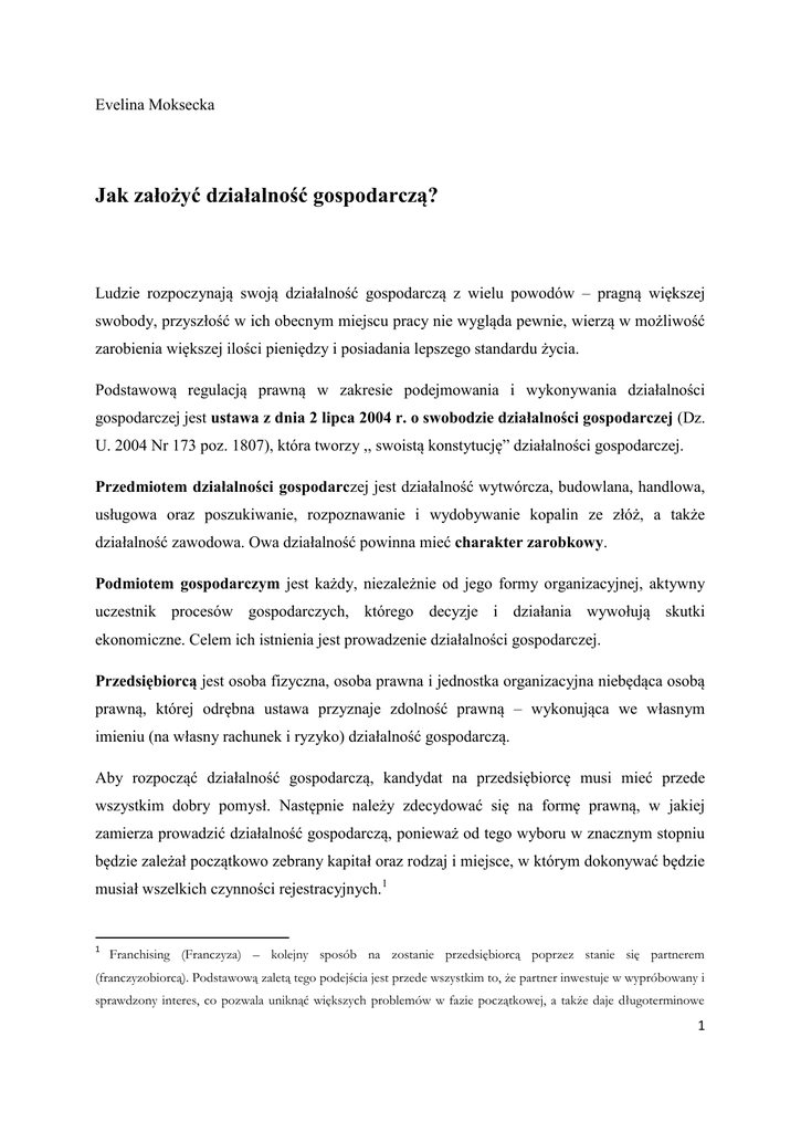 Evelina Moksecka Jak założyć działalność gospodarczą? Ludzie rozpoczynają swoją działalność gospodarczą z wielu powodów – pragną większej swobody, przyszłość w ich obecnym miejscu pracy nie wygląda pewnie, wierzą w możliwość zarobienia większej ilości pieniędzy i posiadania lepszego standardu życia. Podstawową regulacją prawną w zakresie podejmowania i wykonywania działalności gospodarczej jest ustawa z dnia 2 lipca 2004 r. o swobodzie działalności gospodarczej (Dz. U. 2004 Nr 173 poz. 1807), która tworzy ,, swoistą konstytucję” działalności gospodarczej. Przedmiotem działalności gospodarczej jest działalność wytwórcza, budowlana, handlowa, usługowa oraz poszukiwanie, rozpoznawanie i wydobywanie kopalin ze złóż, a także działalność zawodowa. Owa działalność powinna mieć charakter zarobkowy. Podmiotem gospodarczym jest każdy, niezależnie od jego formy organizacyjnej, aktywny uczestnik procesów gospodarczych, którego decyzje i działania wywołują skutki ekonomiczne. Celem ich istnienia jest prowadzenie działalności gospodarczej. Przedsiębiorcą jest osoba fizyczna, osoba prawna i jednostka organizacyjna niebędąca osobą prawną, której odrębna ustawa przyznaje zdolność prawną – wykonująca we własnym imieniu (na własny rachunek i ryzyko) działalność gospodarczą. Aby rozpocząć działalność gospodarczą, kandydat na przedsiębiorcę musi mieć przede wszystkim dobry pomysł. Następnie należy zdecydować się na formę prawną, w jakiej zamierza prowadzić działalność gospodarczą, ponieważ od tego wyboru w znacznym stopniu będzie zależał początkowo zebrany kapitał oraz rodzaj i miejsce, w którym dokonywać będzie musiał wszelkich czynności rejestracyjnych.1 1 Franchising (Franczyza) – kolejny sposób na zostanie przedsiębiorcą poprzez stanie się partnerem (franczyzobiorcą). Podstawową zaletą tego podejścia jest przede wszystkim to, że partner inwestuje w wypróbowany i sprawdzony interes, co pozwala uniknąć większych problemów w fazie początkowej, a także daje długoterminowe 1 Najbardziej popularną formą prowadzenia działalności gospodarczej jest działalność indywidualna, czyli przedsiębiorstwo jednoosobowe. Podjęcie indywidualnej działalności gospodarczej nie wiąże się ze spełnieniem jakichkolwiek wymagań kapitałowych (nie jest określona minimalna wielkość kapitału). Niewątpliwą zaletą tej formy prowadzenia działalności gospodarczej jest również relatywnie łatwe jej rozpoczęcie. Prowadzenie przedsiębiorstwa jednoosobowego w największym stopniu pozwala na samodzielne zarządzanie i ustalenie podziału obowiązków oraz na dokonywanie zmian związanych z profilem działalności czy kapitałem firmy. Zaletą jest również prostota rozliczeń finansowoksięgowych. 1. Jaką formę działalności wybrać? W polskim obrocie prawnym jest kilka możliwych form prowadzenia działalności gospodarczej (niżej tabela nr 1): szanse na sukces. Wadą takiej formy działalności jest z kolei brak możliwości do wykazania inicjatyw jeśli chodzi o produkt, usługę czy projekt oraz wpłacanie regularnych opłat opartych o obrót brutto albo o dochody. 2 Co to są spółki osobowe? Spółki osobowe opierają swoją działalność na osobistej pracy wspólników w przedsiębiorstwie spółki oraz we własnym imieniu mogą nabywać prawa, w tym własność nieruchomości i inne prawa rzeczowe, zaciągać zobowiązania, pozywać i być pozywane. Cechy - brak osobowości prawnej, - wspólnicy reprezentują spółkę (co do zasady, bo np. w spółce partnerskiej może zostać powołany do tego zarząd), - istnieje stała więź między wspólnikami, - wspólnicy muszą być ujawnieni, - wspólnicy wnoszą wkłady, - wspólnicy pracują na rzecz spółki (nie wszyscy mają taki obowiązek, czasem wystarczy wniesienie wkładów w odpowiedniej wysokości), - uproszczona księgowość. Spółka jawna (skrót s.j.) Spółkę jawną prowadzi przedsiębiorstwo pod własną firmą. Nie posiada osobowości prawnej. Może jednak zawierać umowy, pozywać i być pozywana. Posiada swój majątek, który stanowią wkłady wniesione do spółki oraz mienie nabyte przez spółkę w czasie jej istnienia. Zalety: - łatwość założenia i proste procedury prowadzenia (umowa spółki nie wymaga aktu notarialnego); - możliwość korzystania z prostszych, zryczałtowanych form opodatkowania; - zaangażowanie wszystkich wspólników w sprawy spółki; 3 Wady: - pełna, solidarna choć subsydiarna odpowiedzialność wspólników za zobowiązania spółki (wspólnicy odpowiadają w pełni swoim majątkiem za zobowiązania ich przedsiębiorstwa, czyli ze wspólnika ściąga się to, czego nie można zaspokoić z majątku spółki). Ważne - firma spółki jawnej powinna zawierać nazwiska lub firmy (nazwy) wszystkich wspólników albo nazwisko albo firmę (nazwę) jednego albo kilku wspólników oraz dodatkowe oznaczenie "spółka jawna", np. ,,H. Hańko, M. Mańko Spółka jawna”. Firma może zawierać także inne elementy, tzw. dodatki fantazyjne, np. ,,ABC” Hańko Spółka jawna. Spółka partnerska (skrót s.p.) Spółkę parnerską tworzą wspólnicy (partnerzy) w celu wykonywania wolnego zawodu w spółce prowadzącej przedsiębiorstwo pod własną firmą. Wobec czego niedopuszczalne jest tworzenie spółek partnerskich w innym celu niż wykonywanie wolnego zawodu, a także w celu wykonywania jakiejś działalności gospodarczej, np. produkcyjnej czy handlowej, obok wykonywania wolnego zawodu, a także wykonywania więcej niż jednego zawodu. Zalety - odpowiedzialność wspólników jest ograniczona tzn. partner nie odpowiada za zobowiązania spółki wynikające z działalności innych partnerów, - możliwość złączenia pomysłów i kapitału wielu osób. Wady - ograniczone grono beneficjentów tej formy prawnej (partnerzy mogą wykonywać tylko i wyłącznie wspóln