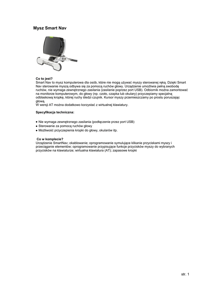 Mysz Smart Nav Co to jest? Smart Nav to mysz komputerowa dla osób, które nie mogą używać myszy sterowanej ręką. Dzięki Smart Nav sterowanie myszą odbywa się za pomocą ruchów głowy. Urządzenie umożliwia pełną swobodę ruchów, nie wymaga zewnętrznego zasilania (zasilanie poprzez port USB). Odbiornik można zamontować na monitorze komputerowym, do głowy (np. czoło, czapka lub okulary) przyczepiamy specjalną odblaskową kropkę, której ruchy śledzi czujnik. Kursor myszy przemieszczamy po prostu poruszając głową. W wersji AT można dodatkowo korzystać z wirtualnej klawiatury. Specyfikacja techniczna: Nie wymaga zewnętrznego zasilania (podłączenie przez port USB) Sterowanie za pomocą ruchów głowy Możliwość przyczepienia kropki do głowy, okularów itp. Co w komplecie? Urządzenie SmartNav; okablowanie; oprogramowanie symulujące klikanie przyciskami myszy i przeciąganie elementów; oprogramowanie przypisujące funkcje przycisków myszy do wybranych przycisków na klawiaturze; wirtualna klawiatura (AT); zapasowe kropki str. 1