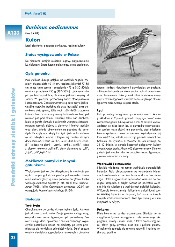 Ptaki (cz´Êç II) Burhinus oedicnemus A133 (L., 1758) Kulon Rzàd: siewkowe, podrzàd: siewkowce, rodzina: kulony Status wyst´powania w Polsce Do niedawna skrajnie nielicznie l´gowy, przypuszczalnie ju˝ niel´gowy. Sporadycznie pojawiajàcy si´ na przelotach. Poradniki ochrony siedlisk i gatunków Opis gatunku Ptak wielkoÊci du˝ego go∏´bia, na wysokich nogach. Wymiary: d∏ugoÊç cia∏a 40–44 cm, rozpi´toÊç skrzyde∏ 77–85 cm, masa cia∏a samca – przeci´tnie 475 g (430–520g); samicy – przeci´tnie 450 g (290–535g). Upierzenie obu p∏ci jest bardzo podobne, ale samiec jest nieco wi´kszy od samicy. W upierzeniu przewa˝ajà barwy p∏owopiaskowa i szarobràzowa. Charakterystyczne sà du˝e oczy z jaskrawo˝ó∏tà t´czówkà (podobne do oczu jastrz´bia) oraz stosunkowo du˝a g∏owa, ˝ó∏te nogi i ˝ó∏ty dziób z czarnym koƒcem. Nad oczami znajduje si´ bia∏awa brew; bia∏y jest równie˝ pas pod okiem, widoczny tak˝e nad dziobem, bia∏e sà gard∏o i brzuch. Na skrzydle wyst´puje charakterystyczny rysunek z∏o˝ony z ciemnych i bia∏ych pasków oraz plam. M∏ode ubarwieniem sà podobne do doros∏ych. Ze wzgl´du na skryty tryb ˝ycia jest rzadko widywany na odkrytym terenie. Odzywa si´ bardzo ró˝nymi dêwi´kami, np. w locie „kur-lii”, „k-lii”, „kira-∏i” czy „czurrrii”, siedzàc na ziemi – „czrr∏i... czh∏ik... czh∏ik”, jeden z g∏osów tokowych „tuii-tuii”, g∏osy alarmowe to „ulii”, „kljui”, „klii”„kryiik” itd. Mo˝liwoÊç pomy∏ki z innymi gatunkami Wyglàd ptaka jest tak charakterystyczny, ˝e mo˝liwoÊç pomy∏ki z innymi gatunkami ptaków jest niewielka. Natomiast niektóre g∏osy sà nieco podobne do g∏osów kulika wielkiego Numenius arquata (A160), czapli siwej Ardea cinerea (A028), lelka Caprimulgus europaeus (A224) czy ostrygojada Haematopus ostralegus (A130). Biologia Tryb ˝ycia Charakteryzuje si´ bardzo skrytym trybem ˝ycia. Aktywny jest od zmierzchu do Êwitu. ˚eruje g∏ównie w ciàgu nocy, ale pod koniec sezonu l´gowego cz´sto jest aktywny równie˝ w ciàgu dnia. Sp∏oszony z miejsca dziennego wypoczynku poczàtkowo ucieka na piechot´, po czym przemieszcza si´ na wi´ksze odleg∏oÊci w locie. Dzieƒ sp´dza ukryty w niewielkich zag∏´bieniach na rozleg∏ym otwartym 22 terenie, siedzàc nieruchomo i przywierajàc do pod∏o˝a, z którym doskonale si´ zlewa swoim ma∏o skontrastowanym ubarwieniem. Jako gatunek silnie terytorialny wyst´puje w okresie l´gowym w rozproszeniu, a tylko po okresie l´gowym mo˝e tworzyç wi´ksze stada. L´gi Ptaki przylatujà na l´gowiska ju˝ w koƒcu marca. W maju sk∏adane sà 2 jaja do gniazda majàcego postaç lekko zaznaczonej jamki lub wprost na ziemi. W sezonie wyprowadzany jest tylko jeden l´g. W przypadku utraty zniesienia samica mo˝e z∏o˝yç jaja ponownie, stàd zniesienia kulona spotykano nawet w czerwcu. Wysiadywanie jaj trwa 24–27 dni; m∏ode opuszczajà gniazdo nieomal natychmiast po wykluciu, a zdolnoÊç do lotu uzyskujà po 36–42 dniach. W okresie koczowaƒ pol´gowych kulony mogà tworzyç stada. AktywnoÊç g∏osowa samców (fletowe gwizdy) jest wysoka tylko na poczàtku sezonu l´gowego, g∏ównie wieczorem i w nocy. W´drówki i zimowanie Niewiele wiadomo na temat w´drówek europejskich kulonów. Ptaki obràczkowane we wschodnich Niemczech w´drowa∏y w kierunku basenu Morza Âródziemnego. Odlot z l´gowisk nast´powa∏ od wrzeÊnia do poczàtku listopada, a przylot wiosnà na poczàtku kwietnia. Nic nie wiadomo o w´drówkach polskich kulonów. W Europie kulony zimujà nielicznie w po∏udniowej cz´Êci Wielkiej Brytanii i w Hiszpanii, byç mo˝e i w innych krajach Êródziemnomorskich. Poza tym zimujà w wielu miejscach w Afryce. Pokarm Dieta kulona jest bardzo urozmaicona. Sk∏adajà si´ na nià g∏ównie làdowe bezkr´gowce: d˝d˝ownice, mi´czaki, paj´czaki, owady – ma∏e i du˝e, a tak˝e drobne kr´gowce: p∏azy, gady, gryzonie oraz jaja i piskl´ta ptaków. W pokarmie zdarzajà si´ równie˝ korzonki i nasiona roÊlin oraz padlina. Tytu∏ rozdzia∏u Tytu∏ rozdzia∏u Burhinus Tytu∏ oedicnemus rozdzia∏u (Kulon) Tytu∏ Wyst´powanie Siedlisko Zasiedla ró˝ne typy suchych i otwartych siedlisk: wydmy, ekstensywne pastwiska na mineralnym pod∏o˝u, piaszczyste wyspy w korytach du˝ych rzek, piaszczyste nadrzeczne pla˝e i murawy, du˝e ˝wirownie, kamienio∏omy, poeksploatacyjne wyrobiska, ha∏dy, lotniska. Na przelotach spotykany nawet na polach, np. w uprawach ziemniaka. W Alzacji lokalna populacja zaadaptowa∏a si´ do gniazdowania w uprawach kukurydzy, rzepaku i okopowych. Natomiast w Anglii wyst´puje od lat stabilna populacja na wrzosowiskach. Rozmieszczenie geograficzne Opisano co najmniej 6 podgatunków. Wi´kszoÊç Europy – od po∏udniowej cz´Êci Wysp Brytyjskich, poprzez Francj´ i pó∏wysep Iberyjski, na wschodzie do Kaukazu – zamieszkuje podgatunek B. o. oedicnemus. Wyspy Morza Âródziemnego, Grecj´, Turcj´ i pó∏nocnà Afryk´ zasiedla B. o. saharae. Na Wyspach Kanaryjskich wyst´pujà dwa inne podgatunki. Jeszcze inny podgatunek zamieszkuje po∏udniowo-wschodnià Rosj´, a 6. podgatunek zasiedla Indie, Sri Lank´ i Indochiny. Populacje z Hiszpanii, Afryki, Indii i po∏udniowo-wschodniej Azji sà osiad∏e, ewentualnie przemieszczajà si´ na nieznaczne odleg∏oÊci. G∏ówne zimowiska kulona znajdujà si´ w Hiszpanii, pó∏nocnej Afryce, na Pó∏wyspie Indyjskim i Pó∏wyspie Indochiƒskim. S∏abo zbadany jest zasi´g zimowisk na po∏udnie od Sahary, zw∏aszcza w zachodniej cz´Êci Sahelu. Na wschodzie Afryki zimowiska kulona dochodzà do Kenii. Rozmieszczenie w Polsce Przypuszczalnie ca∏kowite wygaÊni´cie populacji l´gowej nastàpi∏o na poczàtku XXI w. Status ochronny Ochrona gatunkowa w Polsce: gatunek obj´ty ochronà Êcis∏à, wymagajàcy ochrony czynnej (Dz U z 2004 r. Nr 220, poz. 2237) Pol