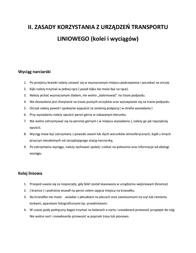 II. ZASADY KORZYSTANIA Z URZĄDZEŃ TRANSPORTU LINIOWEGO (kolei i wyciągów) Wyciąg narciarski 1. Po przejściu bramki należy ustawić się w wyznaczonym miejscu podczepienia i poczekać na orczyk. 2. Kijki należy trzymać w jednej ręce ( pasek kijka nie może być na ręce). 3. Należy jechać wyznaczonym śladem, nie wolno „slalomować” na trasie podjazdu. 4. Nie dozwolone jest chwytanie na trasie pustych orczyków oraz wyczepianie się na trasie podjazdu. 5. Orczyk należy powoli i spokojnie wypuścić za ostatnią podporą ( w strefie wysiadania ) 6. Przy wysiadaniu należy opuścić peron górny w nakazanym kierunku. 7. Nie wolno zatrzymywać się na peronie górnym ( w miejscu wysiadania ), należy go jak najszybciej opuścić. 8. Wyciąg może być zatrzymany z powodu awarii lub złych warunków atmosferycznych, bądź z innych przyczyn niezależnych od zarządzającego stacją narciarską. 9. Po zatrzymaniu wyciągu, należy zachować spokój i czekać na polecenia oraz informacje od obsługi wyciągu. Kolej liniowa 1. Przejazd uważa się za rozpoczęty, gdy bilet został skasowany w urządzeniu wejściowym (bramce) 2. ( bramce ) i podróżny wszedł na peron celem zajęcia miejsca na krzesełku. 3. Na krzesełko nie może wsiadać z plecakiem na plecach oraz zawieszonymi na szyi lub ramieniu torbami, aparatami fotograficznymi itp. przedmiotami. 4. W czasie jazdy podręczny bagaż trzymać na kolanach a narty i snowboard przewozić przypięte do nóg. Nie wolno nart i snowboardu przewozić w poprzek trasy lub pionowo. 5. Pasażer posiadający ważny bilet na przejazd ma prawo: a) przejazdu koleją w relacji zgodnej z wykupionym biletem b) bezpłatnego przewozu bagażu ręcznego o masie 10 kg, przewozu sprzętu turystycznego lub sportowego ( 1 para nart, 1 snowboard lub jeden rower ) c) możliwość wejścia na peron sygnalizowana jest sygnałem świetlnym zielonym oraz otwarciem bramki, wejście winno nastąpić niezwłocznie po sygnale zielonym, zabrania się wejścia na peron po włączeniu się sygnału świetlnego czerwonego, d) po wyjeździe na peron górny, należy natychmiast oddalić się od peronu, aby nie utrudniać ruchu następnym narciarzom oraz w przypadku wyciągu talerzykowego aby nie być narażonym na uderzenie następnym zwolnionym zaczepem, e) do wjazdu poza kolejnością uprawnieni są: obsługa wyciągu , ratownicy , instruktorzy po uprzednim uzgodnieniu z właścicielem. 7. Pasażer jest zobowiązany: a) sprawdzić czy otrzymał właściwy bilet b) zachować bilet w czasie przewozu aż do opuszczenia kolei, okazywać go na żądanie personelu c) stosować się do przepisów porządkowych i poleceń obsługi kolei d) w czasie jazdy nie wolno kołysać krzesłem, wychylać się, stać na krzesełku oraz próbować zaczepiać rękami lub innymi przedmiotami o podpory kolei. 8. Podróżny, mimo posiadania ważnego biletu, nie możę żądać przewozu jeśli jest on niemożliwy z powodu warunków atmosferycznych lub w przerwach między planowymi jazdami względnie jeśli praca kolei jest niemożliwa z innych względów. 9. Przewóz większego bagażu ręcznego lub dodatkowego sprzętu sportowego i turystycznego jest dopuszczalny na osobowym krzesełku za uiszczeniem dodatkowej opłaty w kasie. 10. Dzieci o wzroście poniżej 1,25 m mogą być przewożone na krzesłach tylko w towarzystwie osoby dorosłej. Osoba towarzysząca musi być w stanie i w gotowości do udzielenia jadącemu dziecku koniecznej pomocy. 11. Dzieci siadają na skrajnych siedziskach krzesełka.