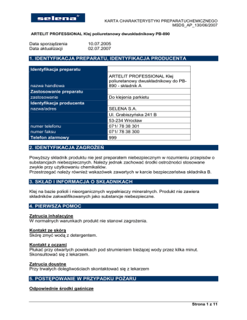 KARTA CHARAKTERYSTYKI PREPARATUCHEMICZNEGO MSDS_AP_130/06/2007 ARTELIT PROFESSIONAL Klej poliuretanowy dwuskładnikowy PB-890 Data sporządzenia Data aktualizacji 10.07.2005 02.07.2007 1. IDENTYFIKACJA PREPARATU, IDENTYFIKACJA PRODUCENTA Identyfikacja preparatu nazwa handlowa Zastosowanie preparatu zastosowanie Identyfikacja producenta nazwa/adres numer telefonu numer faksu Telefon alarmowy ARTELIT PROFESSIONAL Klej poliuretanowy dwuskładnikowy do PB890 - składnik A Do klejenia parkietu SELENA S.A. Ul. Grabiszyńska 241 B 53-234 Wrocław 071/ 78 38 301 071/ 78 38 300 999 2. IDENTYFIKACJA ZAGROśEŃ PowyŜszy składnik produktu nie jest preparatem niebezpiecznym w rozumieniu przepisów o substancjach niebezpiecznych. NaleŜy jednak zachować środki ostroŜności stosowane zwykle przy uŜytkowaniu chemikaliów. Przestrzegać naleŜy równieŜ wskazówek zawartych w karcie bezpieczeństwa składnika B. 3. SKŁAD I INFORMACJA O SKŁADNIKACH Klej na bazie polioli i nieorganicznych wypełniaczy mineralnych. Produkt nie zawiera składników zakwalifikowanych jako substancje niebezpieczne. 4. PIERWSZA POMOC Zatrucia inhalacyjne W normalnych warunkach produkt nie stanowi zagroŜenia. Kontakt ze skórą Skórę zmyć wodą z detergentem. Kontakt z oczami Płukać przy otwartych powiekach pod strumieniem bieŜącej wody przez kilka minut. Skonsultować się z lekarzem. Zatrucia doustne Przy trwałych dolegliwościach skontaktować się z lekarzem 5. POSTĘPOWANIE W PRZYPADKU POśARU Odpowiednie środki gaśnicze Strona 1 z 11 KARTA CHARAKTERYSTYKI PREPARATUCHEMICZNEGO MSDS_AP_130/06/2007 ARTELIT PROFESSIONAL Klej poliuretanowy dwuskładnikowy PB-890 Dwutlenek węgla, proszek gaśniczy lub mgła wodna. Większy poŜar zwalczać strumieniem wody lub pianą odporną na działanie alkoholu. Środki gaśnicze, których nie wolno uŜywać ze względów bezpieczeństwa Woda pełnym strumieniem. Środki ochrony indywidualnej W przypadku poŜaru kleju naleŜy uŜywać aparatów tlenowych. 6. POSTĘPOWANIE W PRZYPADKU NIEZAMIERZONEGO UWOLNIENIA DO ŚRODOWISKA Rozlaną substancję naleŜy usunąć mechanicznie, resztki zebrać za pomocą materiału wiąŜącego (np. piasek, trociny) i usunąć zgodnie z przepisami dotyczącymi usuwania odpadów. NaleŜy zapobiec przedostaniu się substancji do wód. 7. POSTĘPOWANIE Z PREPARATEM I JEGO MAGAZYNOWANIE Obchodzenie się z substancją Podczas pracy naleŜy nosić odpowiednie ubranie ochronne, rękawice i okulary ochronne. Zapewnić dostateczną wentylacje pomieszczeń. Magazynowanie Szczelnie zamknięte pojemniki przechowywać w suchym miejscu. Przechowywać w pomieszczeniach zamkniętych, oznakowanych. 8. KONTROLA NARAśENIA I ŚRODKI OCHRONY INDYWIDUALNEJ W przypadkach, w których istnieje prawdopodobieństwo kontaktu ze skórą naleŜy stosować indywidualną odzieŜ ochronną oraz środki ochrony indywidualnej np. rękawice gumowe. Klej w przypadku kontaktu z okiem moŜe wywołać podraŜnienie oka. Wartość NDS, NDSCh, NDSP Nie dotyczy. 9. WŁAŚCIWOŚCI FIZYKOCHEMICZNE postać fizyczna barwa zapach temperatura wrzenia temperatura topnienia pręŜność par gęstość temperatura zapłonu granica wybuchowości temperatura samozapłonu własności korozyjne rozpuszczalność w rozpuszczalnikach: - rozpuszczalność w wodzie - rozpuszczalność w innych rozpuszczalnikach pasta beŜowa słaby o 200 C nie dotyczy o < 1 mbar w temp. 20 C 1,5 ± 0,1 g/cm3 o > 200 C nie dotyczy nie dotyczy brak nierozpuszczalny dobra Strona 2 z 11 KARTA CHARAKTERYSTYKI PREPARATUCHEMICZNEGO MSDS_AP_130/06/2007 ARTELIT PROFESSIONAL Klej poliuretanowy dwuskładnikowy PB-890 (ketony, octany) 10. STABILNOŚĆ I REAKTYWNOŚĆ Rozkład cieplny: nie rozkłada się, jeśli jest stosowany zgodnie z zaleceniem. Niebezpieczne reakcje: nie są znane niebezpieczne reakcje. 11. INFORMACJE TOKSYKOLOGICZNE Drogi naraŜenia Oczy, skóra, przewód pokarmowy Działanie miejscowe (skóra, oczy, błony śluzowe) Oczy: krople cieczy mogą prowadzić do podraŜnień. Skutki zdrowotne naraŜenia ostrego Przy fachowym zastosowaniu nie były stwierdzone Ŝadne uszkodzenia zdrowia. Na podstawie składu produktu nie naleŜy oczekiwać ostrego, ogólnie toksycznego działania. Skutki zdrowotne naraŜenia przewlekłego Brak danych. 12. INFORMACJE EKOLOGICZNE Nie dopuszczać do przedostania się pod ziemię, do wód lub kanału ściekowego. Produkt na podstawie doświadczeń nie działa szkodliwie na środowisko. 13. POSTĘPOWANIE Z ODPADAMI Produkt (Postępowanie zgodne z „Ustawą o odpadach” z dnia 27 kwietnia 2001r. (Dz. U. Nr 62, poz. 628) wraz z późniejszymi zmianami.) Nie moŜe podlegać obróbce wspólnie z odpadkami domowymi. Nie dopuścić do przedostania się do kanalizacji. Opakowania (Postępowanie zgodne z „Ustawą o opakowaniach i odpadach opakowaniowych” z dnia 11 maja 2001r. (Dz. U. Nr 63, poz. 638) wraz z późniejszymi zmianami.) Całkowicie opróŜnione pojemniki metalowe nadają się do utylizacji, pojemniki ze zmieszanymi stwardniałymi pozostałościami - to odpady budowlane; zebrane, płynne pozostałości produktu są odpadami o charakterze szczególnym. Utylizować zgodnie z obowiązującymi przepisami. 14. INFORMACJE O TRANSPORCIE Klasyfikacja i oznakowanie w transporcie Bez ograniczeń. 15. INFORMACJE DOTYCZĄCE PRZEPISÓW PRAWNYCH Strona 3 z 11 KARTA CHARAKTERYSTYKI PREPARATUCHEMICZNEGO MSDS_AP_130/06/2007 ARTELIT PROFESSIONAL Klej poliuretanowy dwuskładnikowy PB-890 Produkt został sklasyfikowany i oznaczony zgodnie z Rozporządzenia Ministra Zdrowia z dn. 02.09.2003r. w sprawie znakowania opakowań substancji niebezpiecznej i preparatów niebezpiecznych (Dz. U. Nr 173, poz. 1679) Produkt nie jest sklasyfikowany jako niebezpieczna substancja chemiczna. Obowiązujące przepisy Ustawa z dnia 11 stycznia 2001r. o substancjach i preparatach chemicznych (Dz.U. Nr 11, poz.84, Dz.U. Nr 100, poz. 1085, Dz.U. Nr 123, poz. 1350 i Dz.U. Nr 125, poz. 1367 oraz z 2002r. Dz.U. Nr 135,