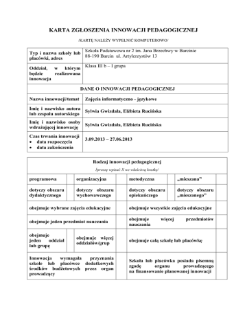 KARTA ZGŁOSZENIA INNOWACJI PEDAGOGICZNEJ /KARTĘ NALEŻY WYPEŁNIĆ KOMPUTEROWO/ Szkoła Podstawowa nr 2 im. Jana Brzechwy w Barcinie Typ i nazwa szkoły lub 88-190 Barcin ul. Artylerzystów 13 placówki, adres Oddział, w którym będzie realizowana innowacja Klasa III b – I grupa DANE O INNOWACJI PEDAGOGICZNEJ Nazwa innowacji/temat Zajęcia informatyczno - językowe Imię i nazwisko autora Sylwia Gwizdała, Elżbieta Rucińska lub zespołu autorskiego Imię i nazwisko osoby Sylwia Gwizdała, Elżbieta Rucińska wdrażającej innowację Czas trwania innowacji data rozpoczęcia data zakończenia 3.09.2013 – 27.06.2013 Rodzaj innowacji pedagogicznej /proszę wpisać X we właściwą kratkę/ programowa organizacyjna metodyczna „mieszana” dotyczy obszaru dydaktycznego dotyczy obszaru wychowawczego dotyczy obszaru opiekuńczego dotyczy obszaru „mieszanego” obejmuje wybrane zajęcia edukacyjne obejmuje wszystkie zajęcia edukacyjne obejmuje jeden przedmiot nauczania obejmuje nauczania obejmuje jeden oddział lub grupę obejmuje całą szkołę lub placówkę obejmuje więcej oddziałów/grup Innowacja wymagała przyznania szkole lub placówce dodatkowych środków budżetowych przez organ prowadzący więcej przedmiotów Szkoła lub placówka posiada pisemną zgodę organu prowadzącego na finansowanie planowanej innowacji OPIS INNOWACJI PEDAGOGICZNEJ 1. Uzasadnienie potrzeby innowacji: 2. Cele innowacji pedagogicznej: 3. Spodziewane efekty: Żyjemy w świecie, w którym znajomość języka obcego oraz obsługa komputera są niezbędne do dobrego funkcjonowania w otaczającym nas środowisku. Innowacja wychodzi naprzeciw potrzebom współczesnego świata oraz globalizacji społeczeństwa. 1. Wzajemna korelacja wiedzy dwóch przedmiotów: języka angielskiego i zajęć komputerowych. 2. Umożliwienie wykorzystania bogatego zasobu oprogramowania edukacyjnego z zakresu nauki języka angielskiego. 3. Rozwijanie umiejętności językowych z zastosowaniem nowoczesnych technik informatycznych. 4. Doskonalenie w posługiwania się komputerem, programami komputerowymi oraz Internetem 5. Rozwijanie zainteresowań dzieci. 6. Zachęcanie do samodzielnego wyszukiwania i znajdowania potrzebnych informacji. 7. Poznawanie kultur innych krajów ( w szczególności Wielkiej Brytanii). 1. Praktyczne użycie języka angielskiego w świecie multimedialnym. 2. Umiejętność wyszukiwania, gromadzenia i analizowania informacji 3. Praktyczne użycie programów komputerowych wspierających proces uczenia się. 4. Wykorzystywanie komputera do poszerzania i pogłębiania wiadomości i umiejętności. 5. Wzbogacenie oferty szkoły . 4. Sposoby ewaluacji: 1. Bieżąca analiza efektów nauczania. 2. Wymiana informacji między nauczycielami realizującymi innowację. 3. Prezentacja wytworów pracy uczniów w postaci: prezentacji multimedialnych, dokumentów tekstowych i graficznych. 4. Udział w projektach edukacyjnych