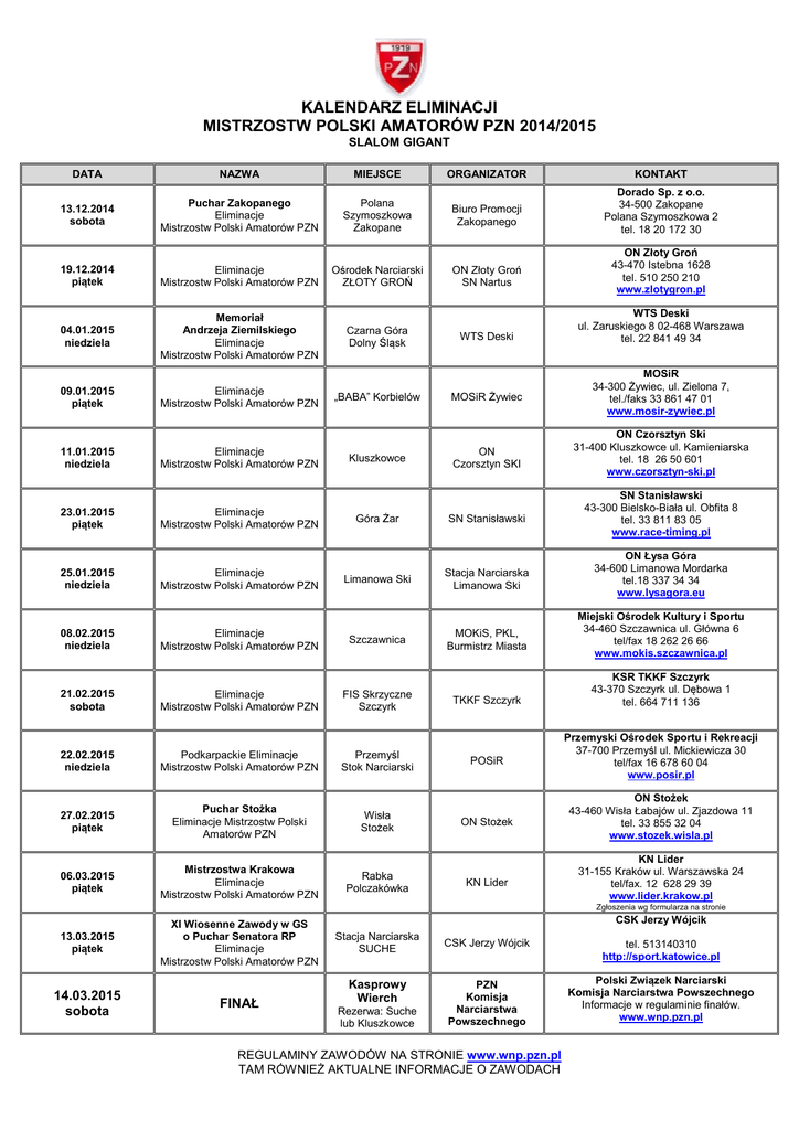 KALENDARZ ELIMINACJI MISTRZOSTW TRZOSTW POLSKI AMATORÓW PZN 2014/2015 2015 SLALOM GIGANT DATA 13.12.2014 sobota NAZWA Puchar Zakopanego Eliminacje Mistrzostw Polski Amatorów PZN MIEJSCE Polana Szymoszkowa Zakopane 19.12.2014 piątek Eliminacje Mistrzostw Polski Amatorów PZN Ośrodek Narciarski ZŁOTY GROŃ 04.01.2015 niedziela Memoriał Andrzeja Ziemilskiego Eliminacje Mistrzostw Polski Amatorów PZN Czarna Góra Dolny Śląsk 09.01.2015 piątek Eliminacje Mistrzostw Polski Amatorów PZN 11.01.2015 niedziela Eliminacje Mistrzostw Polski Amatorów PZN 23.01.2015 piątek Eliminacje Mistrzostw Polski Amatorów PZN 25.01.2015 niedziela Eliminacje Mistrzostw Polski Amatorów PZN 08.02.2015 niedziela Eliminacje Mistrzostw Polski Amatorów PZN ORGANIZATOR KONTAKT Biuro Promocji Zakopanego Dorado Sp. z o.o. 34-500 Zakopane Polana Szymoszkowa 2 tel. 18 20 172 30 ON Złoty Groń SN Nartus ON Złoty Groń 43-470 Istebna 1628 tel. 510 250 210 www.zlotygron.pl WTS Deski WTS Deski ul. Zaruskiego 8 02-468 Warszawa tel. 22 841 49 34 „BABA” Korbielów MOSiR Żywiec MOSiR 34-300 Żywiec, ul. Zielona 7, tel./faks 33 861 47 01 www.mosir-zywiec.pl Kluszkowce ON Czorsztyn SKI ON Czorsztyn Ski 31 31-400 Kluszkowce ul. Kamieniarska tel. 18 26 50 601 www.czorsztyn-ski.pl Góra Żar SN Stanisławski SN Stanisławski 43-300 Bielsko-Biała ul. Obfita 8 tel. 33 811 83 05 www.race-timing.pl Limanowa Ski Stacja Narciarska Limanowa Ski ON Łysa Góra 34-600 Limanowa Mordarka tel.18 337 34 34 www.lysagora.eu Szczawnica MOKiS, PKL, Burmistrz Miasta Miejski Ośrodek Kultury i Sportu 34-460 Szczawnica ul. Główna 6 tel/fax 18 262 26 66 www.mokis.szczawnica.pl 21.02.2015 sobota Eliminacje Mistrzostw Polski Amatorów PZN FIS Skrzyczne Szczyrk 22.02.2015 niedziela Podkarpackie Eliminacje Mistrzostw Polski Amatorów PZN Przemyśl Stok Narciarski 27.02.2015 piątek Puchar Stożka Eliminacje Mistrzostw Polski Amatorów PZN Wisła Stożek 06.03.2015 piątek Mistrzostwa Krakowa Eliminacje Mistrzostw Polski Amatorów PZN Rabka Polczakówka 13.03.2015 piątek XI Wiosenne Zawody w GS o Puchar Senatora RP Eliminacje Mistrzostw Polski Amatorów PZN TKKF Szczyrk KSR TKKF Szczyrk 43-370 Szczyrk ul. Dębowa 1 tel. 664 711 136 POSiR Przemyski Ośrodek Oś Sportu i Rekreacji 37 37-700 Przemyśl ul. Mickiewicza 30 tel/fax 16 678 60 04 www.posir.pl ON Stożek ON Stożek 43 43-460 Wisła Łabajów ul. Zjazdowa 11 tel. 33 855 32 04 www.stozek.wisla.pl KN Lider KN Lider 31-155 Kraków ul. Warszawska 24 tel/fax. 12 628 29 39 www.lider.krakow.pl Zgłoszenia wg formularza na stronie 14.03.2015 sobota FINAŁ CSK Jerzy Wójcik Stacja Narciarska SUCHE Kasprowy Wierch Rezerwa: Suche lub Kluszkowce CSK Jerzy Wójcik tel. 513140310 http://sport.katowice.pl PZN Komisja Narciarstwa Powszechnego Polski Związek Narciarski Komisja Narciarstwa Powszechnego Informacje w regulaminie finałów. www.wnp.pzn.pl REGULAMINY ZAWODÓW NA STRONIE www.wnp.pzn.pl TAM RÓWNIEŻ AKTUALNE INFORMACJE O ZAWODACH