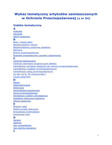 Wykaz tematyczny artykułów zamieszczonych w Ochronie Przeciwpożarowej (z nr 54) Indeks tematyczny A Acetylen Aerozole Alarm pożarowy B Bazy i stacje paliw Bezpieczeństwo mienia Bezpieczeństwo pożarowe obiektów Biomasy Bramy przeciwpożarowe Budowle pneumatyczne (powłoki ciśnieniowe) C Centrale dedykowane Centrum alarmowo-dyspozycyjne obiektu Certyfikacja wyrobów służących do ochrony przeciwpożarowej Certyfikacja urządzeń przeciwpożarowych Certyfikacja usług przeciwpożarowych Co Pan na to, Mr Fireconcrete ? Czujki pożarowe D Dachy Dekontaminacja Detonacja Dochodzenia popożarowe Drzwi przeciwpożarowe Dźwiękowy system ostrzegawczy Działania ratowniczo-gaśnicze Dźwigi pożarowe E Ekspert radzi Elektryczność statyczna Energetyka przemysłowa Ewakuacja ludzi G Garaże Gaśnice Gaz wysypiskowy Gaz ziemny skroplony I 1 Inertyzacja w zapobieganiu pożarom Instalacja wodociągowa przeciwpożarowa Instrukcja bezpieczeństwa pożarowego Integracja urządzeń przeciwpożarowych Inżynieria w ochronie przeciwpożarowej K Kable i przewody elektryczne Klapy przeciwpożarowe (odcinające i wentylacji pożarowej) Klasyfikacja ogniowa Klapy dymowe Kurtyny dymowe M Magazynowanie materiałów niebezpiecznych Malarnie, lakiernie Materiały włókiennicze Mgła wodna (urządzenia gaśnicze) Monitoring pożarowy N Niebezpieczne materiały i preparaty Niepełnosprawność Normalizacja Normy zagraniczne Normy polskie O Obiekty widowiskowe Ochrona odgromowa Ochrona przeciwpożarowa na lotniskach Ochrona przeciwpożarowa w innych krajach Oddzielenia przeciwpożarowe Odporność ogniowa Oświetlenie awaryjne P Pirotechnika widowiskowa Płyty ognioodporne Pomieszczenia wielkoprzestrzenne Pożar Pożary w magazynach pestycydów (zagrożenia) Pożary w obiektach ZL Pożary w obiektach PM Poważne awarie przemysłowe Procesy inwestycyjne Przepisy przeciwpożarowe Przepusty instalacyjne 2 R Rozprzestrzenianie ognia Rozwiązania zamienne w ochronie przeciwpożarowej S Scenariusz pożarowy Serwerownie Sieć wodociągowa przeciwpożarowa Socjotechniczne aspekty prewencji SITP Standardy SITP Stacje tankowania pojazdów sprężonym gazem ziemnym Stacje tankowania wodorem Stadiony Symulacje komputerowe System obrony przeciwpożarowej Strażak Systemy otwierania wyjść System bezpieczeństwa obiektu System sygnalizacji pożaru Szczeliny dylatacyjne (zabezpieczenie) Szkło ogniochronne Ś Środki gaśnicze T Techniczne środki ochrony przeciwpożarowej Tlen (stosowanie) Toksyczność produktów spalania Transport materiałów niebezpiecznych Tunele U Ubezpieczenia obiektów Urządzenia i instalacje elektroenergetyczne Urządzenia gaśnicze aerozolowe Urządzenia gaśnicze gazowe Urządzenia gaśnicze pianowe Urządzenia przeciwpożarowe Urządzenia tryskaczowe W Warunki techniczne dla budynków (i Prawo budowlane) Wentylacja nadciśnieniowa w klatkach schodowych Wentylacja pożarowa Wentylacja ogólna i miejscowa Węgiel kamienny Witryna czytelników Z Zabezpieczenia ogniochronne 3 Zabezpieczenie przeciwpożarowe lasów Zagrożenie wybuchem Zapłon od telefonu komórkowego Znaki bezpieczeństwa Zrzeszenie Inżynierów Pożarnictwa IFE Wykaz artykułów Acetylen A acetylen - zagrożenia i postępowanie ratownicze (cz. 2) nr 1/15 acetylen – zagrożenia i postępowanie ratownicze (cz. 1) nr 4/14 Aerozole zagrożenia pożarowo-wybuchowe stwarzane przez aerozole nr 4/10 Alarm pożarowy przyczyny fałszywych alarmów pożarowych nr 4/07 Bazy i stacje paliw B warunki zamienne ochrony przeciwpożarowej baz ropy i produktów naftowych oraz stacji paliw płynnych nr 3/07 bezpieczeństwo pożarowe baz paliw nr 1/06 zmiany w przepisach dotyczących bezpieczeństwa pożarowego i wybuchowego baz i stacji paliw nr 1/06 kryteria sprawdzenia prawidłowości doboru przerywacza płomienia lub zaworu oddechowego z przerywaczem płomienia dla gazów lub cieczy tworzących atmosfery wybuchowe nr 3/05 bezpieczeństwo pożarowe stacji paliw nr 3/05 pożary dużych obiektów z cieczami palnymi nr 2/04 wymagania ochrony przeciwpożarowej dla obiektów, w których stosowane są ciecze palne nr 4/03 zastosowanie dielektrycznych powłok ochronnych w zbiornikach na produkty naftowe nr 1/03 Bezpieczeństwo mienia budynki przemysłowe bez ubezpieczenia nr 2/13 wymagania przepisów a bezpieczeństwo mienia nr 3/05 Bezpieczeństwo pożarowe obiektów pożary w budynkach mieszkalnych - czy naprawdę jesteśmy bezpieczni? (wnioski z ćwiczeń) nr 4/15 4 pożary sadzy w kominach nr 3/15 zmiana trendów w budownictwie jednorodzinnym. Dlaczego budujemy niebezpieczne pożarowo budynki? nr 3/15 wymagania dla zasilania urządzeń nr 2/15 zabezpieczenie przed zadymieniem auli Politechniki Warszawskiej nr 2/15 co dalej z ochroną przeciwpożarową ? nr 4/14 znaczenie określenia celu oddymiania obiektu nr 2/14 strefy zagrożenia wybuchem dla instalacji gazu ziemnego nr 2/14 ciągłość zasilania urządzeń przeciwpożarowych nr 1/14 efektywność energetyczna budynków - skutki zwiększania wymagań nr 4/13 budynki przemysłowe bez ubezpieczenia nr 2/13 błędy w projektach, wykonawstwie i eksploatacji urządzeń przeciwpożarowych nr 1/13 zachowanie konstrukcji w warunkach pożaru nr 1/13 instrukcja bezpieczeństwa pożarowego a scenariusz pożarowy nr 4/12 wymagania dla systemów zasilania instalacji bezpieczeństwa w obiektach budowlanych nr 3/12 stan techniczny urządzeń przeciwpożarowych, a poziom ochrony obiektów budowlanych nr 3/12 ochrona zewnętrzna budynków za pomocą tryskaczy nr 2/12 bezpieczeństwo pożarowe w obiektach wielkokubaturowych: magazyny nr 2/12 interaktywna modułowa platforma oceny zagrożenia pożarowego budynków nr 1/12 ocieplać? Tak, ale bezpiecznie nr 3/11 próby odbiorowe z użyciem gorącego dymu nr 2/10 zasady nadzoru nad stanem technicznym urządzeń przeciwpożarowych nr 4/09 bezpieczeństwo pożarowe ociepleń ścian zewnętrznych 4/09 bezpieczeństwo pożarowe hoteli; nowelizacja rekomendacji 86/