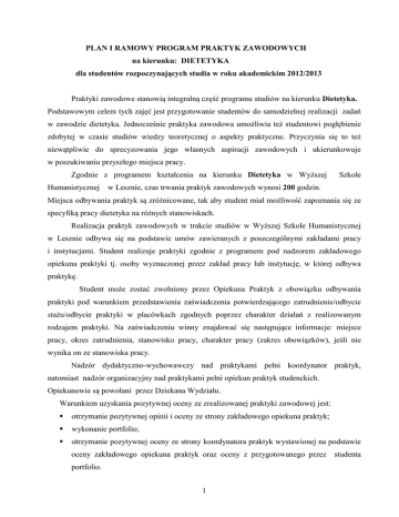 PLAN I RAMOWY PROGRAM PRAKTYK ZAWODOWYCH na kierunku: DIETETYKA dla studentów rozpoczynających studia w roku akademickim 2012/2013 Praktyki zawodowe stanowią integralną część programu studiów na kierunku Dietetyka. Podstawowym celem tych zajęć jest przygotowanie studentów do samodzielnej realizacji zadań w zawodzie dietetyka. Jednocześnie praktyka zawodowa umożliwia też studentowi pogłębienie zdobytej w czasie studiów wiedzy teoretycznej o aspekty praktyczne. Przyczynia się to też niewątpliwie do sprecyzowania jego własnych aspiracji zawodowych i ukierunkowuje w poszukiwaniu przyszłego miejsca pracy. Zgodnie z programem kształcenia na kierunku Dietetyka w Wyższej Humanistycznej Szkole w Lesznie, czas trwania praktyk zawodowych wynosi 200 godzin. Miejsca odbywania praktyk są zróżnicowane, tak aby student miał możliwość zapoznania się ze specyfiką pracy dietetyka na różnych stanowiskach. Realizacja praktyk zawodowych w trakcie studiów w Wyższej Szkole Humanistycznej w Lesznie odbywa się na podstawie umów zawieranych z poszczególnymi zakładami pracy i instytucjami. Student realizuje praktyki zgodnie z programem pod nadzorem zakładowego opiekuna praktyki tj. osoby wyznaczonej przez zakład pracy lub instytucję, w której odbywa praktykę. Student może zostać zwolniony przez Opiekuna Praktyk z obowiązku odbywania praktyki pod warunkiem przedstawienia zaświadczenia potwierdzającego zatrudnienie/odbycie stażu/odbycie praktyki w placówkach zgodnych poprzez charakter działań z realizowanym rodzajem praktyki. Na zaświadczeniu winny znajdować się następujące informacje: miejsce pracy, okres zatrudnienia, stanowisko pracy, charakter pracy (zakres obowiązków), jeśli nie wynika on ze stanowiska pracy. Nadzór dydaktyczno-wychowawczy nad praktykami pełni koordynator praktyk, natomiast nadzór organizacyjny nad praktykami pełni opiekun praktyk studenckich. Opiekunowie są powołani przez Dziekana Wydziału. Warunkiem uzyskania pozytywnej oceny ze zrealizowanej praktyki zawodowej jest: otrzymanie pozytywnej opinii i oceny ze strony zakładowego opiekuna praktyk; wykonanie portfolio; otrzymanie pozytywnej oceny ze strony koordynatora praktyk wystawionej na podstawie oceny zakładowego opiekuna praktyk oraz oceny z przygotowanego przez studenta portfolio. 1 W trakcie odbywania praktyki przewidziane są wizytacje kontrolne przeprowadzane przez koordynatora praktyk lub opiekuna praktyk studenckich z ramienia Wyższej Szkoły Humanistycznej w Lesznie. Zgodnie z programem kształcenia, na kierunku Dietetyka w Wyższej Szkole Humanistycznej w Lesznie obowiązuje następujący plan i program praktyk zawodowych: I. Wstępna praktyka w szpitalu (po pierwszym roku studiów): 1. Informacje ogólne: - czas trwania: 25 godz. - realizacja: II /III semestr - zaliczenie: IV semestr - miejsce odbywania: blok żywieniowy szpitala lub domu pomocy społecznej 2. Cel praktyki: Zapoznanie studenta z organizacją i funkcjonowaniem bloku żywienia w szpitalu, oraz z zadaniami dietetyka uczestniczącego w realizacji prawidłowego żywienia pacjentów. Zdobycie podstawowych praktycznych umiejętności wykonywania posiłków dla pacjentów. 3. Program (tematyka) praktyki obejmuje: - poznanie struktury organizacyjnej szpitala, działu żywienia, zapoznanie się z regulaminem szpitala lub domu pomocy społecznej - zasady organizacji pracy oraz wyposażenie techniczne bloku żywieniowego, zasady bhp - wdrażanie w codziennej pracy zasad bezpieczeństwa żywności i wymagań sanitarnohigienicznych zgodnie z obowiązującymi regulacjami prawnymi, zapoznanie się z zakładowymi dokumentami GHP i GMP - zasady przygotowywania posiłków dla poszczególnych grup pacjentów - współudział w przygotowaniu jadłospisów dla pacjentów - współudział w przygotowaniu, porcjowaniu i dystrybucji posiłków - ocenę jakości żywności oraz przydatności do spożycia różnych surowców i produktów żywnościowych - racjonalną gospodarkę magazynową w magazynie żywności - zapoznanie się z rolą i zadaniami dietetyka w szpitalu lub w domu pomocy społecznej oraz ze współpracą dietetyka z zespołem lekarskim 4. Zadanie do wykonania: Opracowanie sprawozdania z praktyki wraz z wykonaniem PORTFOLIA. 2 Portfoliem będą dołączone załączniki, którymi mogą być: np. schemat struktury organizacyjnej placówki oraz działu żywienia, opis wyposażenia technicznego bloku żywieniowego, charakterystyka zakładowych systemów GHP i GMP, jadłospisy, w których tworzeniu student współuczestniczył, przykładowe dokumenty oceny jakości żywności oraz gospodarki magazynowej, opis roli i zadań dietetyka w szpitalu lub domu pomocy społecznej II. Praktyka z technologii potraw: 1. Informacje ogólne: - czas trwania: 25 godz. - realizacja: II/III semestr - zaliczenie: IV semestr - miejsce odbywania: kuchnie w zakładach żywienia zbiorowego zamkniętego (szpitale, domy pomocy społecznej, zakłady opiekuńczo-wychowawcze, szkoły, internaty, przedszkola itp.) oraz żywienia zbiorowego otwartego (stołówki, jadłodajnie, restauracje itp.) 2. Cel praktyki: zapoznanie studenta z różnymi technologiami przygotowania potraw, zdobycie praktycznych umiejętności w zakresie przygotowywania posiłków zgodnie z zasadami prawidłowego żywienia. 3. Program (tematyka) praktyki obejmuje: - poznanie struktury organizacyjnej i specyfiki działalności danego zakładu żywienia zbiorowego; - zapoznanie się z organizacją pracy kuchni oraz z funkcjonalnością pomieszczeń, usytuowaniem poszczególnych stanowisk, wyposażeniem w sprzęt, zasadami bhp ; - ocenę warunków sanitarno-higienicznych w zakładzie oraz ocenę przygotowania zakładu do prowadzonej działalności; - poznanie funkcjonowania zakładowych systemów GMP, GHP oraz HACCP - organizację pracy w magazynie żywności, ocenę funkcjonalności magazynu oraz gospodarki magazynowej - zasady przechowywania surowców, półproduktów 