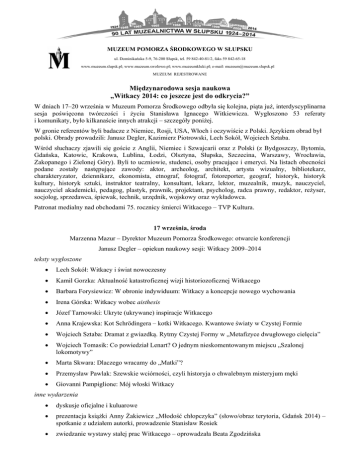 MUZEUM POMORZA ŚRODKOWEGO W SŁUPSKU ul. Dominikańska 5-9, 76-200 Słupsk, tel. 59 842-40-81/2, faks 59 842-65-18 www.muzeum.slupsk.pl; www.muzeum.swolowo.pl; www.muzeumkluki.pl; e-mail: [email protected] MUZEUM REJESTROWANE Międzynarodowa sesja naukowa „Witkacy 2014: co jeszcze jest do odkrycia?” W dniach 17–20 września w Muzeum Pomorza Środkowego odbyła się kolejna, piąta już, interdyscyplinarna sesja poświęcona twórczości i życiu Stanisława Ignacego Witkiewicza. Wygłoszono 53 referaty i komunikaty, było kilkanaście innych atrakcji – szczegóły poniżej. W gronie referentów byli badacze z Niemiec, Rosji, USA, Włoch i oczywiście z Polski. Językiem obrad był polski. Obrady prowadzili: Janusz Degler, Kazimierz Piotrowski, Lech Sokół, Wojciech Sztaba. Wśród słuchaczy zjawili się goście z Anglii, Niemiec i Szwajcarii oraz z Polski (z Bydgoszczy, Bytomia, Gdańska, Katowic, Krakowa, Lublina, Łodzi, Olsztyna, Słupska, Szczecina, Warszawy, Wrocławia, Zakopanego i Zielonej Góry). Byli to uczniowie, studenci, osoby pracujące i emeryci. Na listach obecności podane zostały następujące zawody: aktor, archeolog, architekt, artysta wizualny, bibliotekarz, charakteryzator, dziennikarz, ekonomista, etnograf, fotograf, fotoreporter, geograf, historyk, historyk kultury, historyk sztuki, instruktor teatralny, konsultant, lekarz, lektor, muzealnik, muzyk, nauczyciel, nauczyciel akademicki, pedagog, plastyk, prawnik, projektant, psycholog, radca prawny, redaktor, reżyser, socjolog, sprzedawca, śpiewak, technik, urzędnik, wojskowy oraz wykładowca. Patronat medialny nad obchodami 75. rocznicy śmierci Witkacego – TVP Kultura. 17 września, środa Marzenna Mazur – Dyrektor Muzeum Pomorza Środkowego: otwarcie konferencji Janusz Degler – opiekun naukowy sesji: Witkacy 2009–2014 teksty wygłoszone Lech Sokół: Witkacy i świat nowoczesny Kamil Gorzka: Aktualność katastroficznej wizji historiozoficznej Witkacego Barbara Forysiewicz: W obronie indywiduum: Witkacy a koncepcje nowego wychowania Irena Górska: Witkacy wobec aisthesis Józef Tarnowski: Ukryte (ukrywane) inspiracje Witkacego Anna Krajewska: Kot Schrödingera – kotki Witkacego. Kwantowe światy w Czystej Formie Wojciech Sztaba: Dramat z gwiazdką. Rytmy Czystej Formy w „Metafizyce dwugłowego cielęcia” Wojciech Tomasik: Co powiedział Lenart? O jednym nieskomentowanym miejscu „Szalonej lokomotywy” Marta Skwara: Dlaczego wracamy do „Matki”? Przemysław Pawlak: Szewskie wciórności, czyli historyja o chwalebnym misteryjum męki Giovanni Pampiglione: Mój włoski Witkacy inne wydarzenia dyskusje oficjalne i kuluarowe prezentacja książki Anny Żakiewicz „Młodość chłopczyka” (słowo/obraz terytoria, Gdańsk 2014) – spotkanie z udziałem autorki, prowadzenie Stanisław Rosiek zwiedzanie wystawy stałej prac Witkacego – oprowadzała Beata Zgodzińska widowisko multimedialne „Usłyszeć i zobaczyć Witkacego” – Tomasz Giczewski i Michał Giedrojć, Czerwony Spichlerz, ul. Szarych Szeregów 12 spotkanie towarzyskie uczestników konferencji 18 września, czwartek teksty wygłoszone Kazimierz Piotrowski: Podwójne przyczynowanie IP. Paradoks moralności S. I. Witkiewicza Justyna Borkowska: Moralistyczne aspekty publicystyki Witkacego [referat odczytała Katarzyna Maciejewska] Tomasz Bocheński: Witkacy o pożądaniu Jan Gondowicz: Witkacowskie perwersje Bogusław Habrat: Witkacy a zdrowie psychiczne Mark Rudnicki: Witkacy and Schopenhauer on Suffering (Witkacy a Schopenhauer. O cierpieniu) [tekst wygłoszony został po angielsku; dla słuchaczy przygotowano streszczenie po polsku] Ewa Wąchocka: Tropami „grzesznych” namiętności w teatrze Witkacego Ewa Szkudlarek: Witkacego teatr mody Katarzyna Taras: Witkacy i „Morfina” Twardocha Aneta Jabłońska: „Tak – to jest pewne, że sam fakt istnienia jest potworny”. O genezie filozofii tragizmu Witkacego i sposobach jej przezwyciężenia na podstawie „622 upadków Bunga”, „Pożegnania jesieni” i „Nienasycenia” Katarzyna Wojewódzka: Nieznane tło dojrzewania światopoglądowego S. I. Witkiewicza – rzecz o lekturach i spowiedzi Daniel Kalinowski: Piękna, potrójna istota dwupłciowa, czyli S. I. Witkiewicz wobec orientalnej metafizyki Jakub Gryzowski: Czysta Forma w filmie (komunikat) inne wydarzenia dyskusje oficjalne i kuluarowe inauguracja 17. Ogólnopolskiego Konkursu Interpretacji Dzieł Stanisława Ignacego Witkiewicza „Witkacy pod Strzechy”, organizatorzy: Oddział Okręgowy Towarzystwa Kultury Teatralnej, Teatr Rondo w Słupsku, Słupski Ośrodek Kultury zwiedzanie wystawy czasowej prac Witkacego – oprowadzała Beata Zgodzińska premiera spektaklu „W małym dworku”, Zespół Nowego Teatru im. Witkacego, Słupsk wieczór niespodzianek i odkryć – prowadzenie Janusz Degler 19 września, piątek teksty wygłoszone Ewa Makarczyk-Schuster, Karlheinz Schuster: Nauki ścisłe w Czystej Formie Edyta i Rafał Foltynowie: „Tygrysi skok w przyszłość nowej sztuki…” Witkacowskie inspiracje twórczością Tadeusza Micińskiego Martyna Jastrząbek: (Z)mowa Wisielców: „Wariat i zakonnica” a „Romans Siedmiu Braci Śpiących w Chinach” Tadeusza Micińskiego (komunikat) Izabela Curyłło-Klag: Witkacy a Wyndham Lewis (komunikat) Anna Al-Araj: Witkacy – „mistyk bez Boga”? O koncepcji homo metaphysicus Trepidus (komunikat) Natalia Jakubowa: Wielkie aktorki pobierają naukę Sztuki przez wielkie S (Eleonora Duse – d’Annunzio i Irena Solska – Witkacy) [tekst przeczytała Beata Zgodzińska] Magdalena Baraniak: Witkacy – szyderca antyromantyczny? Widma i trupy w „Macieju Korbowie i Bellatrix” S. I. Witkiewicza oraz w „Beatryks Cenci” J. Słowackiego Marta Łowejko: Parodie oraz autoparodie S. I. Witkiewicza (komunikat) Karolina Czerska: „Szewcy” Tadeusza Kantora i „Szewcy” Witkacego. O związkach partytury z tekstem dramatu Natalia Michna – Katastrofi
