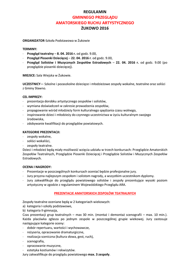 REGULAMIN GMINNEGO PRZEGLĄDU AMATORSKIEGO RUCHU ARTYSTYCZNEGO ŻUKOWO 2016 ORGANIZATOR-Szkoła Podstawowa w Żukowie TERMINY: Przegląd teatralny – 8. 04. 2016 r. od godz. 9.00, Przegląd Piosenki Dziecięcej – 22. 04. 2016 r. od godz. 9.00, Przegląd Solistów i Muzycznych Zespołów Estradowych – 22. 04. 2016 r. od godz. 9.00 (po przeglądzie piosenki dziecięcej). MIEJSCE: Sala Wiejska w Żukowie. UCZESTNICY— Szkolne i pozaszkolne dziecięce i młodzieżowe zespoły wokalne, teatralne oraz soliści z Gminy Sławno. CEL IMPREZY: prezentacja dorobku artystycznego zespołów i solistów, wymiana doświadczeń w zakresie prowadzenia zespołów, propagowanie wśród młodzieży form kulturalnego spędzania czasu wolnego, inspirowanie dzieci i młodzieży do czynnego uczestnictwa w życiu kulturalnym swojego środowiska, zdobywanie kwalifikacji do przeglądów powiatowych. KATEGORIE PREZENTACJI: zespoły wokalne, soliści wokaliści, zespoły teatralne. Dzieci i młodzież będą miały możliwość wzięcia udziału w trzech konkursach: Przeglądzie Amatorskich Zespołów Teatralnych, Przeglądzie Piosenki Dziecięcej i Przeglądzie Solistów i Muzycznych Zespołów Estradowych. OCENA I NAGRODY: Prezentacje w poszczególnych konkursach oceniać będzie profesjonalne jury. Jury przyzna najlepszym zespołom i solistom nagrody, a wszystkim uczestnikom dyplomy. Jury zakwalifikuje do przeglądu powiatowego solistów i zespoły prezentujące wysoki poziom artystyczny w zgodzie z regulaminem Wojewódzkiego Przeglądu ARA. PREZENTACJE AMATORSKICH ZESPOŁÓW TEATRALNYCH Zespoły teatralne oceniane będą w 2 kategoriach wiekowych: a) kategoria I-szkoły podstawowe, b) kategoria II-gimnazja, Czas prezentacji grup teatralnych – max 30 min. (montaż i demontaż scenografii – max. 10 min.). Każda placówka zgłasza po jednym zespole w poszczególnej grupie wiekowej. Jury zastosuje następujące kategorie oceny: dobór repertuaru, wartości i wychowawcze, reżyseria, opracowanie dramaturgiczne, realizacja sceniczna (kultura słowa, gest, ruch), scenografia, opracowanie muzyczne, estetyka kostiumów i rekwizytów. Jury zakwalifikuje do przeglądu powiatowego max. 3 zespoły. PRZEGLĄD PIOSENKI DZIECIĘCEJ W przeglądzie piosenki dziecięcej mogą uczestniczyć soliści, duety, zespoły wokalne i wokalnoinstrumentalne w 2 kategoriach wiekowych: a) kategoria I-dzieci od 6 do 9 lat, b) kategoria II-dzieci od 10 do 12 lat. Wykonawcy prezentują max. 2 piosenki w języku polskim dostosowane do ich wieku, o łącznym czasie do 7 min. Jury oceniać będzie: dobór repertuaru, opracowanie muzyczne, wykonanie (emisja głosu, dykcja), ogólne wrażenie artystyczne. Jury zakwalifikuje z tej grupy do przeglądu powiatowego max. 4 laureatów bez względu na kategorie występu i kategorię wiekową. PRZEGLĄD MUZYCZNYCH ZESPOŁÓW ESTRADOWYCH I SOLISTÓW W przeglądzie biorą udział zespoły wokalne, wokalno-intrumentalne, instrumentalne, soliści i wokaliści oraz zespoły estradowe. Wiek uczestników powyżej 13 lat. Wykonawcy przygotowują 2 utwory (dopuszczalne jest wykonanie 1 utworu w języku obcym). Czas prezentacji nie może przekroczyć 7 min. Jury oceni: dobór repertuaru, opracowanie muzyczne, poziom zespołowego warsztatu wykonawczego, ogólny wyraz artystyczny. Do przeglądu powiatowego jury zakwalifikuje z tej grupy max 4 laureatów. PRZEPISY ORGANIZACYJNE DOTYCZĄCE WSZYSTKICH KONKURSÓW Szkoła lub placówka kulturalna może zaprezentować się w każdej kategorii. Uczestnicy przyjeżdżają na własny koszt Zgłaszająca placówka zapewnia opiekuna dla zgłoszonych dzieci. Karty zgłoszenia należy przesłać faksem lub e-mailem w nieprzekraczalnym terminie do: 01. 04. 2016 r. – PRZEGLĄD TEATRALNY 15. 04. 2016 r. – PRZEGLĄDY PIOSENKI Do powyższych terminów prosimy przesłać zbiorczą, imienną listę wszystkich uczestników i opiekunów z danej placówki ze względu na organizację poczęstunku (napisaną na komputerze). Organizator zastrzega sobie prawo do zmian w regulaminie. BIURO ORGANIZACYJNE: Szkoła Podstawowa w Żukowie 76-124 Żukowo tel./fax: 59 858-22-23 e-mail: [email protected]