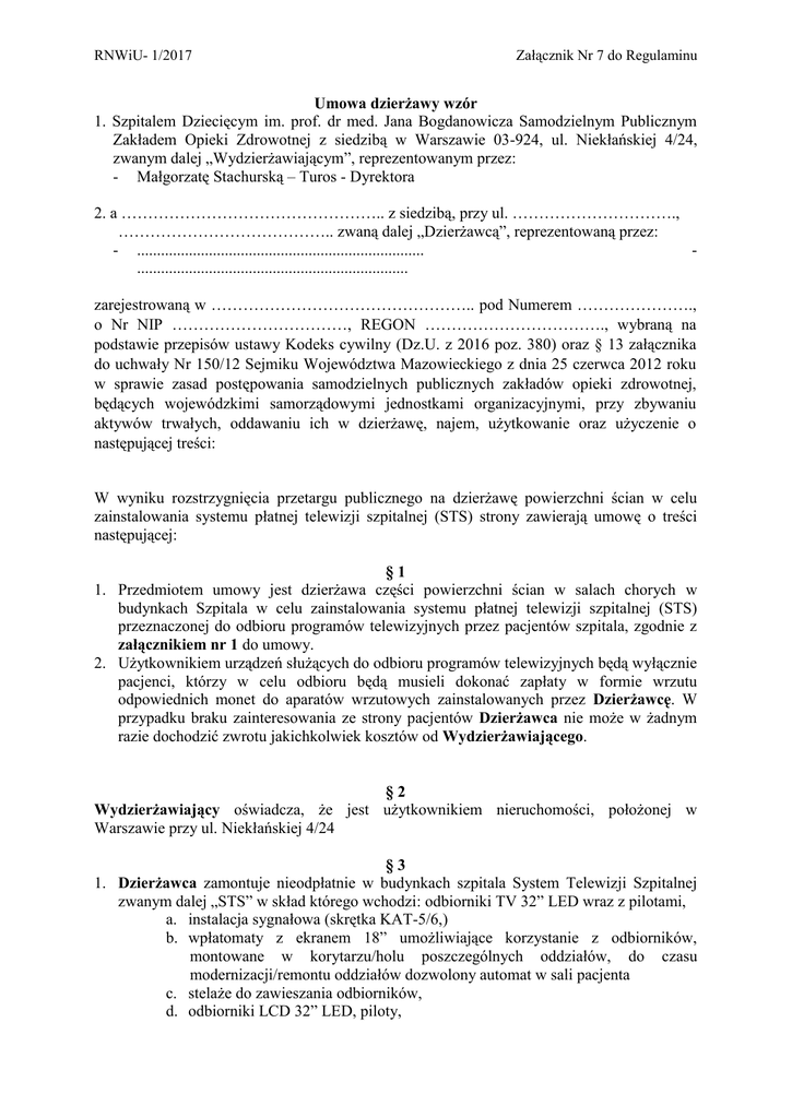 RNWiU- 1/2017 Załącznik Nr 7 do Regulaminu Umowa dzierżawy wzór 1. Szpitalem Dziecięcym im. prof. dr med. Jana Bogdanowicza Samodzielnym Publicznym Zakładem Opieki Zdrowotnej z siedzibą w Warszawie 03-924, ul. Niekłańskiej 4/24, zwanym dalej „Wydzierżawiającym”, reprezentowanym przez: - Małgorzatę Stachurską – Turos - Dyrektora 2. a ………………………………………….. z siedzibą, przy ul. …………………………., ………………………………….. zwaną dalej „Dzierżawcą”, reprezentowaną przez: - ........................................................................ .................................................................... zarejestrowaną w ………………………………………….. pod Numerem …………………., o Nr NIP ……………………………, REGON ……………………………., wybraną na podstawie przepisów ustawy Kodeks cywilny (Dz.U. z 2016 poz. 380) oraz § 13 załącznika do uchwały Nr 150/12 Sejmiku Województwa Mazowieckiego z dnia 25 czerwca 2012 roku w sprawie zasad postępowania samodzielnych publicznych zakładów opieki zdrowotnej, będących wojewódzkimi samorządowymi jednostkami organizacyjnymi, przy zbywaniu aktywów trwałych, oddawaniu ich w dzierżawę, najem, użytkowanie oraz użyczenie o następującej treści: W wyniku rozstrzygnięcia przetargu publicznego na dzierżawę powierzchni ścian w celu zainstalowania systemu płatnej telewizji szpitalnej (STS) strony zawierają umowę o treści następującej: §1 1. Przedmiotem umowy jest dzierżawa części powierzchni ścian w salach chorych w budynkach Szpitala w celu zainstalowania systemu płatnej telewizji szpitalnej (STS) przeznaczonej do odbioru programów telewizyjnych przez pacjentów szpitala, zgodnie z załącznikiem nr 1 do umowy. 2. Użytkownikiem urządzeń służących do odbioru programów telewizyjnych będą wyłącznie pacjenci, którzy w celu odbioru będą musieli dokonać zapłaty w formie wrzutu odpowiednich monet do aparatów wrzutowych zainstalowanych przez Dzierżawcę. W przypadku braku zainteresowania ze strony pacjentów Dzierżawca nie może w żadnym razie dochodzić zwrotu jakichkolwiek kosztów od Wydzierżawiającego. §2 Wydzierżawiający oświadcza, że jest użytkownikiem nieruchomości, położonej w Warszawie przy ul. Niekłańskiej 4/24 §3 1. Dzierżawca zamontuje nieodpłatnie w budynkach szpitala System Telewizji Szpitalnej zwanym dalej „STS” w skład którego wchodzi: odbiorniki TV 32” LED wraz z pilotami, a. instalacja sygnałowa (skrętka KAT-5/6,) b. wpłatomaty z ekranem 18” umożliwiające korzystanie z odbiorników, montowane w korytarzu/holu poszczególnych oddziałów, do czasu modernizacji/remontu oddziałów dozwolony automat w sali pacjenta c. stelaże do zawieszania odbiorników, d. odbiorniki LCD 32” LED, piloty, RNWiU- 1/2017 Załącznik Nr 7 do Regulaminu e. słuchawki z atestem PZH f. Access Ponity Wi-Fi g. Instrukcje obsługi montowane w salach pacjentów (rozmiar 50cm x 50cm), nad wpłatomatem (rozmiar 50cm x 50cm) 2. „Dzierżawca” po przez „STS” zapewni pacjentom dostęp do usług takich jak: a) Telewizja b) Wypożyczalnia filmów – VOD c) Bezpłatny kanał „INFO Szpital” z możliwością dodawania materiałów emisyjnych online przez Wydzierżawiającego d) Audiobook – usługa bezpłatna e) Bezpłatny kanał o tematyce prozdrowotnej, Internet – dostęp poprzez WiFi oraz w odbiornikach, zamontowany w salach pacjentów f) Możliwość płatności w postaci: bilonu, banknotów, kartą płatnicza w systemie PayPass oraz przelewem online. 3. Dzierżawca oświadcza, że wszystkie urządzenia, sprzęt i materiały użyte do wykonania instalacji STS-u są bezpieczne dla ludzi i środowiska oraz są dopuszczone do stosowania w budownictwie i ochronie zdrowia. 4. Po wykonaniu STS Dzierżawca obowiązany jest przekazać Wydzierżawiającemu na zainstalowane urządzenia i materiały: certyfikaty na znak bezpieczeństwa, deklaracje zgodności lub certyfikaty zgodności z Polską Normą lub aprobatą techniczną. 5. Wydzierżawiający udostępni Dzierżawcy takie części budynków, które są niezbędne do wykonania „STS”. 6. Sposób prowadzenia sieci oraz miejsca montażu odbiorników zostanie uzgodniony z upoważnionym pracownikiem Działu Technicznego Wydzierżawiającego. 7. W przypadku remontu pomieszczeń lub ich zmian funkcjonalnych Dzierżawca zobowiązany jest do demontażu „STS-u” w tych pomieszczeniach oraz dostosowania sieci do nowego stanu na własny koszt. Wydzierżawiający poinformuje Dzierżawcę o planowanym remoncie lub zmianach funkcjonalnych pomieszczeń jeden miesiąc przed ich rozpoczęciem. 8. Dzierżawca zobowiązuje się do wykonywania prac określonych w ust. 1 bez zakłócania prawidłowego funkcjonowania Szpitala. 9. Dzierżawca zobowiązuje się na własny koszt naprawić ewentualne uszkodzenia budynku powstałe w związku z montażem, eksploatacją i konserwacją urządzeń STS. §4 1. Dzierżawca oświadcza, że w ramach prowadzonej przez siebie działalności gospodarczej przewidującej m.in. możliwość organizowania sieci telewizji szpitalnych oraz rozpowszechniania programów telewizyjnych, zapewni prawidłowe funkcjonowanie STSu zamontowanego na terenie Wydzierżawiającego oraz jego serwis przez cały czas obejmowania umowy. Dzierżawca uprawniony jest także do poszerzenia swojej oferty technicznej i programowej w zakresie STS-u, którego jest organizatorem. 2. Dzierżawca oświadcza, że prowadzona przez niego działalność jest w pełni zgodna z obowiązującymi przepisami prawa i nie jest objęta wymogiem posiadania odrębnych koncesji lub zezwoleń. W razie powstania takiego wymogu Dzierżawca zobowiązuje się podjąć czynności mające na celu ich uzyskanie w celu kontynuowania swej działalności, lub też poinformować niezwłocznie Wydzierżawiającego o konieczności zaprze