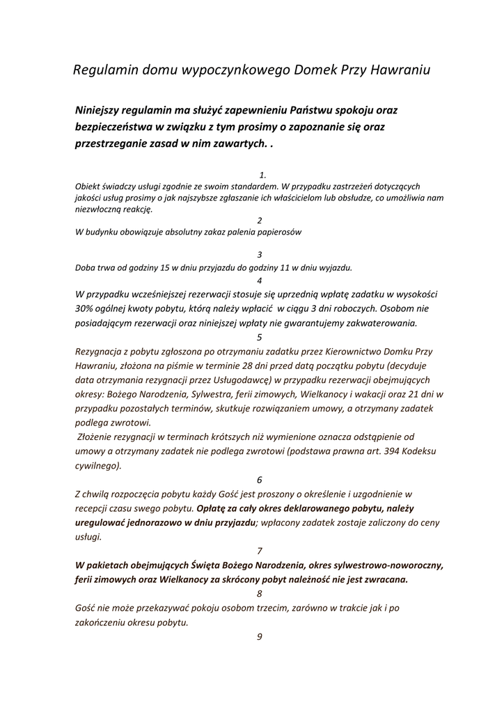 Regulamin domu wypoczynkowego Domek Przy Hawraniu Niniejszy regulamin ma służyć zapewnieniu Państwu spokoju oraz bezpieczeństwa w związku z tym prosimy o zapoznanie się oraz przestrzeganie zasad w nim zawartych. . 1. Obiekt świadczy usługi zgodnie ze swoim standardem. W przypadku zastrzeżeń dotyczących jakości usług prosimy o jak najszybsze zgłaszanie ich właścicielom lub obsłudze, co umożliwia nam niezwłoczną reakcję. 2 W budynku obowiązuje absolutny zakaz palenia papierosów 3 Doba trwa od godziny 15 w dniu przyjazdu do godziny 11 w dniu wyjazdu. 4 W przypadku wcześniejszej rezerwacji stosuje się uprzednią wpłatę zadatku w wysokości 30% ogólnej kwoty pobytu, którą należy wpłacić w ciągu 3 dni roboczych. Osobom nie posiadającym rezerwacji oraz niniejszej wpłaty nie gwarantujemy zakwaterowania. 5 Rezygnacja z pobytu zgłoszona po otrzymaniu zadatku przez Kierownictwo Domku Przy Hawraniu, złożona na piśmie w terminie 28 dni przed datą początku pobytu (decyduje data otrzymania rezygnacji przez Usługodawcę) w przypadku rezerwacji obejmujących okresy: Bożego Narodzenia, Sylwestra, ferii zimowych, Wielkanocy i wakacji oraz 21 dni w przypadku pozostałych terminów, skutkuje rozwiązaniem umowy, a otrzymany zadatek podlega zwrotowi. Złożenie rezygnacji w terminach krótszych niż wymienione oznacza odstąpienie od umowy a otrzymany zadatek nie podlega zwrotowi (podstawa prawna art. 394 Kodeksu cywilnego). 6 Z chwilą rozpoczęcia pobytu każdy Gość jest proszony o określenie i uzgodnienie w recepcji czasu swego pobytu. Opłatę za cały okres deklarowanego pobytu, należy uregulować jednorazowo w dniu przyjazdu; wpłacony zadatek zostaje zaliczony do ceny usługi. 7 W pakietach obejmujących Święta Bożego Narodzenia, okres sylwestrowo-noworoczny, ferii zimowych oraz Wielkanocy za skrócony pobyt należność nie jest zwracana. 8 Gość nie może przekazywać pokoju osobom trzecim, zarówno w trakcie jak i po zakończeniu okresu pobytu. 9 Osoby nie będące gośćmi domu wypoczynkowego mogą przebywać w pokojach w godzinach 8.00 - 22.00. 10 Prosimy o zachowanie ciszy w godzinach 22.00 - 7.00 dnia następnego. 11 Ze względu na bezpieczeństwo przeciwpożarowe zabronione jest używanie w pokojach grzałek, żelazek elektrycznych i innych podobnych urządzeń elektrycznych nie stanowiących wyposażenia pokoju. 12 Gość ponosi odpowiedzialność materialną za wszelkiego rodzaju uszkodzenia lub zniszczenia przedmiotów wyposażenia i urządzeń technicznych powstałe z jego winy lub z winy odwiedzających go osób. 13 Właściciel obiektu może przerwać dalszy pobyt i odmówić ponownego przyjęcia gościa, który naruszył regulamin wyrządzając szkodę w mieniu albo szkodę na osobie gości, pracowników albo innych osób przebywających w obiekcie, lub też w inny sposób zakłócił spokojny pobyt gości i funkcjonowanie obiektu. 14 Właściciele nie ponoszą odpowiedzialności za rzeczy pozostawione na terenie obiektu Niniejszy regulamin ma służyć zapewnieniu Państwu spokoju oraz bezpieczeństwa w związku z tym prosimy o zapoznanie się oraz przestrzeganie zasad w nim zawartych. .