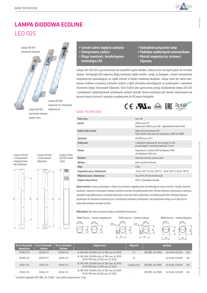 5ANE TECHNICZNE UNTERNEHMEN D www.stego.pl PRODUKTKATALOG - STEGO LAMPA DIODOWA ECOLINE LED 025 >>Szeroki zakres napięcia zasilania >>Zintegrowany zasilacz >>Długa żywotność, bezobsługowa technologia LED Lampa LED 025 mocowanie klipsowe >>Kaskadowe połączenie lamp >>Podwójne szybkozłączki samozaciskowe >>Montaż magnetyczny, śrubowy i klipsowy Lampy serii LED 025 są przeznaczone do wszystkich typów obudów, zwłaszcza do rozwiązań gdzie nie ma dużo miejsca. Technologia LED zapewnia długą żywotność źródła światła. Lampy są dostępne z silnym mocowaniem magnetycznym pozwalającym na szybki montaż w każdej metalowej obudowie. Lampa może być także montowana śrubowo za pomocą uchwytów stałych a także uchwytów pozwalających na przekręcanie i ustawianie strumienia lampy (mocowanie klipsowe). Seria Ecoline jest uproszczoną wersją standardowej lampy LED 025 z podwójnymi szybkozłączkami zaciskowymi zamiast wtyczek. Nowa konstrukcja jest również dostosowana do łączenia lamp w łańcuch i pozwala na podłączenie do 10 lamp w kaskadzie. Lampa LED 025 z mocowaniem magnetycznym lub śrubowym Lampa LED 025 z mocowaniem klipsowym Lampa Ecoline LED 025 widok z góry DANE TECHNICZNE Pobór mocy max. 5W Jasność 400Lm przy 120° (odpowiada 1200Lm przy 360°, odpowiednik żarówki 95W) Rodzaj źródła światła diody LED, kąt świecenia 120°, kolor światła: jasny dzienny, temperatura: 6000 do 7000K Żywotność 60 000h przy +20°C Podłączenie 2 podwójne szybkozłączki, drut okrągły 2,5 mm2, przewód giętki (z końcówką kablową) 1,5 mm2 Montaż magnetyczny, śrubowy (M5) lub klipsowy (M6) siła dokręcania 2Nm max. Obudowa tworzywo sztuczne, przezroczyste Wymiary patrz rysunki wymiarowe Waga 0,2kg Temperatura pracy i składowania -30 do +60°C (-22 do +140°F) / -40 do +85°C (-40 do +185°F) Wilgotność pracy i składowania max. 90 % RH (bez kondensacji) Stopień i klasa ochrony IP20 / II (podwójna izolacja) Opcje montażu: Lampy są dostępne z silnym mocowaniem magnetycznym umożliwiającym łatwy montaż w każdej, stalowej obudowie. Klasyczne mocowanie śrubowe umożliwia montaż na każdej powierzchni. Montaż klipsowy realizowany za pomocą specjalnie zaprojektowanych uchwytów klipsowych może być także realizowany na każdej powierzchni. Uchwyty klipsowe przykręcane do obudowy za pomocą śrub, umożliwiają swobodne przekręcanie i pozycjonowanie lampy w osi aby jeszcze lepiej ukierunkować strumień światła. Wskazówka: Nie wolno stosować lampy w oświetleniu domowym. Widok boczny – montaż magnetyczny Widok boczny – montaż śrubowy Widok boczny – montaż klipsowy Nr art. Mocowanie magnetyczne Nr art. Mocowanie śrubowe Nr art. mocowanie klipsowe Napięcie pracy Wyłącznik Aprobacje 02540.0-10 02540.0-11 02540.0-13 AC 100-240V, 50/60Hz (min. AC 90V, max. AC 265V) 0-I VDE (REG.-Nr. E788)1 UL File No. E234324 EAC 0-I - UL File No. E234324 EAC 02540.3-10 02540.3-11 02540.3-13 AC 100-240V, 50/60Hz (min. AC 90V, max. AC 265V) DC 90-110V (min. DC 80V, max. DC 125V) 02541.3-10 02541.3-11 02541.3-13 AC 100-240V, 50/60Hz (min. AC 90V, max. AC 265V) DC 90-110V (min. DC 80V, max. DC 125V) Czujnik ruchu2 VDE (REG.-Nr. E788)1 UL File No. E234324 EAC 02542.3-13 AC 100-240V, 50/60Hz (min. AC 90V, max. AC 265V) DC 90-110V (min. DC 80V, max. DC 125V) - VDE (REG.-Nr. E788)1 UL File No. E234324 EAC 02542.3-10 02542.3-11 ¹ Certyfikat zgodności VDE (REG.-Nr. E788); 2 Czas zwłoki załączenia ok. 5 min. 02.02.2016 | Zmiany techniczne zastrzeżone. Wszystkie parametry mogą podlegać zmianie. Poniższe informacje nie zwalniają nabywcy od samodzielnej kontroli instalacji. Lampa LED 025 mocowanie śrubowe, czujnik ruchu Lampa LED 025 wyłącznik I-0, mocowanie magnetyczne