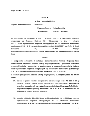 Sygn. akt: KIO 1674/14 WYROK z dnia 1 września 2014 r. Krajowa Izba Odwoławcza - w składzie: Przewodniczący: Luiza Łamejko Protokolant: Łukasz Listkiewicz po rozpoznaniu na rozprawie w dniu 1 września 2014 r. w Warszawie odwołania wniesionego do Prezesa Krajowej Izby Odwoławczej w dniu 14 sierpnia 2014 r. przez wykonawców wspólnie ubiegających się o udzielenie zamówienia publicznego: P. R. i K. S. – wspólników spółki cywilnej „MONSTER” s.c. P. R., K. S., ul. Słoneczna 19, 10-709 Olsztyn w postępowaniu prowadzonym przez Gminę Miejską Iława, ul. Niepodległości 13, 14-200 Iława orzeka: 1. uwzględnia odwołanie i nakazuje zamawiającemu Gminie Miejskiej Iława unieważnienie czynności wyboru oferty najkorzystniejszej i powtórne dokonanie czynności badania i oceny ofert w postępowaniu z uwzględnieniem oferty złożonej przez wykonawców wspólnie ubiegających się o udzielenie zamówienia publicznego: P. R. i K. S. – wspólników spółki cywilnej „MONSTER” s.c. P. R., K. S., 2. kosztami postępowania obciąża Gminę Miejską Iława, ul. Niepodległości 13, 14-200 Iława i: 2.1. zalicza w poczet kosztów postępowania odwoławczego kwotę 10 000 zł 00 gr (słownie: dziesięć tysięcy złotych zero groszy) uiszczoną przez wykonawców wspólnie ubiegających się o udzielenie zamówienia publicznego: P. R. i K. S. – wspólników spółki cywilnej „MONSTER” s.c. P. R., K. S., ul. Słoneczna 19, 10709 Olsztyn tytułem wpisu od odwołania, 2.2. zasądza od Gminy Miejskiej Iława, ul. Niepodległości 13, 14-200 Iława na rzecz wykonawców wspólnie ubiegających się o udzielenie zamówienia publicznego: P. R. i K. S. – wspólników spółki cywilnej „MONSTER” s.c. P. R., 1 K. S., ul. Słoneczna 19, 10-709 Olsztyn, 10-709 Olsztyn kwotę 13 600 zł 00 gr (słownie: trzynaście tysięcy sześćset złotych zero groszy) stanowiącą koszty postępowania odwoławczego poniesione z tytułu wpisu od odwołania oraz wynagrodzenia pełnomocnika. Stosownie do art. 198a i 198b ustawy z dnia 29 stycznia 2004 r. - Prawo zamówień publicznych (t.j. Dz. U. z 2010 r. 113, poz. 759 ze zm.) na niniejszy wyrok - w terminie 7 dni od dnia jego doręczenia - przysługuje skarga za pośrednictwem Prezesa Krajowej Izby Odwoławczej do Sądu Okręgowego w Elblągu. Przewodniczący: …………… 2 Sygn. akt: KIO 1674/14 Uzasadnienie Gmina Miejska Iława (dalej: „zamawiający”) prowadzi w trybie przetargu nieograniczonego postępowanie o udzielenie zamówienia publicznego na budowę sali gimnastycznej przy Gimnazjum nr 1 w Iławie. Postępowanie to prowadzone jest na podstawie przepisów ustawy z dnia 29 stycznia 2004 r. Prawo zamówień publicznych (Dz. U. t.j. z 2013 r. poz. 907), zwanej dalej: „ustawą Pzp”. Ogłoszenie o przedmiotowym zamówieniu zostało opublikowane w Biuletynie Zamówień Publicznych w dniu 20 czerwca 2014 r. pod pozycją 132929. W dniu 14 sierpnia 2014 r. wykonawcy wspólnie ubiegający się o udzielenie zamówienia publicznego: P. R. i K. S. – wspólnicy spółki cywilnej „MONSTER” s.c. P. R., K. S. (dalej: „odwołujący”) wnieśli do Prezesa Krajowej Izby Odwoławczej odwołanie zarzucając zamawiającemu naruszenie: - art. 24 ust. 2 pkt 4 ustawy Pzp poprzez nieuprawnione wykluczenie odwołującego, - art. 24 ust. 4 oraz art. 89 ust. 1 pkt 5 ustawy Pzp poprzez odrzucenie oferty odwołującego, - art. 91 i art. 92 ustawy Pzp poprzez dokonanie w wyniku postępowania wyboru oferty nie będącej najkorzystniejszą na podstawie ustalonych przez zamawiającego kryteriów oceny ofert oraz obowiązujących zamawiającego norm ustawy Pzp, - art. 7 ust. 3 ustawy Pzp poprzez udzielenie zamówienia wykonawcy, który został wybrany niezgodnie z przepisami ustawy. W uzasadnieniu odwołania odwołujący stwierdził, że uzupełnione na wezwanie zamawiającego oświadczenia o braku podstaw do wykluczenia oraz o przynależności do grupy kapitałowej, o której mowa w art. 24 ust. 2 pkt 5 ustawy Pzp, zostały złożone przez wymagane osoby, tj. wspólników spółki cywilnej; z załączonych do oferty dokumentów jednoznacznie wynika kto złożył oraz kto podpisał wymagane oświadczenia. Odwołujący przychylił się do stanowiska zamawiającego zaprezentowanego w zawiadomieniu o wykluczeniu odwołującego z postępowania i odrzuceniu złożonej przez odwołującego oferty z dnia 11 sierpnia 2014 r., iż wspólnicy spółki cywilnej są w świetle prawa przedsiębiorcami. Odwołujący przyznał, że spółka cywilna w obecnym stanie prawnym nie posiada podmiotowości prawnej, jest wyłącznie stosunkiem o charakterze zobowiązaniowym (umową) zawartym pomiędzy co najmniej dwoma podmiotami. Spółka 3 cywilna nie posiada zdolności sądowej, procesowej, upadłościowej, układowej ani wekslowej. Spółka cywilna nie posiada statusu wykonawcy w rozumieniu art. 2 pkt 11 ustawy Pzp. Odwołujący wskazał, że stosownie do art. 860 kc, znajdującego zastosowanie z mocy art. 14 ustawy Pzp, spółka cywilna jest stosunkiem prawno-zobowiązaniowym, którego istotą jest dążenie do osiągnięcia wspólnego celu gospodarczego. Spółka cywilna nie tworzy odrębnych podmiotowych struktur organizacyjnych, jest jedynie umową zawartą przez jej wspólników, której żaden przepis kodeksu cywilnego nie przyznaje zdolności prawnej, odrębnej od zdolności jej wspólników. Istota jej wyczerpuje się więc w dwu lub nawet wielostronnym stosunku obligacyjnym, łączącym wspólników. Odwołujący zauważył, że uczestnikami postępowania o udzielenie zamówienia publicznego, wykonawcami w rozumieniu art. 2 pkt 11 ustawy Pzp, są wspólnicy spółki cywilnej, których udział w postępowaniu traktowany jest jako wspólne ubieganie się o udzielenie zamówienia w rozumieniu art. 23 ust. 1 ustawy Pzp. Odwołujący podniósł, że zamawiający w uzasadnieniu wykluczenia odwołującego zaznaczył, iż zgodnie z załączonymi do oferty odpisam