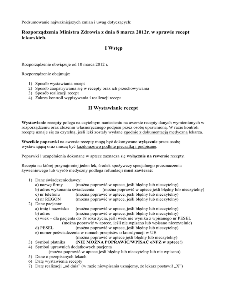 Podsumowanie najważniejszych zmian i uwag dotyczących: Rozporządzenia Ministra Zdrowia z dnia 8 marca 2012r. w sprawie recept lekarskich. I Wstęp Rozporządzenie obwiązuje od 10 marca 2012 r. Rozporządzenie obejmuje: 1) 2) 3) 4) Sposób wystawiania recept Sposób zaopatrywania się w recepty oraz ich przechowywania Sposób realizacji recept Zakres kontroli wypisywania i realizacji recept II Wystawianie recept Wystawienie recepty polega na czytelnym naniesieniu na awersie recepty danych wymienionych w rozporządzeniu oraz złożeniu własnoręcznego podpisu przez osobę uprawnioną. W razie kontroli receptę uznaje się za czytelną, jeśli leki zostały wydane zgodnie z dokumentacją medyczną lekarza. Wszelkie poprawki na awersie recepty mogą być dokonywane wyłącznie przez osobę wystawiającą oraz muszą być każdorazowo podbite pieczątką i podpisane. Poprawki i uzupełnienia dokonane w aptece zaznacza się wyłącznie na rewersie recepty. Recepta na której przynajmniej jeden lek, środek spożywczy specjalnego przeznaczenia żywieniowego lub wyrób medyczny podlega refundacji musi zawierać: 1) Dane świadczeniodawcy: a) nazwę firmy (można poprawić w aptece, jeśli błędny lub nieczytelny) b) adres wykonania świadczenia (można poprawić w aptece jeśli błędny lub nieczytelny) c) nr telefonu (można poprawić w aptece, jeśli błędny lub nieczytelny) d) nr REGON (można poprawić w aptece, jeśli błędny lub nieczytelny) 2) Dane pacjenta: a) imię i nazwisko (można poprawić w aptece, jeśli błędny lub nieczytelny) b) adres (można poprawić w aptece, jeśli błędny lub nieczytelny) c) wiek – dla pacjenta do 18 roku życia, jeśli wiek nie wynika z wpisanego nr PESEL (można poprawić w aptece, jeśli nie wpisano lub wpisano nieczytelnie) d) PESEL (można poprawić w aptece, jeśli błędny lub nieczytelny) e) numer poświadczenia w ramach przepisów o koordynacji w UE (można poprawić w aptece jeśli błędny lub nieczytelny) 3) Symbol płatnika (NIE MOŻNA POPRAWIĆ/WPISAĆ oNFZ w aptece!) 4) Symbol uprawnień dodatkowych pacjenta (można poprawić w aptece jeśli błędny lub nieczytelny lub nie wpisano) 5) Dane o przepisanych lekach 6) Datę wystawienia recepty 7) Datę realizacji „od dnia” (w razie niewpisania uznajemy, że lekarz postawił „X”) 8) Dane osoby wystawiającej - w tym imię i nazwisko oraz numer PWZ (można poprawić w aptece jeśli błędny lub nieczytelny) 9) Indywidualny nr recepty, przedstawiony również w postaci kodu kreskowego Recepty na leki niepodlegające refundacji muszą zawierać co najmniej: 1) Dane pacjenta (imię nazwisko adres) 2) Dane o przepisanych lekach 3) Datę wystawienia recepty 4) Dane osoby wystawiającej receptę Recepty na leki nierefundowane, ale zawierające w swoim składzie środki odurzające z grupy II-N lub substancje psychotropowe z grup III-P i IV-P muszą poza w/w danymi zawierać również nr PESEL lub numer dokumentu ze zdjęciem, poświadczenia dla pacjentów z zagranicy. Dane dotyczące przepisanych leków obejmują: 1) nazwę: a) nazwę leku b) rodzajową lub handlową nazwę środka spożywczego specjalnego przeznaczenia żywieniowego, c) rodzajową lub handlową nazwę wyrobu medycznego - lub ich skrócona nazwę, która w jednoznaczny sposób pozwala określić przepisany lek (np. Kalipoz prol., Ketonal (bez forte) 100mg, etc.) 2) postać, jeśli występuje w obrocie w co najmniej dwóch (nie wpisaną można ustalić w aptece, na podstawie posiadanej wiedzy) 3) dawkę, jeśli występuje w obrocie w więcej niż jednej (jeśli nie zaznaczono dawki wydajemy najniższą dawkę dopuszczoną do obrotu na terytorium RP – a nie najniższą refundowaną!) 4) ilość leku, środka spożywczego specjalnego przeznaczenia żywieniowego, wyrobu medycznego lub skład w przypadku leku recepturowego (zlikwidowano wymóg zapisywania ilości i wielkości opakowań lub sumarycznej ilości dawek, nie jest sprecyzowane niestety, czy można zapisać lek recepturowy za pomocą nazwy, a nie składu) 5) sposób dawkowania - jest wymagany przy przepisaniu leków gotowych lub recepturowych zawierających w swoim składzie środki odurzające I-N, II-N, substancje psychotropowe III-P IV-P albo leku recepturowego zawierającego w swoim składzie substancje z wykazu A, zawartego w Farmakopei Polskiej (dawkowanie przy lekach gotowych z wykazu A nie jest wymagane) 6) Odpłatność: a) Jeżeli lek, środek spożywczy specjalnego przeznaczenia żywieniowego, wyrób medyczny występuje w wykazie refundowanych leków(...) w jednej odpłatności, a lekarz nie zaznaczy przy wypisanym leku znaku „X” lub „100%”, wydajemy go za odpłatność widniejącą w wykazie, b) Jeżeli lek, środek spożywczy specjalnego przeznaczenia żywieniowego, wyrób medyczny występuje w wykazie refundowanych leków(...) w co najmniej dwóch odpłatnościach, a lekarz nie zaznaczył przy wypisanym leku znaku „X” lub „100%” wydajemy za najwyższą odpłatnością z wykazu, c) Jeżeli lek, środek spożywczy specjalnego przeznaczenia żywieniowego, wyrób medyczny występuje w wykazie refundowanych leków(...) w co najmniej dwóch odpłatnościach, a lekarz zamieści przy nim (nie w polu Ch.Przew.!) znak „P” wydajemy go za najniższą odpłatnością z wykazu, d) Odpłatności mogą być również zapisane przez lekarza zgodnie z dotychczasowym schematem: B – lub równoważne, R – lub równoważne, 30%, 50%. Oznaczania odpłatności nie są wymagane dla pacjentów z uprawnieniami IB, ale ich ewentualne wpisanie nie dyskwalifikuje przysługujących im uprawnień do bezpłatnego zaopatrzenia w leki. Na recepcie, podobnie jak poprzednio, może znaleźć się adnotacja pilnej realizacji „Cito” a także zastrzeżenie lekarza o konieczności wydania jedynie określonego leku poprzez adnotację „nie zamieniać” lub „NZ” przy wybranej pozycji. Ilość leku, środka spożywczego specjalnego przeznaczenia żywieniow