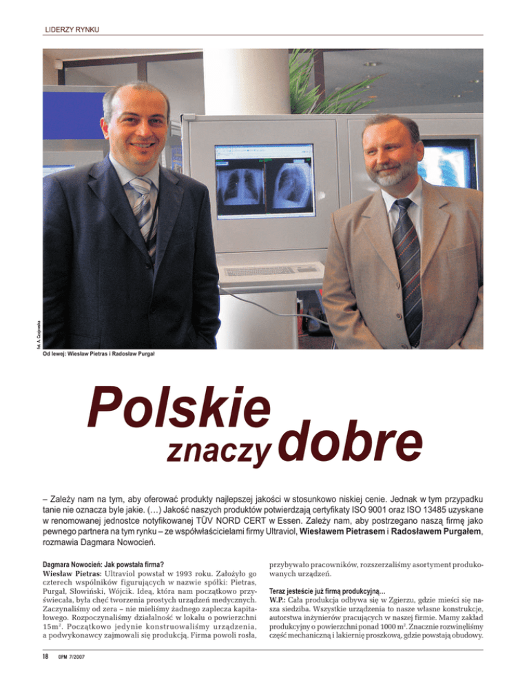 fot. A. Czajowska LIDERZY RYNKU Od lewej: Wiesław Pietras i Radosław Purgał Polskie znaczy dobre – Zależy nam na tym, aby oferować produkty najlepszej jakości w stosunkowo niskiej cenie. Jednak w tym przypadku tanie nie oznacza byle jakie. (…) Jakość naszych produktów potwierdzają certyfikaty ISO 9001 oraz ISO 13485 uzyskane w renomowanej jednostce notyfikowanej TÜV NORD CERT w Essen. Zależy nam, aby postrzegano naszą firmę jako pewnego partnera na tym rynku – ze współwłaścicielami firmy Ultraviol, Wiesławem Pietrasem i Radosławem Purgałem, rozmawia Dagmara Nowocień. Dagmara Nowocień: Jak powstała firma? Wiesław Pietras: Ultraviol powstał w 1993 roku. Założyło go czterech wspólników figurujących w nazwie spółki: Pietras, Purgał, Słowiński, Wójcik. Ideą, która nam początkowo przyświecała, była chęć tworzenia prostych urządzeń medycznych. Zaczynaliśmy od zera – nie mieliśmy żadnego zaplecza kapitałowego. Rozpoczynaliśmy działalność w lokalu o powierzchni 15m 2. Początkowo jedynie konstruowaliśmy urządzenia, a podwykonawcy zajmowali się produkcją. Firma powoli rosła, 18 OPM 7/2007 przybywało pracowników, rozszerzaliśmy asortyment produkowanych urządzeń. Teraz jesteście już firmą produkcyjną… W.P.: Cała produkcja odbywa się w Zgierzu, gdzie mieści się nasza siedziba. Wszystkie urządzenia to nasze własne konstrukcje, autorstwa inżynierów pracujących w naszej firmie. Mamy zakład produkcyjny o powierzchni ponad 1000 m2. Znacznie rozwinęliśmy część mechaniczną i lakiernię proszkową, gdzie powstają obudowy. LIDERZY RYNKU Poza własną produkcją zakład oferuje również usługi zewnętrzne, w tym zakresie między innymi cięcie laserowe blach. Zależy nam, aby postrzegano naszą firmę jako pewnego partnera na tym rynku. Dlaczego zajęliście się medycyną? W.P.: Wynikało to z doświadczeń zawodowych i życiowych zarówno moich, jak i moich wspólników. Z zawodu jesteśmy inżynierami różnych specjalności, którzy spotkali się podczas pracy w jednej fabryce. Nasz pierwszy wyrób nie miał nic wspólnego z medycyną. Pewnie to panią zdziwi, ale początkowo produkowaliśmy testery do banknotów. Okazało się jednak, że jest to produkcja niszowa. Postanowiliśmy zająć się sprzętem medycznym. Pod marką Ultraviol pojawiły się lampy bakteriobójcze, negatoskopy oraz pierwsza w Polsce lampa przeciwdepresyjna. Kto jest odbiorcą Waszych urządzeń? W.P.: Nasz sprzęt trafia przede wszystkim do szpitali i gabinetów prywatnych. Poszerza się również rynek niepublicznych placówek medycznych, którym oferujemy nasz sprzęt. Lampy bakteriobójcze znajdują swoje zastosowanie także w przemyśle spożywczym. Natomiast lampa przeciwdepresyjna Fotovita cieszy się popularnością wśród odbiorców indywidualnych. Współpracujemy z kilkudziesięcioma firmami handlowymi, specjalizującymi się w sprzedaży urządzeń medycznych. Z większością z nich związani jesteśmy od początku działalności firmy. Oferujecie urządzenia związane ze światłem. Jaka jest oferta Ultraviolu? Eksport? W.P.: Nasza oferta dzieli się na trzy podstawowe grupy. Pierwszą W.P.: Nasze produkty znaleźć można w krajach całej Europy oraz z nich są negatoskopy jedno- i wieloklatkowe, stomatologiczne, poza nią. Eksportujemy je również do tak egzotycznych miejsc, jak pionowe, żaluzjowe oraz negatoskopy do mammografii i automaMaroko, Liban czy Indie. Eksport stanowi około 20% naszej ogólnej tyczne za archiwum. Poza tym oferujemy lampy bakteriobójcze sprzedaży. Niestety, kurs euro w stosunku do złotówki powoduje bezpośredniego działania i przepływowe z wymuszonym obiegiem powolny spadek opłacalności eksportu. powietrza, pracujące w obecności ludzi; liczniki i prograSpotykamy się przy okazji XXXVIII wszystkie urządzenia matory czasu pracy lamp oraz Zjazdu Polskiego Lekarskiego Tolampy przeciwdepresyjne warzystwa Radiologicznego. Preto nasze własne konstrukcje Fotovita. Nowością są stacje zentujecie tu nowe produkty? przeglądowe do zdjęć analoRadosław Purgał: Poszerzamy gowych i cyfrowych, w tym do zabudowy w salach operacyjnych. naszą ofertę o urządzenia cyfrowe. Najnowszym produktem, który Szczegóły oferty znajdują się na stronie www.ultraviol.pl oraz prezentujemy, jest stacja przeglądowa do zdjęć cyfrowych i analow materiałach katalogowych. gowych. Jest to próba połączenia w jednym urządzeniu możliwości przeglądania zdjęć analogowych wykonanych na błonach RTG oraz Z jakimi firmami kooperujecie? zdjęć cyfrowych. Drugą nowością, którą chcemy się pochwalić, jest W.P.: Podstawowym dostawcą źródeł światła dla naszego przedsię- stacja cyfrowa do zabudowy w nowoczesnej sali operacyjnej. Stacja biorstwa jest firma Philips. Kupujemy od niej doskonałej jakości ta jest wodoodporna, wykonana w klasie IP 65. Pozwala ona lekarzoświetlówki, które wykorzystujemy w naszych urządzeniach. Do- wi w trakcie operacji na podgląd wszystkich zdjęć cyfrowych zgrodatkową zaletą tej współpracy jest fakt, że nasz kooperant posiada madzonych na serwerze szpitala pomocnych w trakcie zabiegu. fabrykę w Pile. Dzięki temu mamy szybki dostęp do niezbędnych komponentów. Współpraca z koncernem światowym stanowi To duży krok do przodu… również atut z punktu widzenia naszych klientów. R.P.: Jest to odpowiedź na zapotrzebowanie rynku. Obserwujemy coraz większe ucyfrowienie radiologii i staramy się również rozwijać się Konkurujecie na rynku z firmami zagranicznymi. Czy jest to trudne w tym kierunku. Nadal jednak korzysta się w naszym kraju z technik dla polskiego producenta? analogowych. Stąd pomysł, aby połączyć je w jednym urządzeniu. W.P.: Początek naszej działalności związany był właśnie z konieczPlany? nością konkurowania z firmami włoskimi i francuskimi. Muszę przyznać, że na początku lat 90., kiedy zaczynaliśmy, polscy odb