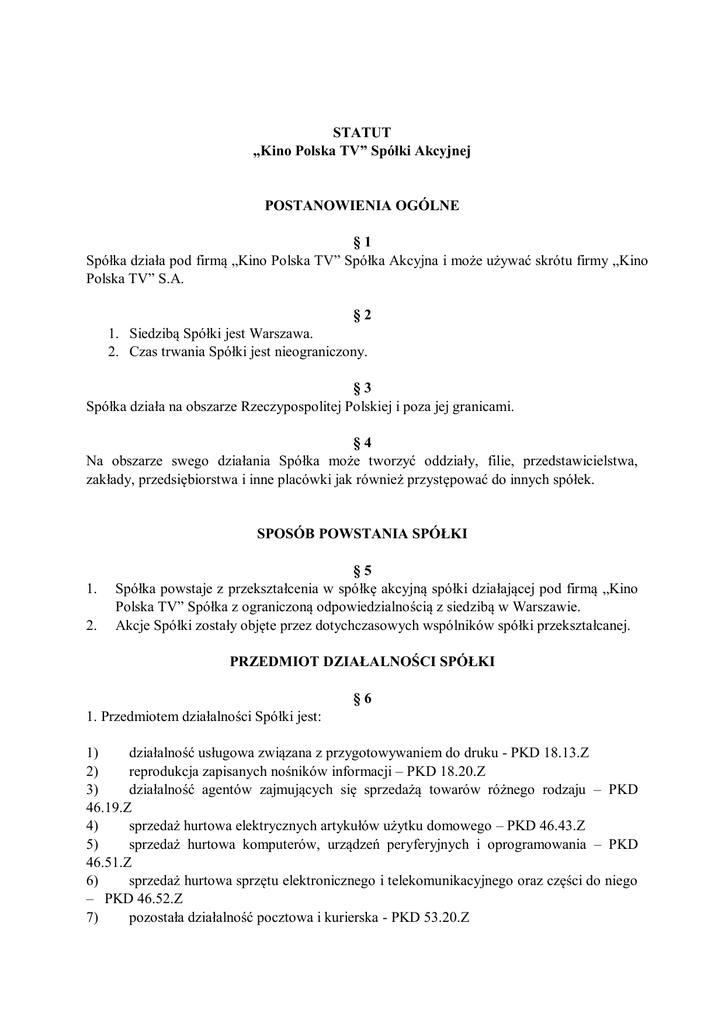 STATUT „Kino Polska TV” Spółki Akcyjnej POSTANOWIENIA OGÓLNE §1 Spółka działa pod firmą „Kino Polska TV” Spółka Akcyjna i może używać skrótu firmy „Kino Polska TV” S.A. §2 1. Siedzibą Spółki jest Warszawa. 2. Czas trwania Spółki jest nieograniczony. §3 Spółka działa na obszarze Rzeczypospolitej Polskiej i poza jej granicami. §4 Na obszarze swego działania Spółka może tworzyć oddziały, filie, przedstawicielstwa, zakłady, przedsiębiorstwa i inne placówki jak również przystępować do innych spółek. SPOSÓB POWSTANIA SPÓŁKI 1. 2. §5 Spółka powstaje z przekształcenia w spółkę akcyjną spółki działającej pod firmą „Kino Polska TV” Spółka z ograniczoną odpowiedzialnością z siedzibą w Warszawie. Akcje Spółki zostały objęte przez dotychczasowych wspólników spółki przekształcanej. PRZEDMIOT DZIAŁALNOŚCI SPÓŁKI §6 1. Przedmiotem działalności Spółki jest: 1) działalność usługowa związana z przygotowywaniem do druku - PKD 18.13.Z 2) reprodukcja zapisanych nośników informacji – PKD 18.20.Z 3) działalność agentów zajmujących się sprzedażą towarów różnego rodzaju – PKD 46.19.Z 4) sprzedaż hurtowa elektrycznych artykułów użytku domowego – PKD 46.43.Z 5) sprzedaż hurtowa komputerów, urządzeń peryferyjnych i oprogramowania – PKD 46.51.Z 6) sprzedaż hurtowa sprzętu elektronicznego i telekomunikacyjnego oraz części do niego – PKD 46.52.Z 7) pozostała działalność pocztowa i kurierska - PKD 53.20.Z 8) wydawanie książek - PKD 58.11.Z 9) wydawanie gazet - PKD 58.13.Z 10) wydawanie czasopism i pozostałych periodyków – PKD 58.14.Z 11) działalność związana z produkcją filmów, nagrań wideo i programów telewizyjnych – PKD 59.11.Z 12) działalność postprodukcyjna związana z filmami, nagraniami wideo i programami telewizyjnymi - PKD 59.12.Z 13) działalność związana z dystrybucją filmów, nagrań wideo i programów telewizyjnych – PKD 59.13.Z 14) działalność związana z projekcją filmów - PKD 59.14.Z 15) działalność w zakresie nagrań dźwiękowych i muzycznych - PKD 59.20.Z 16) nadawanie programów radiofonicznych – PKD 60.10.Z 17) nadawanie programów telewizyjnych ogólnodostępnych i abonamentowych - PKD 60.20.Z 18) działalność w zakresie telekomunikacji przewodowej – PKD 61.10.Z 19) działalność w zakresie telekomunikacji bezprzewodowej, z wyłączeniem telekomunikacji satelitarnej – PKD 61.20.Z 20) działalność w zakresie telekomunikacji satelitarnej – PKD 61.30.Z 21) działalność w zakresie pozostałej telekomunikacji – PKD 61.90.Z 22) działalność związana z oprogramowaniem - PKD 62.01.Z 23) działalność związana z doradztwem w zakresie informatyki - PKD 62.02.Z 24) działalność związana z zarządzaniem urządzeniami informatycznymi – 62.03.Z 25) pozostała działalność usługowa w zakresie technologii informatycznych i komputerowych – PKD 62.09.Z 26) przetwarzanie danych; zarządzanie stronami internetowymi (hosting) i podobna działalność – PKD 63.11.Z 27) działalność portali internetowych – PKD 63.12.Z 28) działalność agencji informacyjnych - PKD 63.91.Z 29) pozostała działalność usługowa w zakresie informacji, gdzie indziej niesklasyfikowana – PKD 63.99.Z 30) wynajem i zarządzanie nieruchomościami własnymi lub dzierżawionymi – PKD 68.20.Z 31) zarządzanie nieruchomościami wykonywane na zlecenie – PKD 68.32.Z 32) działalność rachunkowo-księgowa; doradztwo podatkowe – PKD 69.20.Z 33) działalność prawnicza – PKD 69.10.Z 34) działalność firm centralnych (head offices) i holdingów, z wyłączeniem holdingów finansowych – PKD 70.10.Z 35) pozostałe doradztwo w zakresie prowadzenia działalności gospodarczej i zarządzania – PKD 70.22.Z 36) stosunki międzyludzkie (public relations) i komunikacja – PKD 70.21.Z 37) pozostałe badania i analizy techniczne - PKD 71.20.B 38) działalność agencji reklamowych – 73.11.Z 39) pośrednictwo w sprzedaży czasu i miejsca na cele reklamowe w radio i telewizji – PKD 73.12.A 2 40) pośrednictwo w sprzedaży miejsca na cele reklamowe w mediach drukowanych – PKD 73.12.B 41) pośrednictwo w sprzedaży miejsca na cele reklamowe w mediach elektronicznych (Internet) - PKD 73.12.C 42) pośrednictwo w sprzedaży miejsca na cele reklamowe w pozostałych mediach - PKD 73.12.D 43) badanie rynku i opinii publicznej - PKD 73.20.Z 44) działalność w zakresie specjalistycznego projektowania – PKD 74.10.Z 45) działalność fotograficzna – PKD 74.20.Z 46) działalność związana z tłumaczeniami – PKD 74.30.Z 47) pozostała działalność profesjonalna, naukowa i techniczna, gdzie indziej niesklasyfikowana – PKD 74.90.Z 48) wynajem i dzierżawa samochodów osobowych i furgonetek – PKD 77.11.Z 49) wynajem i dzierżawa pozostałych pojazdów samochodowych, z wyłączeniem motocykli – PKD 77.12.Z 50) wypożyczanie kaset wideo, płyt CD, DVD itp. – PKD 77.22.Z 51) wynajem i dzierżawa maszyn i urządzeń biurowych, włączając komputery - PKD 77.33.Z 52) wynajem i dzierżawa pozostałych maszyn, urządzeń oraz dóbr materialnych, gdzie indziej niesklasyfikowane – PKD 77.39.Z 53) dzierżawa własności intelektualnej i podobnych produktów z wyłączeniem prac chronionych prawem autorskim – PKD 77.40.Z 54) działalność związana z wyszukiwaniem miejsc pracy i pozyskiwaniem pracowników – PKD 78.10.Z 55) pozostała działalność związana z udostępnianiem pracowników- PKD 78.30.Z 56) pozostała działalność usługowa w zakresie rezerwacji, gdzie indziej niesklasyfikowana – PKD 79.90.C 57) działalność usługowa związana z administracyjną obsługą biura – PK D 82.11.Z 58) wykonywanie fotokopii, przygotowywanie dokumentów i pozostała specjalistyczna działalność wspomagająca prowadzenie biura – PKD 82.19.Z 59) działalność centrów telefonicznych (call center) PKD 82.20.Z 60) działalność zwi