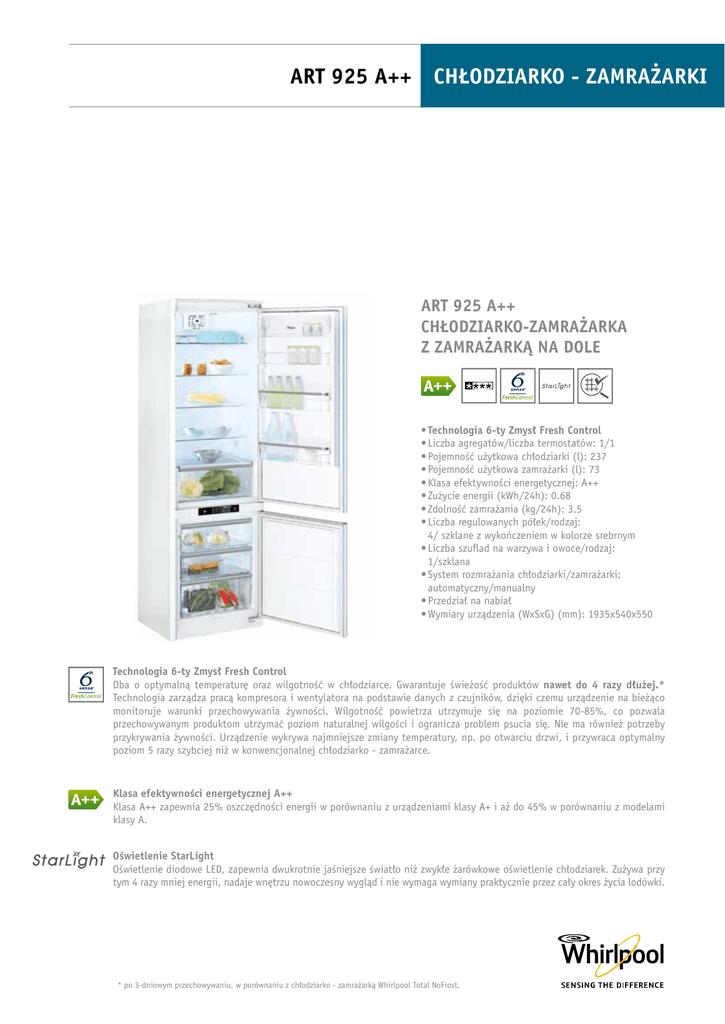 ART 925 A++ CHŁODZIARKO - ZAMRAŻARKI ART 925 a++ CHŁODZIARKO-ZAMRAŻARKA Z ZAMRAŻARKĄ NA DOLE •Technologia 6-ty Zmysł Fresh Control •Liczba agregatów/liczba termostatów: 1/1 •Pojemność użytkowa chłodziarki (l): 237 •Pojemność użytkowa zamrażarki (l): 73 •Klasa efektywności energetycznej: A++ •Zużycie energii (kWh/24h): 0.68 •Zdolność zamrażania (kg/24h): 3.5 •Liczba regulowanych półek/rodzaj: 4/ szklane z wykończeniem w kolorze srebrnym •Liczba szuflad na warzywa i owoce/rodzaj: 1/szklana •System rozmrażania chłodziarki/zamrażarki: automatyczny/manualny •Przedział na nabiał •Wymiary urządzenia (WxSxG) (mm): 1935x540x550 Technologia 6-ty Zmysł Fresh Control Dba o optymalną temperaturę oraz wilgotność w chłodziarce. Gwarantuje świeżość produktów nawet do 4 razy dłużej.* Technologia zarządza pracą kompresora i wentylatora na podstawie danych z czujników, dzięki czemu urządzenie na bieżąco monitoruje warunki przechowywania żywności. Wilgotność powietrza utrzymuje się na poziomie 70-85%, co pozwala przechowywanym produktom utrzymać poziom naturalnej wilgości i ogranicza problem psucia się. Nie ma również potrzeby przykrywania żywności. Urządzenie wykrywa najmniejsze zmiany temperatury, np. po otwarciu drzwi, i przywraca optymalny poziom 5 razy szybciej niż w konwencjonalnej chłodziarko - zamrażarce. Klasa efektywności energetycznej A++ Klasa A++ zapewnia 25% oszczędności energii w porównaniu z urządzeniami klasy A+ i aż do 45% w porównaniu z modelami klasy A. Oświetlenie StarLight Oświetlenie diodowe LED, zapewnia dwukrotnie jaśniejsze światło niż zwykłe żarówkowe oświetlenie chłodziarek. Zużywa przy tym 4 razy mniej energii, nadaje wnętrzu nowoczesny wygląd i nie wymaga wymiany praktycznie przez cały okres życia lodówki. * po 3-dniowym przechowywaniu, w porównaniu z chłodziarko - zamrażarką Whirlpool Total NoFrost. CHŁODZIARKO - ZAMRAŻARKI ART 925 A++ OZNACZENIE MODELU ART 925 A++ Typ chłodziarko-zamrażarki Technologia 6-ty Zmysł z zamrażarką na dole • DANE TECHNICZNE Wyświetlacz Liczba agregatów Liczba termostatów Oznaczenie gwiazdkowe (klasa zamrażania) Pojemność całkowita netto (l) Klasa efektywności energetycznej Zużycie energii (kWh/24h) Klasa klimatyczna Zdolność zamrażania (kg/24h) Czas utrzymania temperatury w przypadku braku zasilania Poziom hałasu (dB(A)) Wskaźnik wzrostu temperatury Elektrozawór LED 1 1 310 A++ 0.68 SN-T 3.5 15 35 - 1935 27 18 4 CHŁODZIARKA min. 50 m m 540 min 703,5 639,5 34 237 automatyczny • • • 5 4 szklane 1 szklany 4 • • • • - ZAMRAŻARKA 60 +0 560 +10 1935 1940 +10 0 1170,5 27 .555 550 Pojemność użytkowa chłodziarki (l) System rozmrażania chłodziarki Włącznik/ wyłącznik lodówki Szybkie chłodzenie Alarm otwartych drzwi Wewnętrzny wentylator Filtr antybakteryjny Wskaźnik bakteryjny (listeria) Komora Active 0° Liczba półek Liczba regulowanych pólek Rodzaj półek Liczba szuflad na owoce i warzywa Rodzaj pojemnika na owoce i warzywa Liczba balkoników Przedział na nabiał Separator na butelki Półki HydroSense Oświetlenie LED Saszetki Nature Fresh Pojemność użytkowa zamrażarki (l) Termostat System rozmrażania zamrażarki Funkcja szybkiego zamrażania Wskaźnik otwartych drzwi Liczba szuflad w zamrażarce Rodzaj szuflad w zamrażarce Tacka na kostki do lodu 73 manualny 3 plastikowe • WYMIARY Wymiary urządzenia (WxSxG) (mm) Wymiary niszy do instalacji (WxSxG) (mm) Możliwość obustronnego montażu drzwi Waga netto (kg) 1935x540x550 1940x560x555 • 58