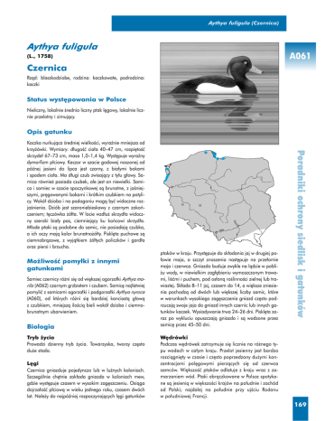 Aythya fuligula (Czernica) Aythya fuligula A061 (L., 1758) Czernica Rzàd: blaszkodziobe, rodzina: kaczkowate, podrodzina: kaczki Status wyst´powania w Polsce Nieliczny, lokalnie Êrednio liczny ptak l´gowy, lokalnie licznie przelotny i zimujàcy. Opis gatunku Mo˝liwoÊç pomy∏ki z innymi gatunkami Samiec czernicy ró˝ni si´ od wi´kszej ogorza∏ki Aythya marila (A062) czarnym grzbietem i czubem. Samic´ naj∏atwiej pomyliç z samicami ogorza∏ki i podgorza∏ki Aythya nyroca (A060), od których ró˝ni si´ bardziej kanciastà g∏owà z czubkiem, mniejszà iloÊcià bieli wokó∏ dzioba i ciemnobrunatnym ubarwieniem. Biologia Tryb ˝ycia Prowadzi dzienny tryb ˝ycia. Towarzyska, tworzy cz´sto du˝e stada. L´gi Czernica gniazduje pojedynczo lub w luênych koloniach. Szczególnie ch´tnie zak∏ada gniazda w koloniach mew, gdzie wyst´puje czasem w wysokim zag´szczeniu. Osiàga dojrza∏oÊç p∏ciowà w wieku jednego roku, czasem dwóch lat. Nale˝y do najpóêniej rozpoczynajàcych l´gi gatunków czernica ptaków w kraju. Przyst´puje do sk∏adania jaj w drugiej po∏owie maja, a szczyt znoszenia nast´puje na prze∏omie maja i czerwca. Gniazdo buduje zwykle na làdzie w pobli˝u wody, w niewielkim zag∏´bieniu wymoszczonym trawami, liÊçmi i puchem, pod os∏onà roÊlinnoÊci zielnej lub trawiastej. Sk∏ada 8–11 jaj, czasem do 14, a wi´ksze zniesienia pochodzà od dwóch lub wi´kszej liczby samic, które w warunkach wysokiego zag´szczenia gniazd cz´sto podrzucajà swoje jaja do gniazd innych czernic lub innych gatunków kaczek. Wysiadywanie trwa 24–26 dni. Piskl´ta zaraz po wykluciu opuszczajà gniazdo i sà wodzone przez samic´ przez 45–50 dni. Poradniki ochrony siedlisk i gatunków Kaczka nurkujàca Êredniej wielkoÊci, wyraênie mniejsza od krzy˝ówki. Wymiary: d∏ugoÊç cia∏a 40–47 cm, rozpi´toÊç skrzyde∏ 67–73 cm, masa 1,0–1,4 kg. Wyst´puje wyraêny dymorfizm p∏ciowy. Kaczor w szacie godowej noszonej od póênej jesieni do lipca jest czarny, z bia∏ymi bokami i spodem cia∏a. Ma d∏ugi czub zwisajàcy z ty∏u g∏owy. Samica równie˝ posiada czubek, ale jest on niewielki. Samica i samiec w szacie spoczynkowej sà brunatne, z jaÊniejszymi, pr´gowanymi bokami i krótkim czubkiem na potylicy. Wokó∏ dzioba i na podogoniu mogà byç widoczne rozjaÊnienia. Dziób jest szaroniebieskawy z czarnym zakoƒczeniem; t´czówka ˝ó∏ta. W locie wzd∏u˝ skrzyd∏a widoczny szeroki bia∏y pas, ciemniejàcy ku koƒcowi skrzyd∏a. M∏ode ptaki sà podobne do samic, nie posiadajà czubka, a ich oczy majà kolor brunatno˝ó∏ty. Piskl´ta puchowe sà ciemnobràzowe, z wyjàtkiem ˝ó∏tych policzków i gard∏a oraz piersi i brzucha. W´drówki Podczas w´drówek zatrzymuje si´ licznie na ró˝nego typu wodach w ca∏ym kraju. Przelot jesienny jest bardzo rozciàgni´ty w czasie i cz´sto poprzedzony du˝ymi koncentracjami pol´gowymi pierzàcych si´ od czerwca samców. Wi´kszoÊç ptaków odlatuje z kraju wraz z zamarzaniem wód. Ptaki obràczkowane w Polsce spotykane sà jesienià w wi´kszoÊci krajów na po∏udnie i zachód od Polski; najdalej na po∏udnie przy ujÊciu Rodanu w po∏udniowej Francji. 169 Ptaki (cz´Êç I) Poradniki ochrony siedlisk i gatunków A061 Przelot wiosenny odbywa si´ od ostatniej dekady lutego do po∏owy maja i cz´sto notowane sà dwa szczyty liczebnoÊci – w koƒcu marca i koƒcu kwietnia. Ptaki obecne w Polsce wiosnà, poza naszym krajem i krajami sàsiadujàcymi z Polskà od wschodu, majà swoje l´gowiska w pó∏nocnej Rosji, Finlandii, a nawet w Êrodkowo-zachodniej Syberii (obszar Tjumeƒski). Pierzenie samców ma miejsce od maja do lipca, a samic od czerwca do sierpnia. W´drówka samców na pierzowiska odbywa si´ w okresie inkubacji jaj przez samice. Koncentracje pierzàcych si´ ptaków si´gajà kilkuset osobników. Zimowanie Zimuje nad wodami zarówno morskimi, jak i Êródlàdowymi. W kraju najwa˝niejszym zimowiskiem jest rejon ujÊcia Odry wraz z jez. Dàbie. Ptaki obràczkowane w Polsce zim´ sp´dzajà w ró˝nych krajach europejskich (Niemcy, Dania, Szwecja, Holandia, Belgia, Wielka Brytania, Francja, Szwajcaria), a najdalej na po∏udniu – w Algierii. Pokarm Czernica ˝ywi si´ mieszanym pokarmem roÊlinno-zwierz´cym. Oprócz zielonych cz´Êci roÊlin wodnych i ich nasion, zjada znaczne iloÊci mi´czaków (zw∏aszcza racicznicy) i skorupiaków, które stanowià wa˝ny sk∏adnik pokarmu zimà. ˚eruje, g∏ównie nurkujàc (zwykle do g∏´bokoÊci 3 m), rzadziej zbierajàc pokarm z powierzchni wody. Wyst´powanie Siedlisko Wyst´puje g∏ównie nad wodami Êródlàdowymi, na stawach hodowlanych i jeziorach, zw∏aszcza tych z wyspami, na których gniazdujà mewy. W ostatnich latach zacz´∏a gniazdowaç w miejscach mniej typowych, np. na wyspach po∏o˝onych w nurcie rzek o naturalnym korycie, stawach pokopalnianych, zalanych wodà wyrobiskach i kamienio∏omach, osadnikach zak∏adów przemys∏owych, polach irygacyjnych, gliniankach, itp. Znane sà pierwsze przypadki gniazdowania na miejskich stawkach i jeziorkach. W okresie pozal´gowym zatrzymuje si´ na ró˝nego typu wodach Êródlàdowych oraz na wybrze˝u. Siedliska z za∏àcznika I Dyrektywy Siedliskowej, które mogà byç istotne dla gatunku 1110 Piaszczyste ∏awice podmorskie 1130 UjÊcia rzek (estuaria) 1150 Zalewy i jeziora przymorskie (laguny) 1160 Du˝e p∏ytkie zatoki 3140 Twardowodne oligo- i mezotroficzne zbiorniki z podwodnymi ∏àkami ramienic Charetea 3150 Starorzecza i naturalne eutroficzne zbiorniki wodne ze zbiorowiskami z Nymphaeion, Potamion 3160 Naturalne dystroficzne zbiorniki wodne 170 Rozmieszczenie geograficzne Czernica zamieszkuje pó∏nocnà cz´Êç Palearktyki od Islandii i Wielkiej Brytanii do Kamczatki; podgatunków nie wyró˝niono. W Europie Zachodniej jej rozmieszczenie jest nierównomierne, w Êrodkowej cz´Êci kontynentu i w Skandynawii wyst´puje powszechnie