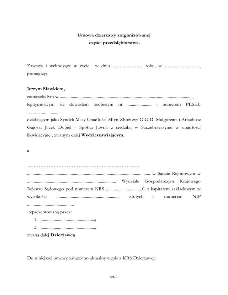 Umowa dzierżawy zorganizowanej części przedsiębiorstwa. Zawarta i wchodząca w życie w dniu ……………… roku, w …………………, pomiędzy: Jerzym Sławkiem, zamieszkałym w ........................................................................................ .................................., legitymującym sie dowodem osobistym nr ....................., i numerem PESEL ……….............., działającym jako Syndyk Masy Upadłości Młyn Zbożowy G.G.D. Małgorzata i Arkadiusz Gajosz, Jacek Dubiel - Spółka Jawna z siedzibą w Szczebrzeszynie w upadłości likwidacyjnej, zwanym dalej Wydzierżawiającym, a ………………………………………………………….. ................................................................................................................. w Sądzie Rejonowym w .................................................................................. Wydziale Gospodarczym Krajowego Rejestru Sądowego pod numerem KRS .................................0, z kapitałem zakładowym w wysokości .......................................................... złotych i ........................................... reprezentowaną przez: 1. ..................................................; 2. ..................................................; zwaną dalej Dzierżawcą Do niniejszej umowy załączono aktualny wypis z KRS Dzierżawcy. str. 1 numerem NIP Preambuła Zważywszy, że Sąd Rejonowy V Wydział Gospodarczy ogłosił w dniu 31 maja 2010r. upadłość obejmująca likwidację majątku Młyn Zbożowy G.G.D. Małgorzata i Arkadiusz Gajosz, Jacek Dubiel - Spółka Jawna z siedzibą w Szczebrzeszynie w upadłości likwidacyjnej, zarejestrowanej pod numerem KRS .............................., w ramach prowadzonego postępowania upadłościowego, strony niniejszej umowy postanowiły zawrzeć umowę następującej treści: §1 1. Wydzierżawiający daje w dzierżawę a Dzierżawca przyjmuje w dzierżawę „Przedsiębiorstwo” w rozumieniu art.55 lit.1 Kodeksu Cywilnego, działającego jako Młyn Zbożowy G.G.D. Małgorzata i Arkadiusz Gajosz, Jacek Dubiel Spółka Jawna z siedzibą w Szczebrzeszynie w upadłości likwidacyjnej, zwane dale w treści umowy – Przedsiębiorstwem.. 2. Dzierżawca wyraża zainteresowanie zakupem w przyszłości całości przedsiębiorstwa w rozumieniu art.55 lit.1 Kodeksu Cywilnego, działającego jako Młyn Zbożowy G.G.D. Małgorzata i Arkadiusz Gajosz, Jacek Dubiel - Spółka Jawna z siedzibą w Szczebrzeszynie w upadłości likwidacyjnej. 3. §2 1. Przedmiotem dzierżawy jest całość Przedsiębiorstwa w rozumieniu Art. 55 lit. 1 Kodeksu Cywilnego, z wyłączeniem: 1.1 Ksiąg rachunkowych i dokumentacji rachunkowej i korporacyjnej. 1.2 Roszczeń majątkowych wobec osób trzecich i związanej z tym dokumentacji. str. 2 1.3 Dokumentacji osobowej pracowników, którzy zakończyli pracę w przedsiębiorstwie Wydzierżawiającego, przed dniem podpisania niniejszej umowy. 1.4 Pieniędzy w kasie, środków na rachunkach bankowych i należności. 2. Wydzierżawiający zobowiązuje się przekazać Dzierżawcy przedsiębiorstwo najpóźniej w dniu .......................... , poprzez sporządzenie protokołu zdawczo – odbiorczego. 3. Protokół zdawczo odbiorczy stanowić będzie załącznik do niniejszej umowy i szczegółowo będzie określał przedmiot dzierżawy. §3 1. Strony niniejszej umowy ustalają, iż miesięczny czynsz z tytułu dzierżawy zorganizowanej części przedsiębiorstwa będzie wynosił ……….. zł + 22% podatku VAT i będzie wymagalny z góry, przy rozpoczęciu każdego miesiąca trwania niniejszej umowy. 2. Czynsz będzie płatny do każdego 5 dnia miesiąca trwania niniejszej umowy, po uprzednim wystawianiu faktury VAT i doręczeniu jej do siedziby Dzierżawcy. Faktury doręczone po upływie 5 dnia miesiąca, będą płatne w terminie 2 dni od daty doręczenia faktury. 3. Dzierżawca zobowiązuje się zapłacić Wydzierżawiającemu depozyt w wysokości jednomiesięcznego czynszu, z którego Wydzierżawiający ma prawo potrącać odsetki od czynszów nie zapłaconych w terminie, na co Dzierżawca wyraża zgodę. §4 1. W przypadku zwłoki w zapłacie czynszu, Wydzierżawiającemu należne będą odsetki ustawowe do dnia zapłaty. 2. Jeśli zwłoka w zapłacie przekroczy 30 dni, wówczas Wydzierżawiający ma prawo do natychmiastowego odstąpienia od umowy i zatrzymania kaucji wymienionej w pkt. 3 par. 3. 3. Dzierżawca, w przypadku odstąpienia od umowy przez Wydzierżawiającego na skutek braku zapłaty, zobowiązuje się do pokrycia wszelkich kosztów, jakie str. 3 może ponieść Wydzierżawiający, w związku odebraniem przedmiotu dzierżawy od Dzierżawcy. §5 1. Niniejsza umowa zostaje zawarta na czas nieokreślony z 3 miesięcznym okresem wypowiedzenia, przypadającym na koniec miesiąca kalendarzowego. 2. Dzierżawca przyjmuje do wiadomości, iż znany jest mu stan techniczny urządzeń młynarskich, które są w pełni sprawne. Jednocześnie zobowiązuje się do utrzymywania ich w pełnej sprawności i przy zakończeniu niniejszej umowy Dzierżawca zobowiązuje się do zwrotu w stanie niepogorszonym, stanowiącym technologiczną całość, umożliwiającą działanie pełnej linii młynarskiej z wydajności nie mniejszą niż 40 ton / dobę ( system 3 zmianowy). 3. Powierzone w ramach niniejszej umowy pomieszczenia i urządzenia Dzierżawca przyjmuje jako sprawne i kompletne. Jednocześnie zobowiązuje się do utrzymywania ich w pełnej sprawności i przy zakończeniu niniejszej umowy Dzierżawca zobowiązuje się do zwrotu w stanie niepogorszonym. §6 1. W okresie obowiązywania niniejszej Umowy Dzierżawca jest zobowiązany do: 1.1 Opłacania rachunków za energię elektryczną, na podstawie 100% re faktury od Wydzierżawiającego, do której załączona będzie kopia faktury obciążającej Wydzierżawiającego. 1.2 Opłacania rachunków za gaz, na podstawie 100% r