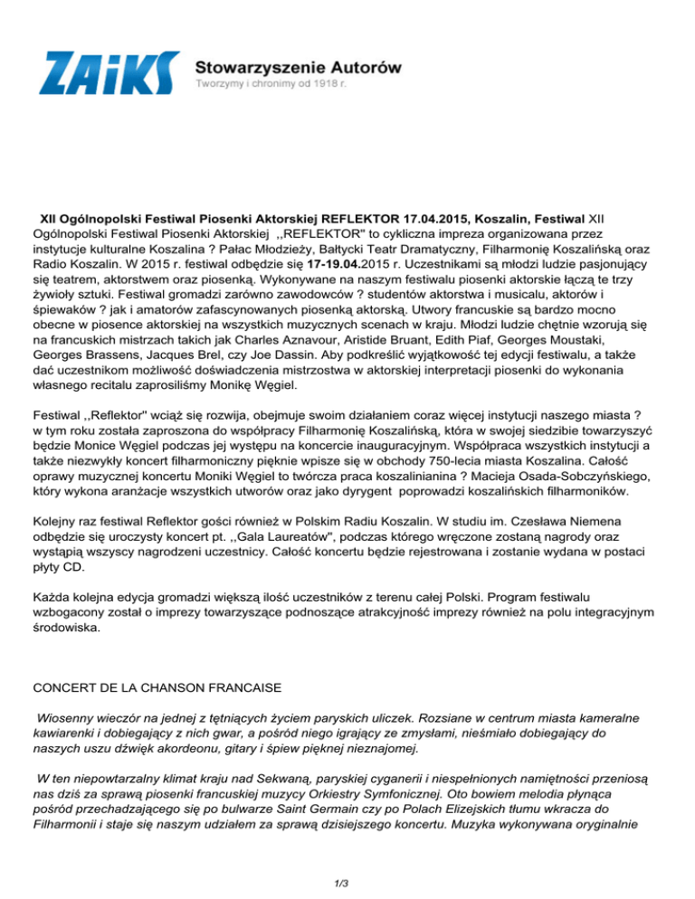 XII Ogólnopolski Festiwal Piosenki Aktorskiej REFLEKTOR 17.04.2015, Koszalin, Festiwal XII Ogólnopolski Festiwal Piosenki Aktorskiej ,,REFLEKTOR'' to cykliczna impreza organizowana przez instytucje kulturalne Koszalina ? Pałac Młodzieży, Bałtycki Teatr Dramatyczny, Filharmonię Koszalińską oraz Radio Koszalin. W 2015 r. festiwal odbędzie się 17-19.04.2015 r. Uczestnikami są młodzi ludzie pasjonujący się teatrem, aktorstwem oraz piosenką. Wykonywane na naszym festiwalu piosenki aktorskie łączą te trzy żywioły sztuki. Festiwal gromadzi zarówno zawodowców ? studentów aktorstwa i musicalu, aktorów i śpiewaków ? jak i amatorów zafascynowanych piosenką aktorską. Utwory francuskie są bardzo mocno obecne w piosence aktorskiej na wszystkich muzycznych scenach w kraju. Młodzi ludzie chętnie wzorują się na francuskich mistrzach takich jak Charles Aznavour, Aristide Bruant, Edith Piaf, Georges Moustaki, Georges Brassens, Jacques Brel, czy Joe Dassin. Aby podkreślić wyjątkowość tej edycji festiwalu, a także dać uczestnikom możliwość doświadczenia mistrzostwa w aktorskiej interpretacji piosenki do wykonania własnego recitalu zaprosiliśmy Monikę Węgiel. Festiwal ,,Reflektor'' wciąż się rozwija, obejmuje swoim działaniem coraz więcej instytucji naszego miasta ? w tym roku została zaproszona do współpracy Filharmonię Koszalińską, która w swojej siedzibie towarzyszyć będzie Monice Węgiel podczas jej występu na koncercie inauguracyjnym. Współpraca wszystkich instytucji a także niezwykły koncert filharmoniczny pięknie wpisze się w obchody 750-lecia miasta Koszalina. Całość oprawy muzycznej koncertu Moniki Węgiel to twórcza praca koszalinianina ? Macieja Osada-Sobczyńskiego, który wykona aranżacje wszystkich utworów oraz jako dyrygent poprowadzi koszalińskich filharmoników. Kolejny raz festiwal Reflektor gości również w Polskim Radiu Koszalin. W studiu im. Czesława Niemena odbędzie się uroczysty koncert pt. ,,Gala Laureatów'', podczas którego wręczone zostaną nagrody oraz wystąpią wszyscy nagrodzeni uczestnicy. Całość koncertu będzie rejestrowana i zostanie wydana w postaci płyty CD. Każda kolejna edycja gromadzi większą ilość uczestników z terenu całej Polski. Program festiwalu wzbogacony został o imprezy towarzyszące podnoszące atrakcyjność imprezy również na polu integracyjnym środowiska. CONCERT DE LA CHANSON FRANCAISE Wiosenny wieczór na jednej z tętniących życiem paryskich uliczek. Rozsiane w centrum miasta kameralne kawiarenki i dobiegający z nich gwar, a pośród niego igrający ze zmysłami, nieśmiało dobiegający do naszych uszu dźwięk akordeonu, gitary i śpiew pięknej nieznajomej. W ten niepowtarzalny klimat kraju nad Sekwaną, paryskiej cyganerii i niespełnionych namiętności przeniosą nas dziś za sprawą piosenki francuskiej muzycy Orkiestry Symfonicznej. Oto bowiem melodia płynąca pośród przechadzającego się po bulwarze Saint Germain czy po Polach Elizejskich tłumu wkracza do Filharmonii i staje się naszym udziałem za sprawą dzisiejszego koncertu. Muzyka wykonywana oryginalnie 1/3 na kilku instrumentach zostanie wzbogacona, niemożliwymi do zagrania w ulicznej codzienności, kwestiami kilkunastu instrumentów. I właśnie z tego względu jest to koncert niezwykły ? ogromne możliwości jakie daje Orkiestra Symfoniczna wykorzystane zostaną bowiem do wykonania muzyki niesymfonicznej. Orkiestrze tej dyrygować będzie Maciej Osada-Sobczyński, który jest zarazem autorem aranżacji oraz dyrektorem artystycznym rozpoczynającego się wraz z niniejszym koncertem XII Ogólnopolskiego Festiwalu Piosenki Aktorskiej REFLEKTOR. Dodatkowo oczekiwać Państwo mogą genialnych, efektownych i mieniących się barwami francuskiej flagi, interpretacji aktorskich w wykonaniu gwiazdy tegorocznej edycji festiwalu, którą jest Monika Węgiel. Atrakcją wieczoru będzie również gościnny występ wybitnego akordeonisty Marcina Krzyżanowskiego. Prosimy więc przenieść się już teraz oczyma wyobraźni do Paryża i raczyć się każdą nutą melodii z repertuaru artystów takich, jak Edith Piaf, Charles Aznavour czy Jacques Brel. Przed Państwem niezapomniany wieczór z piosenką francuską! Program koncertu: ,,Cyganeria'' (,,La Boheme''), ,,Bez miłości nie ma nic'' (,,La Goualante Du Pauvre Jean''), ,,Martwe liście'' (,,Les feuilles mortes''), ,,Nie opuszczaj mnie,'' (,,Ne me quitte pas''), ,,Piosenka starych kochanków'' (,,La chanson des vieux amants''), ,,Życie na różowo'', (,,La vie en rose''), ,,Czekanie me to ty, (,,Je N'Attendais Que Vous'') , ,,Nic a nic'' (,,Non, Je Ne Regrette Rien''), ,,Akordeonista'' (,,L'accordeoniste''), ,,Padam, padam'', ,,Tłum'' (,,La foule'') ,,Hymn miłości'' (,,L'hymne a l'amour'') ,,Miłość i więcej nic'' (,,Quand on a que l'amour'') ? wróć do listy wydarzeń Wszelkie prawa zastrzeżone 2017 ZAiKS / data wygenerowania strony 01.03.2017 21:53:31 2/3 PDF ze strony: http://zaiks.org.pl/wydarzenia,329 3/3