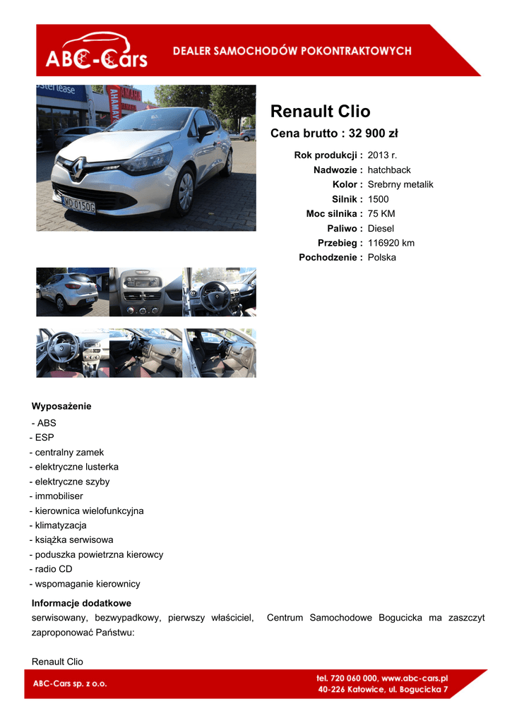 Renault Clio Cena brutto : 32 900 zł Rok produkcji : 2013 r. Nadwozie : hatchback Kolor : Srebrny metalik Silnik : 1500 Moc silnika : 75 KM Paliwo : Diesel Przebieg : 116920 km Pochodzenie : Polska Wyposażenie - ABS - ESP - centralny zamek - elektryczne lusterka - elektryczne szyby - immobiliser - kierownica wielofunkcyjna - klimatyzacja - książka serwisowa - poduszka powietrzna kierowcy - radio CD - wspomaganie kierownicy Informacje dodatkowe serwisowany, bezwypadkowy, pierwszy właściciel, zaproponować Państwu: Renault Clio Centrum Samochodowe Bogucicka ma zaszczyt Numer rej. WD0150G Numer VIN VF15R040H48584490 Datę 1. rej. 07-05-2013 Silnik: 1.5 dCi 75KM Diesel Przebieg: 116 913 km Auto krajowe, zakupione w polskim salonie. Samochód jest sprzedawany na fakturę VAT 23% z zapisaną roczną rękojmią. Cena Brutto 35 670 Cena Netto 29 000 Pojazd w stanie idealnym zewnątrz oraz wewnątrz. Przy przebiegu 112 800 km ( 2016-07-05 ) został wykonany przegląd okresowy Wymiana tulei hahaczy i geometria zawieszenia Przy przebiegu 90 170 km ( 2015-12-11 ) został wykonany przegląd okresowy Olej + filtry, klocki przód ABS, ASR - system zapobiegający poślizgowi kół podczas przyspieszania Airbag - 4 sztuki (czołowe poduszki kierowcy i pasażera, boczne poduszki - przód) Czujnik zapięcia pasa bezpieczeństwa kierowcy EBV-elektroniczny rozdział sił hamowania ESP - układ stabilizacji toru jazdy El. podnoszenie szyb, przód Immobilizer Karta Renault Komputer pokładowy Lusterka boczne ustawiane elektrycznie Pasy bezpieczeństwa z napinaczami, przód System wspomagania nagłego hamowania System wspomagania ruszania na wzniesieniu Tempomat Tylny spojler dachowy w kolorze nadwozia Uchwyty ISOFIX na tylnych siedzieniach Wspomaganie układu kierowniczego Zamek centralny z pilotem Światła do jazdy dziennej LED (diodowe) Koło zapasowe Lakier metalik Alarm Wszelkich informacji na temat pojazdu udzielą handlowcy pod numerem telefonu: ( 32 441 71 11 ) Zapraszamy do jazdy próbnej i sprawdzenia auta na serwisie. Wszystkie oferowane przez Nas auta, - pochodzą z krajowej sieci dealerskiej, - są serwisowane w autoryzowanych stacjach obsługi, - w bieżącej ofercie handlowej oferujemy ponad 100 używanych samochodów o udokumentowanej historii napraw i przeglądów, - w stałej ofercie posiadamy pełny wybór aut, zarówno pod względem marek, modeli, jak i przebiegów, - z możliwością zakupu za gotówkę lub w leasing, - z możliwością finansowania z Pakietem serwisowo-gwarancyjnym - z możliwością odliczenia VAT ( pełna faktura VAT). Firma ABC-CARS Sp. z o.o., to prężnie rozwijający się, dealer samochodów używanych na terenie Górnego Śląska. Zapraszamy do odwiedzenia Naszej strony internetowej Master1.otomoto.pl. Jesteśmy tak pewni naszych samochodów, że naszym klientom gwarantujemy ich ponowne nabycie jeśli zdecydują się ponownie skorzystać z naszych usług. Co oznacza, że posiadamy centrum samochodowe? U nas można nie tylko kupić samochód. Oferujemy pomoc w kredycie, leasingu i ubezpieczeniu, doposażenie auta w interesujące ich akcesoria już w momencie zakupu, bieżącą obsługę serwisową oraz likwidowanie szkód komunikacyjnych. Zapraszamy do naszego centrum samochodowego w Katowicach na ulicy Bogucickiej 7. Niniejsze ogłoszenie jest wyłącznie informacją handlową i nie stanowi oferty w myśl art. 66, § 1. Kodeksu Cywilnego. Sprzedający nie odpowiada za ewentualne błędy lub nieaktualność ogłoszenia.