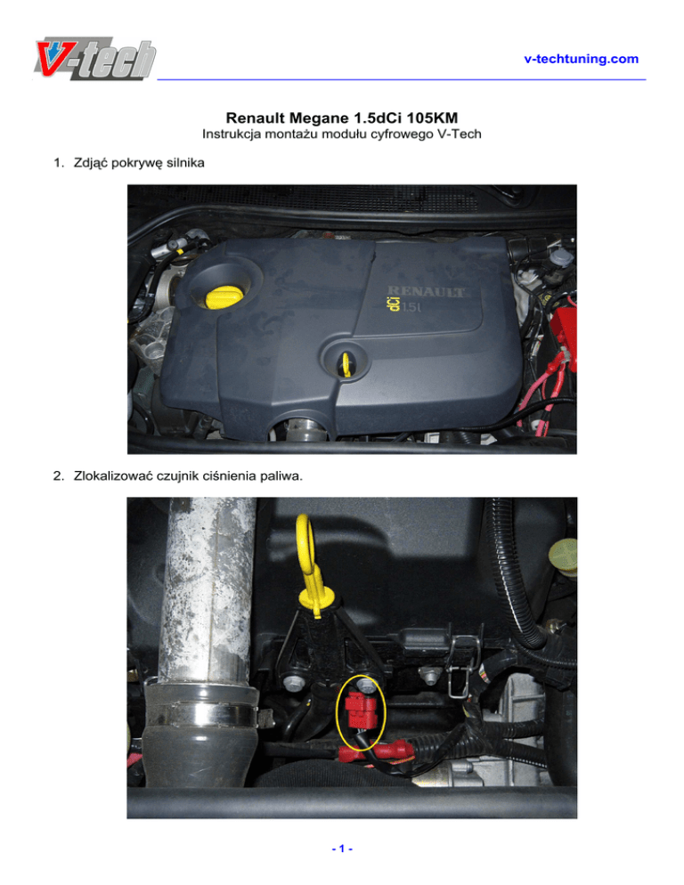 v-techtuning.com ________________________________________________________________________________ Renault Megane 1.5dCi 105KM Instrukcja montażu modułu cyfrowego V-Tech 1. Zdjąć pokrywę silnika 2. Zlokalizować czujnik ciśnienia paliwa. -1- v-techtuning.com ________________________________________________________________________________ 3. Wypiąć wtyczkę z czujnika ciśnienia paliwa 4. Pomiędzy wypiętą wtyczkę i czujnik ciśnienia paliwa wpiąć adapter modułu. -2- v-techtuning.com ________________________________________________________________________________ 5. Zamontować moduł w miejscu nie narażonym na działanie wody i wysokiej temperatury. Przymocować wiązkę modułu celem zabezpieczenia jej przed uszkodzeniem przez elementy ruchome silnika. -3-