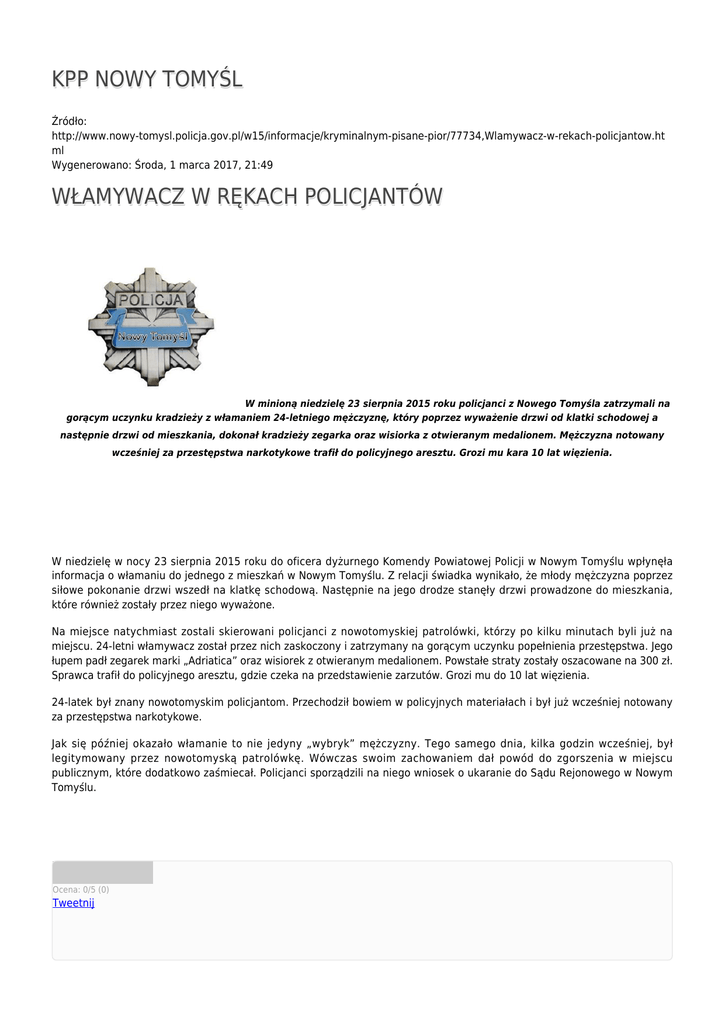 KPP NOWY TOMYŚL Źródło: http://www.nowy-tomysl.policja.gov.pl/w15/informacje/kryminalnym-pisane-pior/77734,Wlamywacz-w-rekach-policjantow.ht ml Wygenerowano: Środa, 1 marca 2017, 21:49 WŁAMYWACZ W RĘKACH POLICJANTÓW W minioną niedzielę 23 sierpnia 2015 roku policjanci z Nowego Tomyśla zatrzymali na gorącym uczynku kradzieży z włamaniem 24-letniego mężczyznę, który poprzez wyważenie drzwi od klatki schodowej a następnie drzwi od mieszkania, dokonał kradzieży zegarka oraz wisiorka z otwieranym medalionem. Mężczyzna notowany wcześniej za przestępstwa narkotykowe trafił do policyjnego aresztu. Grozi mu kara 10 lat więzienia. W niedzielę w nocy 23 sierpnia 2015 roku do oficera dyżurnego Komendy Powiatowej Policji w Nowym Tomyślu wpłynęła informacja o włamaniu do jednego z mieszkań w Nowym Tomyślu. Z relacji świadka wynikało, że młody mężczyzna poprzez siłowe pokonanie drzwi wszedł na klatkę schodową. Następnie na jego drodze stanęły drzwi prowadzone do mieszkania, które również zostały przez niego wyważone. Na miejsce natychmiast zostali skierowani policjanci z nowotomyskiej patrolówki, którzy po kilku minutach byli już na miejscu. 24-letni włamywacz został przez nich zaskoczony i zatrzymany na gorącym uczynku popełnienia przestępstwa. Jego łupem padł zegarek marki „Adriatica” oraz wisiorek z otwieranym medalionem. Powstałe straty zostały oszacowane na 300 zł. Sprawca trafił do policyjnego aresztu, gdzie czeka na przedstawienie zarzutów. Grozi mu do 10 lat więzienia. 24-latek był znany nowotomyskim policjantom. Przechodził bowiem w policyjnych materiałach i był już wcześniej notowany za przestępstwa narkotykowe. Jak się później okazało włamanie to nie jedyny „wybryk” mężczyzny. Tego samego dnia, kilka godzin wcześniej, był legitymowany przez nowotomyską patrolówkę. Wówczas swoim zachowaniem dał powód do zgorszenia w miejscu publicznym, które dodatkowo zaśmiecał. Policjanci sporządzili na niego wniosek o ukaranie do Sądu Rejonowego w Nowym Tomyślu. Ocena: 0/5 (0) Tweetnij