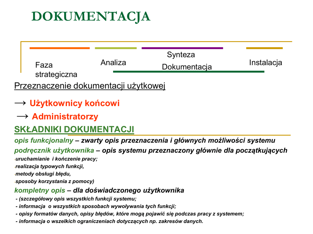 DOKUMENTACJA Synteza Faza strategiczna Analiza Dokumentacja Instalacja Przeznaczenie dokumentacji użytkowej → Użytkownicy końcowi → Administratorzy SKŁADNIKI DOKUMENTACJI opis funkcjonalny – zwarty opis przeznaczenia i głównych możliwości systemu podręcznik użytkownika – opis systemu przeznaczony głównie dla początkujących -uruchamianie i kończenie pracy; -realizacja typowych funkcji, -metody obsługi błędu, -sposoby korzystania z pomocy) kompletny opis – dla doświadczonego użytkownika - (szczegółowy opis wszystkich funkcji systemu; - informacja o wszystkich sposobach wywoływania tych funkcji; - opisy formatów danych, opisy błędów, które mogą pojawić się podczas pracy z systemem; - informacja o wszelkich ograniczeniach dotyczących np. zakresów danych. DOKUMENTACJA opis instalacji – składowa dokumentacji dla administratora zawierająca procedury instalacji i dostrajania systemu do środowiska implementacyjnego podręcznik administratora systemu – opis możliwości zmian konfiguracji systemu i sposoby udostępniania systemu użytkownikom końcowym słownik używanych terminów Indeks Forma dokumentacji użytkowej - drukowana - elektroniczna – możliwości hipertekstu pozwalają na umieszczenie na poszczególnych stronach odwołań do powiązanych opisów, na ogół dokumentacja szczegółowa – dzisiaj również podstawowa. Jakość dokumentacji użytkowej (na jakość ma wpływ) - struktura – podręczniki czytelne, zrozumiałe z odpowiednim podziałem na rozdziały i podrozdziały - zachowanie standardów – spójna struktura, forma i sposób pisania - sposób pisania – stosowanie formy aktywnej ..na ekranie zobaczysz…… poprawność gramatyczna i ortograficzna; krótkie zdania; krótkie akapity; oszczędność słów precyzyjna definicja używanych terminów, powtarzanie trudnego opisu, tytuły i podtutuły; zrozumiałe odwołania do innych rozdziałów TESTOWANIE ATESOWANIE (VALIDATION) – testowanie zgodności systemu z rzeczywistymi potrzebami użytkownika WERYFIKACJA (VERIFICATION) – testowanie zgodności systemu z wymaganiami zdefiniowanymi w fazie wymagań CELE TESTOWANIA - wykrycie i usunięcie błędów w systemie - ocena niezawodności systemu Błąd – niepoprawna konstrukcja w programie mogąca prowadzić do niewłaściwego działania Błędne wykonanie niepoprawne działanie systemu w trakcie jego pracy TESTY (rodzaje z punktu widzenia szukania błędów) - testy statystyczne – wykrycie przyczyn najczęstszych błędnych wykonań oraz ocena niezawodności systemu – wykrycie jak największej liczby błędów - wykrywanie błędów TESTY (rodzaje z punktu widzenia technik wykonywania testów) - testy dynamiczne – wykonywanie programu (fragmentu) i porównywanie wyników - testy statyczne – bazują na analizie kodu FAZY TESTOWANIA - testy modułów - testy systemu - testy akceptacji; testy alfa (indywidualny) testy beta (rynek) TESTY STATYSTYCZNE Przebiegają wg schematu: - losowa konstrukcja danych wejściowych (zgodna z rozkładem prawdopodobieństwa tych danych - określenie poprawnego wyniku dla tych danych - uruchomienie systemu i porównania Zalety testów statystycznych – możliwość automatyzacji wynikająca z RP Wyniki testów – prawdopodobieństwo błędnego wykonania podczas realizacji transakcji - częstotliwość występowania błędnych wykonań - średni czas miedzy błędami wykonanymi - dostępność – czas wolny od realizacji zlecenia BŁĘDY – poszukiwanie przyczyny – usuwanie przyczyny – wzrost wydajności systemu Szacowanie Niezawodności systemu Logarytmiczny model niezawodności Niezawodność = Niezawodność początkowa * exp (-C * liczba testów) C – jest stałą zależną od konkretnego systemu. Jeżeli dane testowe nie są dobierane losowo lecz za każdym razem inne (ręczne sterowanie) Niezawodność = Niezawodność początkowa -D * liczba testów WYKRYWANIE BŁĘDÓW TESTY FUNKCJONALNE - system jest czarną skrzynką i są sprawdzane kolejne funkcjonalmości (black box tests) TESTY STRUKTURALNE – zakładają znajomość funkcji testowych i są sprawdzane kolejne funkcjonalmości (white box tests) TF. Podział danych wejściowych na klasy na podstawie opisu wymagań – konieczne testowanie dl wartości granicznych TS. Dobór danych wejściowych na podstawie analizy struktury programu przy zastosowaniu różnorodnych kryteriów: kryterium pokrycia wszystkich instrukcji – tak dobrane dane aby każda instrukcja wykonana była co najmniej raz (warunki) kryterium pokrycia instrukcji warunkowych – tak dobrane dane aby każdy elementarny warune instrukcji warunkowej został co najmniej raz spełniony i co najmniej raz niespełniony. TESTY STATYCZNE Analiza kodu bez uruchamiania programu Stosowane techniki – testy poprawności (udowodnianie formalnej poprawności fragmentu oprogramowania jest o rząd trudniejsze od jego opracowania!! - metody nieformalne (analiza kodu przez programistów w kierunku: - śledzenia przebiegu programu – trace?, bugger? - wyszukiwanie typowych błędów: ● niezainincjowane zmienne ● porównanie liczb zmiennopozycyjnych ● indeksy wykraczające poza tablice ● błędne operacje na wskaźnikach ● błędy w warunkach instrukcji warunkowych ● niekończące się pętle ● błędy popełnione dla wartości granicznych – kontrola warunku silnego i słabego ● błędne użycie lub pominięcie nawiasów w złożonych typach – konstrukcja wyraże ● nieuwzględnienie błędnych danych testy funkcjonalne są pewniejsze od testów strukturalnych. OCENA LICZBY BŁĘDÓW Ma bezpośredni wpływ na koszty konserwacji oprogramowania: ● szacunkowa liczba błędów w programie ● średni procent błędów zgłaszanych przez użytkownika ● średni koszt usunięcia błędu Szacowanie liczby błędów: - technika posiewania błędów N – liczba wprowadzonych błędów, M – liczba wszystkich wykrytych błędów, X – liczba wprowa