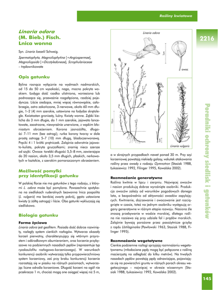 RoÊliny kwiatowe Linaria odora (M. Bieb.) Fisch. Lnica wonna Linaria odora 2216 1cm Syn. Linaria loeselii Schweig. Spermatophyta, Magnoliophytina [=Angiospermae], Magnoliopsida [=Dicotyledoneae], Scrophulariaceae – tr´downikowate owoc Mo˝liwoÊç pomy∏ki przy identyfikacji gatunku W polskiej florze nie ma gatunków z tego rodzaju, z którymi L. odora mo˝e byç pomylona. Powszechnie spotykana na siedliskach ruderalnych bezwonna lnica pospolita (L. vulgaris) ma bardziej zwarty pokrój, g´sto ustawione kwiaty (z ˝ó∏tà ostrogà) i liÊcie. Oba gatunki wykluczajà si´ siedliskowo. Biologia gatunku Forma ˝yciowa Linaria odora jest geofitem. Posiada doÊç dobrze rozwini´ty, rozleg∏y system cienkich roz∏ogów. Wytwarza okaza∏y korzeƒ pierwotny, charakteryzujàcy si´ wtórnym przyrostem i odÊrodkowym obumieraniem, oraz korzenie przybyszowe na podziemnych nasadach p´dów (reprezentuje typ ryzokaulofitu roz∏ogowo-korzeniowego). W warunkach konkurencji osobniki wytwarzajà tylko przypowierzchniowy system korzeniowy, zaÊ przy braku konkurencji korzenie rozrastajà si´ w piasku na ró˝nych poziomach, wytwarzajàc liczne odroÊla korzeniowe. D∏ugoÊç korzeni na ogó∏ nie przekracza 1 m, chocia˝ mogà one osiàgaç wi´cej ni˝ 5 m, 1cm 10cm Linaria vulgaris a w skrajnych przypadkach nawet ponad 30 m. Przy szyi korzeniowej powstajà niekiedy galasy, wskutek atakowania roÊliny przez owady z rodzaju Gymnotron (Stasiak 1988, ¸ukasiewicz 1992, Filinger 1995, Kowalska 2002). Rozmna˝anie generatywne RoÊlina kwitnie w lipcu i sierpniu. Najwi´cej owoców i nasion produkujà dobrze wyroÊni´te osobniki. Produkcja owoców zale˝y od warunków pogodowych danego lata, a bezpoÊrednio od aktywnoÊci owadów zapylajàcych. Kwitnienie, dojrzewanie i owocowanie jest rozciàgni´te w czasie, tote˝ na jednym osobniku wyst´pujà organy generatywne w ró˝nym etapie rozwoju. Nasiona êle znoszà przebywanie w wodzie morskiej, dlatego roÊlina nie rozsiewa si´ przy udziale fal i pràdów morskich. Zalà˝nie bywajà pora˝one przez paso˝ytnicze grzyby z rz´du Ustilaginales (Paw∏owski 1963, Stasiak 1988, Filinger 1995). Poradniki ochrony siedlisk i gatunków Bylina rosnàca wy∏àcznie na wydmach nadmorskich, od 15 do 50 cm wysokoÊci, naga, mocno pokryta woskiem. ¸odyga doÊç rzadko ulistniona, wzniesiona lub podnoszàca si´, przewa˝nie rozga∏´ziona, rzadziej pojedyncza. LiÊcie siedzàce, mniej wi´cej równowàskie, ca∏obrzegie, ostro zakoƒczone, 3-nerwowe, oko∏o 60 mm d∏ugie, 1–2 (4) mm szerokie, ustawione na ∏odydze skr´tolegle. Kwiatostan groniasty, luêny. Kwiaty wonne. Zàbki kielicha do 3 mm d∏ugie, do 1 mm szerokie, jajowato lancetowate, zaostrzone, niewyraênie unerwione, z wàskim b∏oniastym obrze˝eniem. Korona jasno˝ó∏ta, d∏ugoÊci 7–11 mm (bez ostrogi); rurka korony tworzy w dole prostà ostrog´ 5–7 (10) mm d∏ugà, bladoczerwonawà. Pr´ciki 4 i 1 krótki pràtniczek. Zalà˝nia odwrotnie jajowato-kulista, pokryta gruczo∏kami; znami´ nieco szersze od szyjki. Owoce: torebki d∏ugoÊci 5,5–8 mm, zawierajàce do 20 nasion, oko∏o 3,5 mm d∏ugich, p∏askich, nerkowatych w kszta∏cie, z szerokim pomarszczonym obrze˝eniem. 1cm Opis gatunku Rozmna˝anie wegetatywne Cienkie podziemne roz∏ogi sprzyjajà rozmna˝aniu wegetatywnemu (m∏odociane p´dy mogà byç po∏àczone z roÊlinà macierzystà na odleg∏oÊç do kilku metrów). Na trwa∏ych nasadach p´dów powstajà p´dy odnawiajàce, pojawiajàce si´ na powierzchni gruntu w ró˝nych porach okresu wegetacyjnego – najwi´cej w okresie wiosennym (Stasiak 1988, ¸ukasiewicz 1992, Kowalska 2002). 145 Gatunki roÊlin Aspekty populacyjne 2216 Populacj´ lnicy wonnej tworzà osobniki (polikormony) z∏o˝one zwykle z niewielkiej liczby p´dów, od 1 do 20. WielkoÊç populacji zale˝y przede wszystkim od warunków siedliska (bardzo rzadko wydma przednia, g∏ównie bia∏a i/lub szara) oraz konkurencji innych gatunków. Liczba osobników w poszczególnych populacjach mo˝e si´ wahaç od 10 do ponad 2000. Z uwagi na d∏ugi okres wegetacji gatunku, trwajàcy ponad 200 dni, i du˝à liczb´ produkowanych propagul, osobniki m∏odociane sà stale obecne w populacji, a zw∏aszcza na poczàtku i pod koniec okresu wegetacyjnego (Stasiak 1988, Filinger 1995, Kowalska 2002). Poradniki ochrony siedlisk i gatunków Charakterystyka ekologiczna 146 Autekologia Linaria odora jest gatunkiem luênych piasków wydm bia∏ych i szarych. Jest to roÊlina Êwiat∏olubna (w niesprzyjajàcych warunkach Êwietlnych, zw∏aszcza w towarzystwie wysokich traw, osiàga maksymalnà wysokoÊç, tworzàc wiotkie, zwykle pojedyncze p´dy). Preferuje umiarkowanie ciep∏e warunki klimatyczne, suche i ubogie gleby mineralno-próchnicze, zasadowe lub oboj´tne, o pH = lub > 7. S∏aba konkurencyjnie, cz´Êciej wyst´puje w fitocenozach rozluênionych. Niezbyt dobrze znosi zasypywanie piaskiem, chocia˝ jest do tego przystosowana. Po ustaniu procesów eolicznych i ustabilizowaniu si´ warunków Êrodowiskowych mo˝e pojawiç si´ nawet na nagim piasku, gdzie pozbawiona jest konkurencji ze strony innych roÊlin. Wówczas dobrze si´ obsiewa i rozwija. Dlatego cz´sto roÊnie w zacisznych zag∏´bieniach mi´dzywydmowych (Stasiak 1988, ¸ukasiewicz 1992, Filinger 1995). Ekologiczne liczby wskaênikowe Êwiat∏a, temperatury, odczynu pod∏o˝a i trofizmu wg Zarzyckiego i in. (2002) wynoszà odpowiednio: L = 5, T = 4, R = 5, Tr = 2. Zbiorowiska roÊlinne, z którymi gatunek jest zwiàzany Lnica wonna roÊnie g∏ównie na bia∏ych i szarych wydmach, w towarzystwie m.in. piaskownicy zwyczajnej Ammophila arenaria, wydmuchrzycy piaskowej Leymus arenarius, kostrzewy czerwonej Festuca rubra subsp. arenaria = F. villosa, bylicy polnej Artemisia campestris subsp. sericea czy szczotlichy siwej Corynephorus canescens, najcz´Êciej w zespo∏ach: Elymo-Ammophiletum (klasa Ammophiletea, rzàd Ammophilet