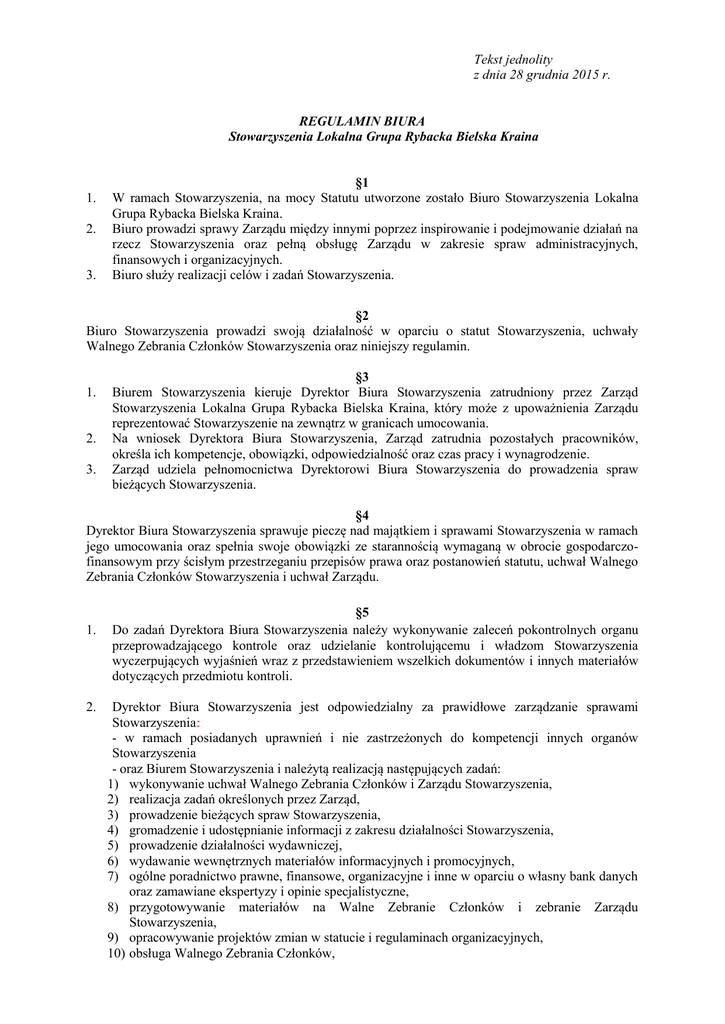 Tekst jednolity z dnia 28 grudnia 2015 r. REGULAMIN BIURA Stowarzyszenia Lokalna Grupa Rybacka Bielska Kraina 1. 2. 3. §1 W ramach Stowarzyszenia, na mocy Statutu utworzone zostało Biuro Stowarzyszenia Lokalna Grupa Rybacka Bielska Kraina. Biuro prowadzi sprawy Zarządu między innymi poprzez inspirowanie i podejmowanie działań na rzecz Stowarzyszenia oraz pełną obsługę Zarządu w zakresie spraw administracyjnych, finansowych i organizacyjnych. Biuro służy realizacji celów i zadań Stowarzyszenia. §2 Biuro Stowarzyszenia prowadzi swoją działalność w oparciu o statut Stowarzyszenia, uchwały Walnego Zebrania Członków Stowarzyszenia oraz niniejszy regulamin. 1. 2. 3. §3 Biurem Stowarzyszenia kieruje Dyrektor Biura Stowarzyszenia zatrudniony przez Zarząd Stowarzyszenia Lokalna Grupa Rybacka Bielska Kraina, który może z upoważnienia Zarządu reprezentować Stowarzyszenie na zewnątrz w granicach umocowania. Na wniosek Dyrektora Biura Stowarzyszenia, Zarząd zatrudnia pozostałych pracowników, określa ich kompetencje, obowiązki, odpowiedzialność oraz czas pracy i wynagrodzenie. Zarząd udziela pełnomocnictwa Dyrektorowi Biura Stowarzyszenia do prowadzenia spraw bieżących Stowarzyszenia. §4 Dyrektor Biura Stowarzyszenia sprawuje pieczę nad majątkiem i sprawami Stowarzyszenia w ramach jego umocowania oraz spełnia swoje obowiązki ze starannością wymaganą w obrocie gospodarczofinansowym przy ścisłym przestrzeganiu przepisów prawa oraz postanowień statutu, uchwał Walnego Zebrania Członków Stowarzyszenia i uchwał Zarządu. 1. 2. §5 Do zadań Dyrektora Biura Stowarzyszenia należy wykonywanie zaleceń pokontrolnych organu przeprowadzającego kontrole oraz udzielanie kontrolującemu i władzom Stowarzyszenia wyczerpujących wyjaśnień wraz z przedstawieniem wszelkich dokumentów i innych materiałów dotyczących przedmiotu kontroli. Dyrektor Biura Stowarzyszenia jest odpowiedzialny za prawidłowe zarządzanie sprawami Stowarzyszenia: - w ramach posiadanych uprawnień i nie zastrzeżonych do kompetencji innych organów Stowarzyszenia - oraz Biurem Stowarzyszenia i należytą realizacją następujących zadań: 1) wykonywanie uchwał Walnego Zebrania Członków i Zarządu Stowarzyszenia, 2) realizacja zadań określonych przez Zarząd, 3) prowadzenie bieżących spraw Stowarzyszenia, 4) gromadzenie i udostępnianie informacji z zakresu działalności Stowarzyszenia, 5) prowadzenie działalności wydawniczej, 6) wydawanie wewnętrznych materiałów informacyjnych i promocyjnych, 7) ogólne poradnictwo prawne, finansowe, organizacyjne i inne w oparciu o własny bank danych oraz zamawiane ekspertyzy i opinie specjalistyczne, 8) przygotowywanie materiałów na Walne Zebranie Członków i zebranie Zarządu Stowarzyszenia, 9) opracowywanie projektów zmian w statucie i regulaminach organizacyjnych, 10) obsługa Walnego Zebrania Członków, 11) prowadzenie dokumentacji Walnego Zebrania Członków i Zarządu, 12) sporządzanie odpisów uchwał Walnego Zebrania Członków i wydawanie ich uprawnionym organom, 13) prowadzenie dokumentacji członkowskiej, 14) obsługa Zarządu, 15) sporządzanie syntetycznych protokołów z zebrań Zarządu, 16) prowadzenie rejestru uchwał Walnego Zebrania Członków i Zarządu, 17) opracowywanie planów pracy, budżetu oraz sprawozdań merytorycznych i finansowych, 18) prowadzenie korespondencji, 19) udział w różnego rodzaju naradach, sympozjach, szkoleniach, uroczystościach związanych z działalnością Stowarzyszenia, 20) utrzymywanie stałego kontaktu z członkami wspierającymi i honorowymi Stowarzyszenia, 21) prowadzenie spraw kadrowych i dokumentacji Stowarzyszenia, 22) sprawowanie pieczy nad sprzętem biurowym oraz zlecanie przeprowadzenia jego konserwacji lub naprawy. §6 Dyrektor Biura Stowarzyszenia przy wykonywaniu swoich zadań działa w oparciu o udzielone pełnomocnictwo ogólne obejmujące umocowanie do zwykłego zarządu sprawami Biura w imieniu Stowarzyszenia. §7 1. Dyrektor Biura – zakres obowiązków i zakres uprawnień: 1) Zakres obowiązków: a) koordynacja pracy biura oraz koordynacja przepływu informacji między biurem a Władzami Rybackiej Lokalnej Grupy Działania (RLGD), b) ogólna koordynacja wdrażania LSR /realizacja celów, wskaźników, nabory wniosków, doradztwo, szkolenia, animacja lokalna, współpraca itd./ c) współpraca z: Instytucją Wdrażającą PO „Rybactwo i Morze 2014-2020”, Członkami RLGD, wnioskodawcami RLGD, zewnętrznymi ekspertami i zleceniobiorcami oraz innymi podmiotami, d) pozyskiwanie środków zewnętrznych na realizację projektów spójnych z LSR, e) nadzór nad dokumentami Stowarzyszenia (w oparciu o które działa, korespondencja, wnioski dotacyjne, umowy i porozumienia organów Stowarzyszenia), f) prowadzenie zebrań Zarządu, Walnego Zebrania Członków Stowarzyszenia, g) wykonywanie uchwał Zarządu Stowarzyszenia, h) zatwierdzanie merytoryczne wydatków bieżących, i) reprezentowanie Stowarzyszenia w granicach umocowania, j) podpisywanie bieżącej korespondencji, k) dokonywania samodzielnych zakupów bieżących jednorazowo do wysokości 5000,00 zł, l) składanie oświadczeń woli w sprawach majątkowych, jak: podpisywanie dokumentów o charakterze finansowo - rozliczeniowym (łącznie z Księgowym biura). m) planowanie wydatkowania środków przez Stowarzyszenie, 2) Zakres uprawnień: a) reprezentowanie Stowarzyszenia w granicach umocowania, b) upoważnianie pracowników Biura do wykonywania określonych czynności w imieniu Biura lub Stowarzyszenia (zakres upoważnienia nie może przekraczać zakresu umocowania Dyrektora), c) podpisywanie bieżącej korespondencji Stowarzyszenia w granicach umocowania, d) podejmowania decyzji dotyczących działalności Stowarzyszenia w granicach umocowania, e) potwierdzanie zgodności z oryginałem dokumentów przygotowanych lub otrzymanych przez Stowarzyszenie, f) współdziałania z przedstawicielami środków ma