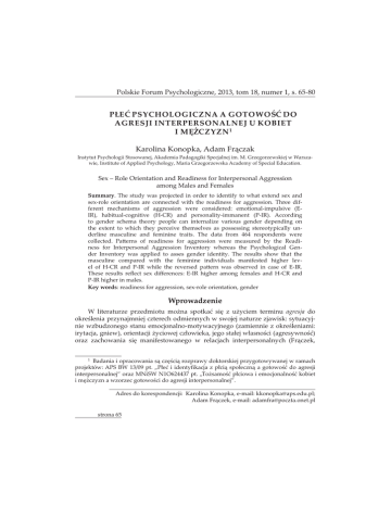 Polskie Forum Psychologiczne, 2013, tom 18, numer 1, s. 65-80 R)ȱ ȱȱg)ȱȱ ȱȱȱȱ ȱ9 1 ȱǰȱȱ£ Instytut Psychologii Stosowanej, Akademia Padagogiki Specjalnej im. M. Grzegorzewskiej w Warszawie, Institute of Applied Psychology, Maria Grzegorzewska Academy of Special Education. Sex – Role Orientation and Readiness for Interpersonal Aggression among Males and Females Summary. The study was projected in order to identify to what extend sex and sex-role orientation are connected with the readiness for aggression. Three different mechanisms of aggression were considered: emotional-impulsive (EIR), habitual-cognitive (H-CR) and personality-immanent (P-IR). According to gender schema theory people can internalize various gender depending on the extent to which they perceive themselves as possessing stereotypically underline masculine and feminine traits. The data from 464 respondents were ǯȱ Ĵȱ ȱ ȱ ȱ ȱ ȱ ȱ ¢ȱ ȱ ness for Interpersonal Aggression Inventory whereas the Psychological Gender Inventory was applied to asses gender identity. The results show that the masculine compared with the feminine individuals manifested higher levȱ ȱ Ȭȱ ȱ Ȭȱ ȱ ȱ ȱ Ĵȱ ȱ ȱ ȱ ȱ ȱ Ȭǯȱ ȱ ȱ Ěȱ ¡ȱ ěDZȱ Ȭȱ ȱ ȱ ȱ ȱ Ȭȱ P-IR higher in males. Key words: readiness for aggression, sex-role orientation, gender Wprowadzenie ȱ £ȱ £ȱ Čȱ °ȱ ¿ȱ £ȱ Č¢ȱ ȱ agresja do ïȱ£¢ȱ£ȱ¢ȱ ȱ ȱ£ȱ£ DZȱ¢¢ȱ ££ȱ ȱ Ȭ¢ ¢ȱ ǻ£ȱ £ȱ ïDZȱ ¢ǰȱ ǼǰȱȱČ¢ ȱ£Ù ǰȱȱÙȱ Ùïȱǻ¢ ï°Ǽȱ £ȱ £ ȱ ¿ȱ ȱ ȱ ȱ ¢ȱ ǻ£ǰȱ 1 Ȳȱȱ ȱȱ£¿ïȱ£ ¢ȱȱ£¢ ¢ ȱ ȱȱ à DZȱȱȱŗřȦŖşȱǯȱǮÙ°ȱȱ¢ęȱ£ȱÙȱÙ£ȱȱ ï°ȱȱȱ Ȅȱ£ȱȱŗŜŘŚŚřŝȱǯȱǮČï°ȱÙ ȱȱï°ȱȱ ȱ¿Č£¢£ȱȱ ££ȱ ïȱȱȱȄǯ ȱȱDZȱȱȱǰȱȬDZȱȓǯǯDzȱ ȱ£ǰȱȬDZȱȓ£ǯǯ strona 65 2002).ȱ¢ ȱȱ¿ȱ£ȱ £¢ȱȱȱȱǰȱ £¢ȱ ȱ £¢ï°ȱ £ ȱ ££ȱ ȱ ȱ ¢ȱ £ǰȱàȱ¿ ȱČȱ¢°ȱ£ǰȱȱ¢ȱÙ£ȱ ïȱ ȱȱǻ£ǰȱŗşŝşǼǯȱȱ ȱÚȱ £¢ȱ ȱ¢ȱ££ȱȱ ïȱ £¿ïȱ ȱ àČ¢ȱ ȱ ǰȱ ȱ ¢ ïȱ £ȱ korelatów. ȱ¿ȱ ȱ¢ȱ£¢ȱǰȱČȱȱȱȱČȱ°ȱàČȱ¿ȱȱ¿ǰȱ£ £¢ȱȱȱ¢ ȱ¿ȱǰȱ££ȱ £¢ȱ £¢¢ ȱ ¢ǰȱ Čȱ ȱ £ȱ £ȱ ȱ £ȱ £Úȱ Č¢ ¢ǯȱ£¢ȱ¢ȱȱ¿ǰȱȱȱ£ ȱ¿ȱ¢ ȱȱ £¿ȱ££ǯȱČȱȱ ȱ ¢£°ǰȱČȱ£Ù ȱȮȱ£Čȱȱȱ£¢ȱȱ ȱ¢ȱȱ£ȱǰȱ£¢ȱČȱÙȱ ££ °ȱ ČȱȱȱȱȮȱȱǮȱ ¢Ȅȱ£¢ȱȱà ȱ £ DZȱČȱïȱ£¢°ȱǻȱ棢£ǼǰȱČȱ£¢£°ȱǻȱ ǼǰȱČȱČȱÙČ¢°ȱ¿ȱ£ȱ£ ¢ȱȱȱ ¢££ȱ £¢ǰȱ ȱ £¢Ùȱ Čȱ °ȱ ǻȱ ¢Ǽǯȱ ȱ ¿ȱ ȱ ȱ£ ȱȱ£¢¢ȱȱȱ¢ǰȱ£ȱ¿ȱȱ Ùȱȱȱ ¢¢ȱ£ȱČ¢ȱȱȱÙČǯ àČȱ¿£¢Ù ȱ ȱ ȱ¢¢¢ǰȱ¢£¢ȱ¿ȱȱȱÙ°ȱȮȱȱ £ȱ¿ȱ ȱȱ£¢ȱàČȱ ȱȱ£ȱ¢ ïȱ£ ¿£¢ȱ£ à ȱ ȱÙà Ȧ¿Č£¢£ȱ ȱà ȱ£ȱ£ £¿Ȧǯȱ¢£¢ȱ £¢Ùȱ ȱ £ȱ à ȱ ȱ ȱ ęÚȱ ¢à ȱ ǻȱ ȱ ǯǰȱ ŗşşŞDzȱ ǰȱ ĵǰȱ ǰȱ ŗşşŘDzȱ ĵǰȱ ǰȱ ǰȱŗşŞŞǼǯȱ£¢¢ȱÙȱ¢£¢ȱÙȱ ¢ȱȱ £ǰȱČȱ Ù¢ȱ £¿ïȱ £ ȱ ¿ȱ 棢£ȱ Čȱ £ £¢ǰȱ ȱ àČȱ ¿£¢Ù ȱ ȱȱ ȱȱïȱ Čȱ¿ȱ£ȱ ȱ¢ǯȱȱ£ czynek w wieku szkolnym dominuje agresja werbalna, a w okresie adolescencji naj£¿£ȱȱȱ¢ǯȱȱÙà ǰȱ£Čȱȱ ǰȱȱȱ 棢£ǰȱȱ £¿ȱ££ȱ ȱȱȱ¢ǯ ǰȱȱ ȱ£ȱ£ȱ ȱǻǰȱŘŖŖŚDzȱǰȱ¢ǰȱǰȱŗşŝŝǼȱǰȱČȱ ȱ£¢ ȱȱȱ ¿£ȱ ¢ ïȱ ¿Č£¢£ȱ ȱ à ȱ £ȱ ȱ ȱ £ȱ ££ǯȱ ȱ¢£ ¢ȱ£ȱÚȱ¢£¢ȱȱ ¢£ȱ¿£¢ȱ ¢ǰȱ Čȱ ¿£ȱ àČȱ ¿£¢Ù ȱ ¢£ȱ ȱ 棢£ȱ ȱ ȱ £ȱǻȱ ȱȱ ¢¿Ǽȱ ȱ£¢ȱȱ ǯȱ ¢ȱ£ȱ£¢à ȱȱ Ù¢ ¢ȱȱàČȱÙ ȱ ȱ£ ȱ ¢ ¢ȱ ȱ £¢Ù ȱ ȱ ȱ ȱ ȱ £ ȱ ¢ ȱȱȱȱ¿Č£¢£ǯȱ¢ȱȱ°ȱȱ棢£ȱ Čȱ Čȱȱ£ȱ£ ȱȱ ȱȱ¢ȱȱȱ£ȱ ¢ǯȱȱČȱ£°ǰȱČȱ ¿£ȱȱ¿Č£¢£ȱȱ£ȱ£ȱČ¢ȱ Ù¢ȱ棢£ȱȱ££ȱ¢ ïȱȱȱȱ ïȱȱȱǰȱČȱ¿Č£¢Ċȱ£¿ïȱČȱ¢ȱȱ¿ȱ棢£ǰȱ£à ȱ ȱȱ£ȱ¿Čstrona 66 £¢£ȱȱȱ ȱǯȱČȱȱ¢ȱȱȱïȱȱ¢ȱ ǻȱ £¢Ùȱ àČȱ £ȱ £ ïǰȱ ǰȱ Ù ȱ ¢¢ȱ ¢Ǽȱȱ ȱ£ ȱ¿ȱ£ £ȱȱȱǻȱȱǯǰȱŗşşŞDzȱǰȱ ŗşşŝDzȱȱȱǯǰȱŗşşŚDzȱȱȱǯǰȱŗşşŘǼǯȱ ï°ȱ£¢ȱ£ ï°ȱǮȱȄȱȱȱ£ïȱ棢£¢ȱȱ£¢ȱàǰȱČȱ ȱ £°ȱ ȱ Ù¿ȱ ¢ ¢ȱ £Č¢°ȱ ȱ Čȱ ££ °ȱ Č¢ȱę¢ǯȱȱ ¿ȱȱ£¿ȱȱ ¿£ȱ¢ ïȱ¿Č£¢£ȱ ȱà £ȱ ȱ ££ȱ ¢£°ȱ ȱ ¿¢ȱ àǰȱ Čȱ Ù°ȱ Čȱ ¿ȱ £ȱ ¢ȱȱ ȱȱ£ȱ£ ȱ¿ǯ ȱ¢£ ¢ȱȱ¢ȱȱ£¢ǰȱ£ȱȱ¢ǰȱ£ȱÙȱ¢ę ȱ ȱ ȱ £ǰȱ £ȱ ǰȱ £ȱ £ȱ £ȱ ȱ ¢ ¢ȱ£¢ïȱ ȱȱ¢ǯȱȱàČȱ ȱ£ȱ¢ ȱ£ ȱ¿ȱ¿Č£¢£ȱȱȱ ¢ïȱȱ ȱȱȱ £ȱ£ȱDZȱ¢ǰȱę£ȱ£ȱ¿ȱÙ£Ȭ ǯȱ ȱ¢£ǰȱà ȱàȱȮȱ£¢ǰȱČȱ¿Č£¢£ȱȱȱ ȱ¢ȱ££ȱàČȱ¿ȱ ȱȱȱ£¢ǰȱȱČȱ ȱȱ ȱǮ£Ȅȱ¢ȱȱ£¿ȱȱ¢ȱ£ÚȱČ¢ ¢ȱǻȱ£¢Ùȱ ǰȱ£ ȱȱȱǯȱ£ȱ£ȱȱȱ nad potomstwem, podtrzymywanie „ogniska domowego”). W efekcie zachowanie ¿ȱ¢ ȱÙÙȱȱȱȱ¿Č£¢£ȱČȱȱǰȱ£à ȱ ȱ ȱ ȱ¢£ȱȱȱ ȱȱÙ£¢ǯȱ¢ïȱȱ£ȱ 棣¢ȱ ¢ȱàČȱ ȱ£ȱȱ¿Č£¢£ȱȱȱȱ ¢ȱǯȱ££àȱ££ȱ£¢¢ ȱȱ£ ȱ ¿ȱȱȮȱǯȱȱ £ȱȱǻŗşşŘǼǰȱȱ ¢ȱȱǰȱČȱ £ȱ ¢Č£¢ȱ£ȱȱȱ ¿£ȱ¿Čȱȱ£ ȱ ££ȱ¿Č£¢£ǰȱ£ ȱ¢ȱȱ£ȱȱ£ £ǯȱ¢Č£¢ȱ£ȱȱ Čȱ¿ȱȱ¢ȱ£ȱǰȱȱČȱ£ȱ ¿£ȱÙïȱȱ¢ £ȱǻǰȱŘŖŖřǼȱȱ£ ȱ£ÚȱǻǰȱǰȱŘŖŖŚǼǰȱȱ£¢ȱ ȱ¿ȱǯȱȱȱ Ù¢ ȱ£¢à ȱȱ£Ù¢ ÚȱÙ£¢ȱȱï°ȱ ȱ¿Č£¢£ȱȱǰȱ ȱ¢ȱČȱ ȱȱ ¢ȱ£ȱȱ Ù£ǰȱ £ȱ¿ȱȱȱ ¢ ȱ¿ȱ£ȱȱ £¢ȱ ȱÙ£Ú ȱȱȱ £à ȱï¢ȱ¿ï° £ȱï°ȱǻǰȱŘŖŖŖǼǯȱïȱ££ȱǰȱïȱ ȱàČ¢ȱàǰȱ£¢ £ȱ ¢ȱÙ£ȱ¢ȱÙǰȱȱ£ £¢ȱȱÙà ǯȱ£ȱ ¿£ȱ¿ȱ¢£¿ȱ£ǰȱ£ȱ££¢ ï°ȱ££ȱȱ¢£ ȱ ȱȱȱȱ¢ȱ ȱ£ ǰȱȱČȱ¿ȱȱȱ¢ȱ ïȱǻǰȱŗşŞŗǼǯ ¢£ ȱ ïȱ ȱ £ȱ ïȱ £ ȱ ¿ȱ ¢ ȱ¿Č£¢£ȱȱȱČ¢ȱ °ȱ£ȱȱ¢ ǰȱ£ȱȱÙǯȱ¢ęȱ £¢ȱ££ȱ