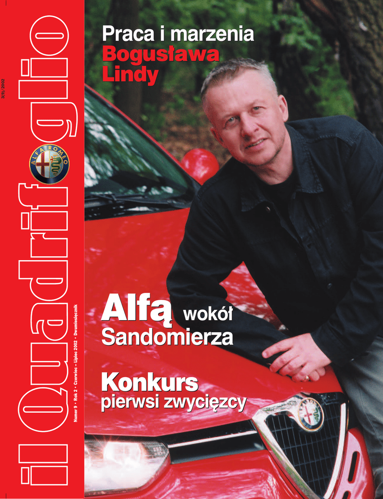 Numer 9 • Rok 2 • Czerwiec – Lipiec 2002 • Dwumiesięcznik 3(9)/2002 Praca i marzenia Bogus∏awa Lindy Alfà wokó∏ Sandomierza Konkurs pierwsi zwyci´zcy www.alfaromeo.pl Prowadziç. Wszystkimi zmys∏ami. Legenda sportu samochodowego odrodzi∏a si´ w jeszcze doskonalszej postaci • Silnik: 3.2 V6 24V • Moc: 250 KM przy 6200 obr./min • Skrzynia biegów: manualna 6-biegowa lub wywodzàca si´ z Formu∏y 1 sekwencyjna przek∏adnia Selespeed • Kierownica: niespe∏na 2 obroty pomi´dzy skrajnymi po∏o˝eniami • Obni˝one zawieszenie: przednie czterowahaczowe i tylne typu McPherson • Felgi: 17” ze stopu • Opony: 225/45 WR17 • Hamulce: przednie wentylowane z zaciskami Brembo, ABS z EBD • Systemy dynamicznej kontroli jazdy: ASR z MSR/ABD. 0-801 117 117 ☎ cmyk magazyn mi∏oÊników Alfa Romeo Na ryby, grzyby i lwy by… OD REDAKCJI Trwa ulubiony przez dzieci oraz wielu doros∏ych okres roku – letnie wakacje. W nadmorskich kurortach, na górskich szlakach, nad jeziorami, w kraju i zagranicà, wsz´dzie mo˝na spotkaç podró˝ujàcych i odpoczywajàcych alfistów. Najbardziej znane miejsca oblegane sà przez t∏umy wczasowiczów. Osobom preferujàcym spokojny odpoczynek, lubiàcym penetracj´ nieznanych regionów proponujemy odwiedzenie okolic Kielc i Sandomierza. To region, przez który przewa˝nie szybko przemykamy po trasie katowickiej lub krakowskiej, w drodze z wybrze˝a czy Mazowsza na po∏udnie, w góry lub z Krakowa i Âlàska na Mazury. Rzadko decydujemy si´ na zjazd w bocznà drog´ i zatrzymanie si´ tu na kilka godzin lub dni. A szkoda, gdy˝ Kielecczyzna i Sandomierszczyzna oferujà swym goÊciom wiele atrakcji. To tu mo˝na poczuç zapach starego, dobrego Dzikiego Zachodu, obcujàc z autentycznymi bizonami, hodowanymi w Kurozw´kach, zwiedziç w Ujeêdzie ruin´ najwi´kszej w swoim czasie rezydencji w Europie, przenocowaç w ma∏ym Wawelu – pa∏acu w Baranowie Sandomierskim, zobaczyç jedyny w Polsce pa∏acyk-harem w Grabkach Du˝ych lub pójÊç Êladami Kozio∏ka Mato∏ka do Pacanowa. Wakacje to równie˝ okres relaksu, podczas którego mo˝na w marzeniach odbyç przeja˝d˝k´ Brerà – zachwycajàcym studyjnym modelem Alfy, zaprojektowanym przez Giorgetto Giugiaro. Tym, którzy nad marzenia przedk∏adajà realnà jazd´ seryjnymi Alfami przypominamy, ˝e w salonach ju˝ jest pe∏na gama modelu 156, w tym wersja z dwulitrowym silnikiem JTS – pierwszà jednostkà nap´dowà nowej generacji. Gdy jednak solidny odpoczynek sprawi, ˝e zat´sknià Paƒstwo za odrobinà adrenaliny, polecamy relacj´ z przebiegu pierwszych rund trzeciej edycji Pucharu Alfa Romeo. Emocje gwarantowane. ˚ycz´ Paƒstwu udanego urlopu oraz zapraszam do lektury wakacyjnego numeru naszego magazynu. Bart∏omiej Lorek Redaktor Naczelny prenumerata 2002 6 numerów 70 zł edycja polska dwumiesi´cznik ➤ Cena rocznej prenumeraty w Polsce: 70 z∏otych ➤ Prenumerat´ mo˝na zamówiç od pierwszego dost´pnego numeru i rozpoczàç jà w dowolnym miesiàcu. Prenumerata obejmuje 6 kolejnych numerów SPOSÓB P¸ATNOÂCI OBS¸UGA PRENUMERATY Op∏aty mo˝na dokonaç na poczcie lub w banku na rachunek BPH II O/Bielsko-Bia∏a 10601103-320000066298 z dopiskiem „prenumerata il Quadrifoglio”. SATIZ POLAND Sp. z o.o. Tel. 033 813 27 61 Fax. 033 813 41 76 E-mail: [email protected] Dane osobowe prenumeratorów oraz czytelników, którzy napisali do redakcji il Quadrifoglio sà gromadzone, przetwarzane, wykorzystywane oraz przekazywane dostawcom us∏ug informatycznych, e-mailingowych lub rachunkowoÊci wy∏àcznie w celu realizacji zamówieƒ czytelników. Dane sà przechowywane w siedzibie Satiz Poland Sp. z o.o., ul. 11 Listopada 60/62, 43-300 Bielsko Bia∏a. Wszystkie operacje przetwarzania danych osobowych w celach marketingowych wykonywane sà zgodnie z ustawà z dn. 29.08.1997 r. o ochronie danych osobowych (Dz. U. nr 133, poz. 883) OBS¸UGA PRENUMERATY 033 813 27 61 E-mail: [email protected] Czynne w dniach i godzinach: poniedzia∏ek – piàtek 8.00 - 13.00 14.00 - 16.30 fot. Lidia Popiel W NUMERZE il Quadrifoglio nr 9 czerwiec-lipiec 2002 WYDAWCA Satiz Poland ul. 11 Listopada 60/62 43-300 Bielsko-Bia∏a Tel. 0-33 813 27 61 Fax 0-33 813 41 76 PREZES Jas Gawroƒski PE¸NOMOCNIK Filippo Gallino REDAKCJA 02-649 Warszawa ul. Pu∏ku Baszta 1/16 Tel./fax 0-22 844 41 42 e-mail: [email protected] REDAKTOR NACZELNY Bart∏omiej Lorek WYDARZENIA 4 ALFA 156 GTA ZNACZY BEZPIECZE¡STWO 6 BOGUS¸AW LINDA – JESTEM NORMALNYM CZ¸OWIEKIEM CORAZ WI¢KSZE EMOCJE 10 14 ALFA ZWYCI¢˚A NA TORACH EUROPY 18 DUCATI I ALFA – RAZEM PO ZWYCI¢STWO 20 BRERA – ZACHWYCAJÑCY CONCEPT CAR 24 CASTAGNA I BRERA NAJELEGANTSZE 28 KONKURS „ALFISTA” – PIERWSI ZWYCI¢ZCY 30 ZAST¢PCA REDAKTORA NACZELNEGO Francesco Novo LE MANS – WYÂCIG PE¸EN EMOCJI REDAKTOR PROWADZÑCY Jerzy Kozierkiewicz WSPANIA¸Y MIT ALFY ZESPÓ¸ Anna Borsukiewicz Dariusz Balcerzyk OPRACOWANIE GRAFICZNE Dejan Gospodarek KONSULTACJA FIAT AUTO POLAND Rafa∏ Grzanecki PRENUMERATA Tel. 0-33 813 27 61 Fax 0-33 813 41 76 REKLAMA Tel. 0-33 813 52 55 DRUK Dimograf ul. Legionów 83 43-300 Bielsko-Bia∏a KRAINA ZABYTKÓW I LEGEND MODNE I SPORTOWE PANNA JULIA, KTÓRA PODBI¸A AMERYK¢ 32 35 38 46 NOWA ODS¸ONA STRONY 50 56 57 58 SALONY ALFA ROMEO w Polsce 60 KLUBY ALFA ROMEO na Êwiecie 63 ORZE¸ I TRZY KORONY CO WARTO ZOBACZYå LATEM il Quadrifoglio 3 WYDARZENIA Brumm opowiada histori´ modeli W 2002 roku w∏oska firma specjalizujàca si´ w produkcji modeli samochodowych „Brumm” skoƒczy 30 lat. Firm´, której nazwa pochodzi od dwuosobowej doro˝ki z dziewi´tnastowiecznego Mediolanu, za∏o˝yli w 1972 roku Reno Tattarletti wraz z Virginio Bianchim i Emilio Moltenim, a jej dzia∏alnoÊç okreÊlono jako „wytwórstwo reprodukcji modeli dla mi∏oÊników kolekcjonerstwa w skali 1/43”. Od tamtego czasu Brumm z siedzibà w Oltrona San Mamette (Como) stworzy∏ tysiàce modeli, w wi´kszoÊci Alfy 