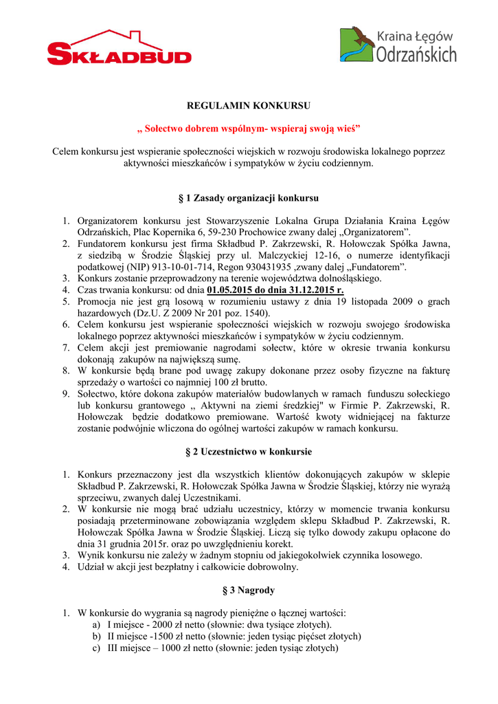 REGULAMIN KONKURSU ,, Sołectwo dobrem wspólnym- wspieraj swoją wieś” Celem konkursu jest wspieranie społeczności wiejskich w rozwoju środowiska lokalnego poprzez aktywności mieszkańców i sympatyków w życiu codziennym. § 1 Zasady organizacji konkursu 1. Organizatorem konkursu jest Stowarzyszenie Lokalna Grupa Działania Kraina Łęgów Odrzańskich, Plac Kopernika 6, 59-230 Prochowice zwany dalej „Organizatorem”. 2. Fundatorem konkursu jest firma Składbud P. Zakrzewski, R. Hołowczak Spółka Jawna, z siedzibą w Środzie Śląskiej przy ul. Malczyckiej 12-16, o numerze identyfikacji podatkowej (NIP) 913-10-01-714, Regon 930431935 ,zwany dalej „Fundatorem”. 3. Konkurs zostanie przeprowadzony na terenie województwa dolnośląskiego. 4. Czas trwania konkursu: od dnia 01.05.2015 do dnia 31.12.2015 r. 5. Promocja nie jest grą losową w rozumieniu ustawy z dnia 19 listopada 2009 o grach hazardowych (Dz.U. Z 2009 Nr 201 poz. 1540). 6. Celem konkursu jest wspieranie społeczności wiejskich w rozwoju swojego środowiska lokalnego poprzez aktywności mieszkańców i sympatyków w życiu codziennym. 7. Celem akcji jest premiowanie nagrodami sołectw, które w okresie trwania konkursu dokonają zakupów na największą sumę. 8. W konkursie będą brane pod uwagę zakupy dokonane przez osoby fizyczne na fakturę sprzedaży o wartości co najmniej 100 zł brutto. 9. Sołectwo, które dokona zakupów materiałów budowlanych w ramach funduszu sołeckiego lub konkursu grantowego ,, Aktywni na ziemi średzkiej" w Firmie P. Zakrzewski, R. Hołowczak będzie dodatkowo premiowane. Wartość kwoty widniejącej na fakturze zostanie podwójnie wliczona do ogólnej wartości zakupów w ramach konkursu. § 2 Uczestnictwo w konkursie 1. Konkurs przeznaczony jest dla wszystkich klientów dokonujących zakupów w sklepie Składbud P. Zakrzewski, R. Hołowczak Spółka Jawna w Środzie Śląskiej, którzy nie wyrażą sprzeciwu, zwanych dalej Uczestnikami. 2. W konkursie nie mogą brać udziału uczestnicy, którzy w momencie trwania konkursu posiadają przeterminowane zobowiązania względem sklepu Składbud P. Zakrzewski, R. Hołowczak Spółka Jawna w Środzie Śląskiej. Liczą się tylko dowody zakupu opłacone do dnia 31 grudnia 2015r. oraz po uwzględnieniu korekt. 3. Wynik konkursu nie zależy w żadnym stopniu od jakiegokolwiek czynnika losowego. 4. Udział w akcji jest bezpłatny i całkowicie dobrowolny. § 3 Nagrody 1. W konkursie do wygrania są nagrody pieniężne o łącznej wartości: a) I miejsce - 2000 zł netto (słownie: dwa tysiące złotych). b) II miejsce -1500 zł netto (słownie: jeden tysiąc pięćset złotych) c) III miejsce – 1000 zł netto (słownie: jeden tysiąc złotych) 2. Nagrody pieniężne mogą być wykorzystane w dowolny sposób przez sołtysów i rady sołeckie w sposób samorządny. 3. Zgodnie z art. 30 ust.1 pkt 2 ustawy o podatku dochodowym od osób fizycznych Firma Składbud P. Zakrzewski, R. Hołowczak Spółka Jawna w Środzie Śląskiej do wysokości wygranej dopłaci zryczałtowany podatek. 4. Zwycięzcy konkursu nie mogą przenieść prawa do otrzymania nagrody na osoby trzecie. § 4 Zasady przyznawania nagród 1. Zwycięzcą konkursu będzie miejscowość, która w czasie trwania konkursu dokonano zakupów na największą kwotę, w przeliczeniu na mieszkańca wsi. 2. Metodologia wyliczeń jest następująca: kwota skumulowana zakupów/ilość mieszkańców. 1. Kwota skumulowana zakupów jest to kwota przypisana przez kupujących danej wsi. 2. Ilość mieszkańców to liczba mieszkańców wsi oszacowana na podstawie danych z gminy z dnia 31 grudnia 2014r 3. Przykład wyliczenia: 1. Sołectwo Poradowice skumulowało na rzecz wsi do dnia 31 grudnia 2015r kwotę 40 000 zł, zgodnie z danymi uzyskanymi w gminie wiemy, że w dniu 31 grudnia ubiegłego roku mieszkało 500 os. W związku z tym do oszacowania pozycji rankingu sołectw będzie uwzględniona liczba 80 . 2. W konkursie bierze udział wieś Motorkowo, która skumulowała na rzecz swojej wsi do dnia 31 grudnia 2015r kwotę 12 000 zł, zgodnie z danymi uzyskanymi w gminie wiemy, że w dniu 31 grudnia ubiegłego roku mieszkało 80 os. W związku z tym do oszacowania pozycji rankingu sołectw będzie uwzględniona liczba 150. 3. Lista rankingowa będzie wyglądać następująco: 1. Pierwsze miejsce - Wieś Motorkowo – 150. 2. Drugie miejsce – Wieś Poradowice – 80. 3. W imieniu sołectwa, nagrodę odbiera sołtys lub inna wyznaczona przez niego osoba. 4. O wygranej nagród, sołtys danego sołectwa zostanie poinformowany mailowo, telefonicznie w terminie do 10 dni od daty wyłonienia zwycięzcy. 5. Po zawiadomieniu, o którym mowa w ust. 2 powyżej, zwycięzca będzie mógł odebrać nagrodę podczas Gali. 6. W przypadku, gdy nagroda nie zostanie odebrana w określonym terminie, prawo do nagrody przechodzi na rzecz kolejnego sołectwa.. 7. Nagrody zostaną wydane z uwzględnieniem obowiązujących przepisów podatkowych. 8. Organizator zastrzega sobie do podania do publicznej wiadomości wyników konkursu, a także prezentacji zdjęć, podczas odbioru nagród (na facebooku, www). § 5 Postanowienia końcowe 1. Organizator zastrzega, że nie ponosi odpowiedzialności za: zdarzenia uniemożliwiające prawidłowe przeprowadzenie konkursu, których nie był w stanie przewidzieć lub którym nie mógł zapobiec, w szczególności w przypadku zaistnienia zdarzeń losowych, w tym siły wyższej. 2. Organizator zastrzega sobie prawo zmiany postanowień Regulaminu w przypadku zmian przepisów prawnych lub innych istotnych zdarzeń, mających wpływ na organizowanie konkursu. 3. W przypadku wystąpienia jakichkolwiek sporów, wynikających z niniejszego Regulaminu, właściwym miejscowo jest sąd w miejscu siedziby Organizatora.