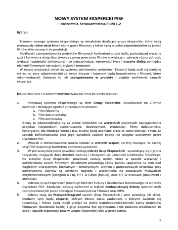 NOWY SYSTEM EKSPERCKI PISF – PROPOZYCJA STOWARZYSZENIA FILM 1,2 WSTĘP: Trzonem nowego systemu eksperckiego są niezależnie działające grupy eksperckie, które będą promowały różne wizje kina i różne gusta filmowe, a także będą w pełni odpowiedzialne za jakość filmów skierowanych do produkcji. Możliwość zaprezentowania projektów filmowych konkretnej grupie osób, posiadającej wyraźny gust i konkretną wizję kina stworzy szansę powstania filmów o większym zakresie różnorodności, większej rozpiętości stylistycznej i co najważniejsze, wprowadzi żywy i otwarty dialog pomiędzy różnymi filmowymi narracjami, stylami i tematami. W naszej propozycji zmian do systemu opiniowania wniosków Eksperci będą czuli się bardziej niż do tej pory odpowiedzialni za swoje decyzje i kojarzeni będą bezpośrednio z filmami, które rekomendowali. Zwiększy to ich zaangażowanie w projekty i pogłębi wnikliwość samych ekspertyz. NAJISTOTNIEJSZE ELEMENTY PROPONOWANEGO SYSTEMU EKSPERCKIEGO: 1. 2. 3. 4. 5. Podstawą systemu eksperckiego są stałe Grupy Eksperckie, powoływane na 2-letnie kadencje i działające zgodnie z trzema priorytetami: a. Film fabularny b. Film dokumentalny c. Film animowany Grupy te odpowiedzialne są za ocenę wniosków na wszystkich poziomach zaangażowania projektu (stypendium scenariuszowe, development, produkcja). Filmy debiutanckie, historyczne, dla młodego widza i tzw. trudne będą oceniane przez te same komisje, z tym, że sposób dofinansowania oraz jego wysokość zależeć będzie od progów ustalonych przez Dyrektora PISF. Wnioski o dofinansowanie można składać w czterech sesjach, co trzy miesiące. W każdej sesji PISF dysponuje budżetem podobnej wysokości. W pierwszej kolejności powołani zostają Liderzy Grup Eksperckich - wywodzący się z grona reżyserów, mających duży dorobek twórczy i cieszących się uznaniem środowiska filmowego. Na Liderów Grup Eksperckich powołane zostają osoby, które w sposób wyrazisty i potwierdzony swoim filmowym dorobkiem prezentują różne punkty spojrzenia na kino pod względem estetycznym, formalnym i tematycznym. Jednym z podstawowych kryteriów przy powoływaniu Liderów są uzyskane nagrody i wyróżnienia na znaczących festiwalach międzynarodowych (kategorii A i B), FPFF w Gdyni (fabuła), oraz KFF w Krakowie (dokument i animacja). Liderów Grup Eksperckich powołuje Minister Kultury i Dziedzictwa Narodowego na wniosek Dyrektora PISF. Kandydaci zostają wyłonieni w trakcie środowiskowej debaty spośród osób zaproponowanych przez działające Stowarzyszenia Filmowe oraz KIPA. Liderzy stają się Przewodniczącymi swoich Grup Eksperckich i sami powołują ich skład. Osobami tymi będą eksperci, których liderzy darzą zaufaniem, z którymi świetnie się rozumieją, i którzy będą mogli przyjąć na siebie współodpowiedzialność oceny projektów filmowych (liczebność każdej z grup powinna być ograniczona i nie powinna przekraczać 10 osób). Sposób organizacji prac w Grupie Eksperckiej leży w gestii Lidera. 1 Osoby wchodzące w skład jednej Grupy Eksperckiej nie mogą wchodzić w skład innej. Skład każdej z grup eksperckich zatwierdza Dyrektor PISF. Lider ponosi pełną odpowiedzialność za jakość prac powołanych przez siebie osób i jednoosobowo jest z tego rozliczany. 9. Liderzy grup nie są zmuszeni do obiektywizmu ocen projektów. Ich zadaniem jest uczciwie subiektywne opiniowanie projektów, zgodnie ze swoim gustem, sposobem podejścia do kina, bez względu na to, czy traktują je jako sztukę, czy jako rozrywkę. 10. Zarówno Liderzy jak i ich współpracownicy opłacani są ze środków PISF. Liderzy powoływania są na 2-letnie kadencje i otrzymują stałe wynagrodzenie miesięczne. Wynagrodzenie członków Grup Eksperckich uzależnione jest od ilości wniosków rozpatrywanych przez Grupę w danej sesji. 11. Dyrektor PISF określa stawki za ekspertyzy poszczególnych wniosków (produkcja, development, stypendia scenariuszowe), które pomnożone przez ilość wniosków rozpatrywanych przez daną Grupę Ekspercką stanowią jej budżet. W związku z tym budżety te są ruchome i uzależnione od wielkości zadania w danej sesji. 12. Wnioskodawcy (autorzy i producenci filmowi) składając swój projekt, mają możliwość wyboru konkretnej Grupy Eksperckiej, kierując się poczuciem największej zbieżności pomiędzy charakterem wnioskowanego projektu, a profilem kina, reprezentowanym osobą Lidera wraz z jego współpracownikami. Autorzy i Producenci projektów muszą mieć szansę zaprezentowania swojej artystycznej propozycji osobom, które, zgodnie z ich przekonaniem, najlepiej i najpełniej mogą zrozumieć ów artystyczny zamysł. 13. Proces opiniowania wniosków podzielony jest na dwa etapy. a. W etapie pierwszym projekty napływają do konkretnych Grup Eksperckich. Lider wraz ze swoimi współpracownikami zapoznaje się ze wszystkimi projektami, które otrzymał do oceny w danej sesji. Pierwszy etap to czas współpracy Grup Eksperckich z wnioskodawcami. Dokonanie pierwszej selekcji i odrzucenie projektów, które nie mają szansy na rekomendację przez daną Grupę Ekspercką. Spotkania konsultacyjne i możliwość dyskusji, wymiany uwag proponowanie poprawek w przypadku projektów dobrze rokujących, a z różnych względów wymagających dopracowania. To etap dialogu i lepszego rozpoznania zarówno samych scenariuszy jak i zamiarów i wizji twórców (reżyserów, scenarzystów, producentów). Spotkanie konsultacyjne dotyczy tylko tych projektów, które nie zostały odrzucone przez daną Grupę Ekspercką przy pierwszej selekcji. Lider Grupy Eksperckiej każdorazowo na piśmie wyjaśnia podstawy decyzji o odrzuceniu projektu na poziomie pierwszej selekcji. Decyzja ta jest nieodwołalna. b. Drugi etap to zebranie Liderów wszystkich Grup oraz Dyrektora PISF, w trakcie którego zostają ostatecznie podjęte decyzje o dofinansowaniu wyb