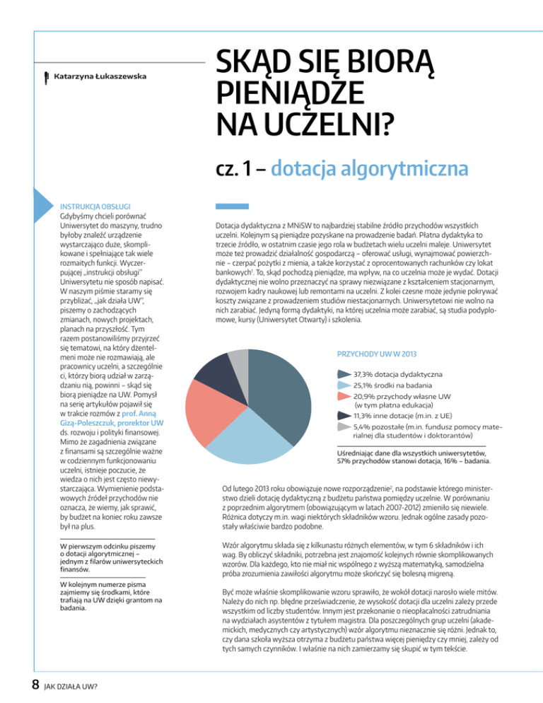 ííKatarzyna Łukaszewska Skąd się biorą pieniądze na uczelni? cz. 1 – dotacja algorytmiczna Instrukcja obsługi Gdybyśmy chcieli porównać Uniwersytet do maszyny, trudno byłoby znaleźć urządzenie wystarczająco duże, skomplikowane i spełniające tak wiele rozmaitych funkcji. Wyczerpującej „instrukcji obsługi” Uniwersytetu nie sposób napisać. W naszym piśmie staramy się przybliżać, „jak działa UW”, piszemy o zachodzących zmianach, nowych projektach, planach na przyszłość. Tym razem postanowiliśmy przyjrzeć się tematowi, na który dżentelmeni może nie rozmawiają, ale pracownicy uczelni, a szczególnie ci, którzy biorą udział w zarządzaniu nią, powinni – skąd się biorą pieniądze na UW. Pomysł na serię artykułów pojawił się w trakcie rozmów z prof. Anną Gizą-Poleszczuk, prorektor UW ds. rozwoju i polityki finansowej. Mimo że zagadnienia związane z finansami są szczególnie ważne w codziennym funkcjonowaniu uczelni, istnieje poczucie, że wiedza o nich jest często niewystarczająca. Wymienienie podstawowych źródeł przychodów nie oznacza, że wiemy, jak sprawić, by budżet na koniec roku zawsze był na plus. W pierwszym odcinku piszemy o dotacji algorytmicznej – jednym z filarów uniwersyteckich finansów. W kolejnym numerze pisma zajmiemy się środkami, które trafiają na UW dzięki grantom na badania. 8 JAK DZIAŁA UW? Dotacja dydaktyczna z MNiSW to najbardziej stabilne źródło przychodów wszystkich uczelni. Kolejnym są pieniądze pozyskane na prowadzenie badań. Płatna dydaktyka to trzecie źródło, w ostatnim czasie jego rola w budżetach wielu uczelni maleje. Uniwersytet może też prowadzić działalność gospodarczą – oferować usługi, wynajmować powierzchnie – czerpać pożytki z mienia, a także korzystać z oprocentowanych rachunków czy lokat bankowych1. To, skąd pochodzą pieniądze, ma wpływ, na co uczelnia może je wydać. Dotacji dydaktycznej nie wolno przeznaczyć na sprawy niezwiązane z kształceniem stacjonarnym, rozwojem kadry naukowej lub remontami na uczelni. Z kolei czesne może jedynie pokrywać koszty związane z prowadzeniem studiów niestacjonarnych. Uniwersytetowi nie wolno na nich zarabiać. Jedyną formą dydaktyki, na której uczelnia może zarabiać, są studia podyplomowe, kursy (Uniwersytet Otwarty) i szkolenia. Przychody UW w 2013 37,3% dotacja dydaktyczna 25,1% środki na badania 20,9% przychody własne UW (w tym płatna edukacja) 11,3% inne dotacje (m.in. z UE) 5,4% pozostałe (m.in. fundusz pomocy materialnej dla studentów i doktorantów) Uśredniając dane dla wszystkich uniwersytetów, 57% przychodów stanowi dotacja, 16% – badania. Od lutego 2013 roku obowiązuje nowe rozporządzenie2, na podstawie którego ministerstwo dzieli dotację dydaktyczną z budżetu państwa pomiędzy uczelnie. W porównaniu z poprzednim algorytmem (obowiązującym w latach 2007-2012) zmieniło się niewiele. Różnica dotyczy m.in. wagi niektórych składników wzoru. Jednak ogólne zasady pozostały właściwie bardzo podobne. Wzór algorytmu składa się z kilkunastu różnych elementów, w tym 6 składników i ich wag. By obliczyć składniki, potrzebna jest znajomość kolejnych równie skomplikowanych wzorów. Dla każdego, kto nie miał nic wspólnego z wyższą matematyką, samodzielna próba zrozumienia zawiłości algorytmu może skończyć się bolesną migreną. Być może właśnie skomplikowanie wzoru sprawiło, że wokół dotacji narosło wiele mitów. Należy do nich np. błędne przeświadczenie, że wysokość dotacji dla uczelni zależy przede wszystkim od liczby studentów. Innym jest przekonanie o nieopłacalności zatrudniania na wydziałach asystentów z tytułem magistra. Dla poszczególnych grup uczelni (akademickich, medycznych czy artystycznych) wzór algorytmu nieznacznie się różni. Jednak to, czy dana szkoła wyższa otrzyma z budżetu państwa więcej pieniędzy czy mniej, zależy od tych samych czynników. I właśnie na nich zamierzamy się skupić w tym tekście. Wcale nie jest tak, że algorytm wymusza umasowienie studiów. Ściganie się o liczbę studentów powinno być bardzo dobrze przemyślane. Korzystniejsze może być zdobywanie pieniędzy w inny sposób. Należy zadbać o wysokie współczynniki kosztochłonności prowadzonych kierunków, przyciągać na studia i do pracy obcokrajowców. Algorytm pozwala dążyć do tworzenia studiów elitarnych. Musimy mieć jednak świadomość wszystkich czynników. Teraz, kiedy rozpoczęliśmy proces rewizji strategii wydziałowych, jest doskonały moment, żeby przemyśleć te zagadnienia. prof. Anna Giza-Poleszczuk Uniwersytet, dzieląc dotację dydaktyczną pomiędzy jednostki na uczelni, powiela z pewnymi uproszczeniami mechanizm ministerialny. We wzorze algorytmu wewnętrznego zamiast 6 składników mamy 3. Podział środków pomiędzy uniwersyteckie jednostki został tak pomyślany, żeby stymulować ich rozwój w określonym kierunku. Kierunku, który pozwoli Uniwersytetowi otrzymywać wyższe środki z budżetu (a tym samym wyższą pulę do podziału pomiędzy jednostki). Wybranie metody algorytmicznej (a więc opartej na wzorze matematycznym) pozwala także na przejrzysty podział publicznych pieniędzy. Algorytm ministerialny dla uczelni akademickich 65% – jest rozdzielane pomiędzy uczelnie zgodnie z tym, jaką dotację te uczelnie dostały w roku poprzednim (tzw. stała przeniesienia) 35% – jest dzielone w oparciu o nowe dane, czyli tzw. składniki: 12,3% składnik studencko-doktorancki* 10,5% składnik kadrowy 5,3% składnik dostępności kadry 3,5% składnik badawczy 1,8% składnik uprawnień do nadawania stopni 1,8% składnik wymiany międzynarodowej * We wzorze algorytmu waga składnika studencko-doktoranckiego wynosi 35%. Jednak jest to 35% części dotacji, która obliczana jest na podstawie nowych danych. W rzeczywistości więc wartość danych dotyczących studentów i dokto