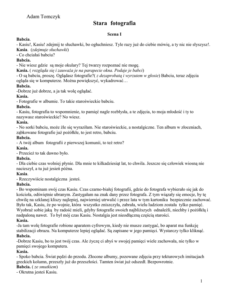 Adam Tomczyk Stara fotografia Scena I Babcia. - Kasiu!, Kasiu! zdejmij te słuchawki, bo ogłuchniesz. Tyle razy już do ciebie mówię, a ty nic nie słyszysz!. Kasia. (zdejmuje słuchawki) - Co chciałaś babciu? Babcia. - Nie wiesz gdzie są moje okulary? Tej twarzy rozpoznać nie mogę. Kasia. ( rozgląda się i zauważa je na parapecie okna. Podaje je babci) - O są babciu, proszę. Oglądasz fotografie?( z dezaprobatą i wyrzutem w głosie) Babciu, teraz zdjęcia ogląda się w komputerze. Można powiększyć, wykadrować… Babcia. -Dobrze już dobrze, a ja tak wolę oglądać. Kasia. - Fotografie w albumie. To takie staroświeckie babciu. Babcia. - Kasiu, fotografia to wspomnienie, to pamięć nagle rozbłysła, a te zdjęcia, to moja młodość i ty to nazywasz staroświeckie? No wiesz. Kasia. - No sorki babciu, może źle się wyraziłam. Nie staroświeckie, a nostalgiczne. Ten album w złoceniach, ząbkowane fotografie już pożółkłe, to jest retro, babciu. Babcia. - A twój album fotografii z pierwszej komunii, to też retro? Kasia. - Przecież to tak dawno było. Babcia. - Dla ciebie czas wolniej płynie. Dla mnie te kilkadziesiąt lat, to chwila. Jeszcze się człowiek wiosną nie nacieszył, a tu już jesień późna. Kasia. - Rzeczywiście nostalgiczna jesteś. Babcia. - Bo wspominam swój czas Kasiu. Czas czarno-białej fotografii, gdzie do fotografa wybierało się jak do kościoła, odświętnie ubranym. Zastygałam na znak dany przez fotografa. Z tym wiązały się emocje, by tę chwilę na szklanej kliszy najlepiej, najwierniej utrwalić i przez lata w tym kartoniku bezpiecznie zachować. Było tak, Kasiu, że po wojnie, która wszystko zniszczyła, zabrała, wielu ludziom została tylko pamięć. Wyobraź sobie jaką by radość mieli, gdyby fotografie swoich najbliższych odnaleźli, niechby i pożółkłą i nadpaloną nawet. To był mój czas Kasiu. Nostalgia jest nieodłączną częścią starości. Kasia. -Ja tam wolę fotografie robione aparatem cyfrowym, kiedy nie musze zastygać, bo aparat ma funkcję stabilizacji obrazu. Na komputerze lepiej oglądać. Są zapisane w jego pamięci. Wystarczy tylko kliknąć. Babcia. -Dobrze Kasiu, bo to jest twój czas. Ale życzę ci abyś w swojej pamięci wiele zachowała, nie tylko w pamięci swojego komputera. Kasia. - Spoko babcia. Świat pędzi do przodu. Złocone albumy, pozowane zdjęcia przy tekturowych imitacjach greckich kolumn, przeszły już do przeszłości. Tamten świat już odszedł. Bezpowrotnie. Babcia. ( ze smutkiem) - Okrutna jesteś Kasiu. 1 Mama. (wchodzi) - Czyżby jakaś sprzeczka? Babcia. - Ach nie. Po prostu próbujemy się przekonać nawzajem do swoich racji. Kasia. - Mnie babcia nie przekona! Mama. - Ale w czym rzecz? Kasia. - Twierdzę, że fotografia cyfrowa i komputer to już teraźniejszość, która przekreśla ostatecznie te kartonikowe fotografie i rolki czarnej kliszy. Mamo!! Gdy sobie przypomnę jak tato zakładał film do swojego aparatu czy jak go później wyjmował. Śmiech mnie ogarnia. Najpierw korbką kręcił, aby film wycofać, w rolkę zwinąć, a potem pod koc w ciemnym pokoju się chował i wyjmował zużytą rolkę filmu. Trząsł się, aby go nie naświetlić Teraz przy cyfrowej fotografii… Mama. - Wiem jakie możliwości daje cyfrowa fotografia. Nie musisz być taka przemądrzała. Trochę więcej szacunku do przeszłości! Kasia. - To już nie mogę mieć swojego zdania? Mama. - Ależ możesz i pozwól mieć swoje zdanie innym. Babcia. - Przestańcie. Mama. - Pozwól mamo, że zwrócę jej uwagę w sposób jaki uznaję za słuszny.( odwraca się do Kasi) Kasiu musisz wiedzieć, że fotografia cyfrowa, komputer, telefon komórkowy, z którym się godzinami nie rozstajesz, nie spadły z nieba wraz z twoim pokoleniem. Na to składa się wiele lat pracy, po drodze było wiele wynalazków. Bez tych śmiesznych aparatów ze szklaną kliszą, bez suwaka logarytmicznego, bez patefonu, radia, magnetofonu, nie byłoby dzisiejszego postępu. Wynalazki powstają po kolei, trafiają w swój czas. Kasia. - Okay. Jednak idę oglądać filmiki na You Tube. Mama. - Lepiej Kasiu przeczytaj na stronie internetowej coś o historii fotografii! Babcia. - Oby tylko nie brakło prądu. 2 Scena II. Tata.( wchodzi do pokoju w którym już siedzą mama z babcią. Wchodzi rozdrażniony z gazetką , czyta i mocno gestykuluje) Mama. - Co cię tak zdenerwowało Kaziu? Tata. - Czytam tą gazetkę reklamową sołtysa „Złoty róg” i aż mnie ponosi. Mama. - A cóż takiego jest w tej gazecie? Tata. - Ano nic konkretnego, same zamiary, zapowiedzi, projekty i prawie na każdej stronie fotografia sołtysa. Niech lepiej drogę na naszym osiedlu wyremontuje i wtedy się chwali. Mama. - Lansuje się, ale przecież za własne pieniądze tą gazetkę wydaje. Tata. - No niekoniecznie. W zamian za duży upust przy budowie ogrodzenia jego gospodarstwa miał mi w tym pisemku solidną reklamę zamieścić… Mama.( wyrywa mu gazetę) - I co, nie wydrukował? Tata. - Wydrukował. O tu na trzeciej stronie u dołu. Kilka zdań tylko, a nawet adresu mojej firmy nie podał. Mama. - Musisz iść do niego z reklamacją. Ty się wywiązałeś ze swojej części umowy. Tata. - No tak, ale on też i nawet swoje zdjęcie przy mojej reklamie… Babcia. - Widzę synu, że ten barter z sołtysem nie za bardzo ci wyszedł. Z politykami trzeba umieć, bo ci tylko obiecują, a gębę mają bazyliszka. Mama. - Mamo, aż taka złośliwość! Jak możesz? Babcia. - A mogę, mogę, bo mnie już siódmy miot polityków zwodzi. Tata.( macha ręką zły i zdenerwowany) - Aaa, myślę, że to niedopatrzenie jakieś, pomyłka. Wiesz co zrobię?( zwraca się do żony) Mama. - Tak, co? Tata. - Założę stronę internetową własnej firmy. Tam będę reklamował swoje produkty i usługi. Mama. - Świetny pomysł Kaziu! Babcia. - Cywilizacja obrazkowa. 3 Scena III Kasia.( przepraszająco i przymilnie) - Babciu, babciu. Babcia. -Co Kas