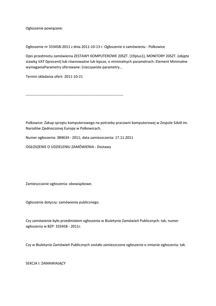 Ogłoszenie powiązane: Ogłoszenie nr 333458-2011 z dnia 2011-10-13 r. Ogłoszenie o zamówieniu - Polkowice Opis przedmiotu zamówienia ZESTAWY KOMPUTEROWE 20SZT. (19plus1), MONITORY 20SZT. (objęte stawką VAT 0procent) lub równoważne lub lepsze, o minimalnych parametrach: Element Minimalne wymaganiaParametry oferowane: (rzeczywiste parametry... Termin składania ofert: 2011-10-21 -------------------------------------------------------------------------------- Polkowice: Zakup sprzętu komputerowego na potrzeby pracowni komputerowej w Zespole Szkół im. Narodów Zjednoczonej Europy w Polkowicach. Numer ogłoszenia: 384634 - 2011; data zamieszczenia: 17.11.2011 OGŁOSZENIE O UDZIELENIU ZAMÓWIENIA - Dostawy Zamieszczanie ogłoszenia: obowiązkowe. Ogłoszenie dotyczy: zamówienia publicznego. Czy zamówienie było przedmiotem ogłoszenia w Biuletynie Zamówień Publicznych: tak, numer ogłoszenia w BZP: 333458 - 2011r. Czy w Biuletynie Zamówień Publicznych zostało zamieszczone ogłoszenie o zmianie ogłoszenia: tak. SEKCJA I: ZAMAWIAJĄCY I. 1) NAZWA I ADRES: Zespół Szkół im. Narodów Zjednoczonej Europy w Polkowicach, ul. Skalników 6, 59-101 Polkowice, woj. dolnośląskie, tel. 0-76 74 65 101, faks 0-76 74 65 180. I. 2) RODZAJ ZAMAWIAJĄCEGO: Inny: Zespół Szkół. SEKCJA II: PRZEDMIOT ZAMÓWIENIA II.1) Nazwa nadana zamówieniu przez zamawiającego: Zakup sprzętu komputerowego na potrzeby pracowni komputerowej w Zespole Szkół im. Narodów Zjednoczonej Europy w Polkowicach.. II.2) Rodzaj zamówienia: Dostawy. II.3) Określenie przedmiotu zamówienia: ZESTAWY KOMPUTEROWE 20SZT. (19plus1), MONITORY 20SZT. (objęte stawką VAT 0procent) lub równoważne lub lepsze, o minimalnych parametrach: Element Minimalne wymaganiaParametry oferowane: (rzeczywiste parametry techniczne oferowanego sprzętu wraz z danymi odnośnie producenta, modelu i nr katalogowego urządzenia) Procesor Procesor klasy 86, dwurdzeniowy, taktowany zegarem co najmniej 3.10 GHz, pamięć cache CPU co najmniej 3 MB L2 lub procesor o równoważnej wydajności wg wyników testu przeprowadzonego przez Wykonawcę. W przypadku użycia przez Wykonawcę testów wydajności Zamawiający zastrzega sobie, iż w celu sprawdzenia poprawności przeprowadzonych testów Wykonawca musi dostarczyć Zamawiającemu oprogramowanie testujące, oba równoważne porównywane zestawy oraz dokładne opisy użytych testów wraz z wynikami w terminie nie dłuższym niż 3 dni od otrzymania zawiadomienia od Zamawiającego ChipsetRekomendowany przez producenta procesora Pamięć4GB (DDR3 SDRAM 1333MHz) dwa moduły po 2GB - możliwość rozbudowy do 16GB, dwa gniazda na pamięci wolne Płyta główna Producenta komputera, opatrzona trwałym jego Logo z niezamazywaną informacją w BIOS zawierającą nazwę oraz nr seryjny komputera z wbudowanym kontrolerem dysków SATA3. Wyposażona w złącza: 1 PCI-Express 16, 1 PCI-Express 1, 1 PCI Dysk twardy 1 500GB SATA3 7200rpm kompatybilny z technologią SMART II i NCQ 1 250GB SATA3 7200rpm kompatybilny z technologią SMART II i NCQ Obudowa typu Tower, metalowa, umożliwiająca pracę w pionie jak i w poziomie. Możliwość montażu dodatkowego dysku wewnętrznego 3.5 oraz dodatkowych zewnętrznych napędów 3.5 oraz 5.25. Zaprojektowana i wykonana przez producenta komputera opatrzona trwałym logo producenta, metalowa. Obudowa musi umożliwiać serwisowanie komputera bez użycia narzędzi. Z przodu obudowy wymagany jest wbudowany fabrycznie wizualny system diagnostyczny, służący do sygnalizowania i diagnozowania problemów z komputerem i jego komponentami, który musi sygnalizować co najmniej: awarie procesora lub pamięci podręcznej procesora uszkodzenie lub brak pamięci RAM, uszkodzenie złączy PCI oraz płyty głównej uszkodzenie kontrolera Video Karta graficznaDwumonitorowa karta graficzna zgodna z DirectX 10.1 i OpenGL 3.0 - zintegrowane porty: DisplayPort, VGA Karta muzyczna Zintegrowana z płytą główną, zgodna z High Definition (HD) Audio Karta sieciowa Zintegrowana 10 100 1000, WakeOnLan. Napęd optyczny Umożliwiający odczyt i zapis płyt w standardach CD, DVD Zintegrowane złącza wyprowadzone na zewnątrz obudowy Klawiatura Mysz Zasilacz 2 PS 2 1 Serial, 10 USB 2.0 (w tym 4 z przodu obudowy), 1 DB-15, 1 Display Port 1 RJ45, 1 wejście audio 1 wyjście audio, 1 wejście mikrofonowe 1 czytnik kart 22 in 1 Klawiatura typu Windows pełnowymiarowa, układ typu QWERTY US, przewodowa podłączana przez port PS 2 Przewodowa dwu przyciskowa mysz z rolką podłączana do portu PS 2 Zasilacz max.320W Active PFC umożliwiający bezproblemową pracę komputera przy pełnym wyposażeniu w dodatkowe urządzenia podpięte poprzez porty i sloty rozszerzeń, przy pełnym obciążeniu, o sprawności min. 90procent System operacyjny Oprogramowanie dodatkowe Microsoft Windows 7 Professional 32 PL oraz zestaw płyt umożliwiający przywrócenie systemu Support dla systemu Windows XP Professional 32bit, opublikowane sterowniki I oprogramowanie na stronach producenta. ZarządzanieDołączone dedykowane oprogramowanie producenta komputera umożliwiające zdalną inwentaryzację sprzętu, monitorowanie stanu jego pracy, aktualizację i zmianę ustawień BIOSu oraz na zdalną aktualizację sterowników. Wbudowana w płytę główną technologia zarządzania i monitorowania komputerem na poziomie sprzętowym działająca niezależnie od stanu czy obecności systemu operacyjnego oraz stanu włączenia komputera podczas pracy na zasilaczu sieciowym AC, posiadająca sprzętowe wsparcie technologii wirtualizacji, wbudowany sprzętowy firewall, zarządzany i konfigurowany z serwera zarządzania oraz niedostępny dla lokalnego systemu OS i lokalnych aplikacji, a także umożliwiająca: monitorowanie konfiguracji komponentów komputera - CPU, pamięć, HDD, wersje BIOS płyty głównej; zdalną konfigurację ustawień BIOS; zdalne przejęcie konsoli tekstowej systemu, przekierowanie procesu ładowania syst