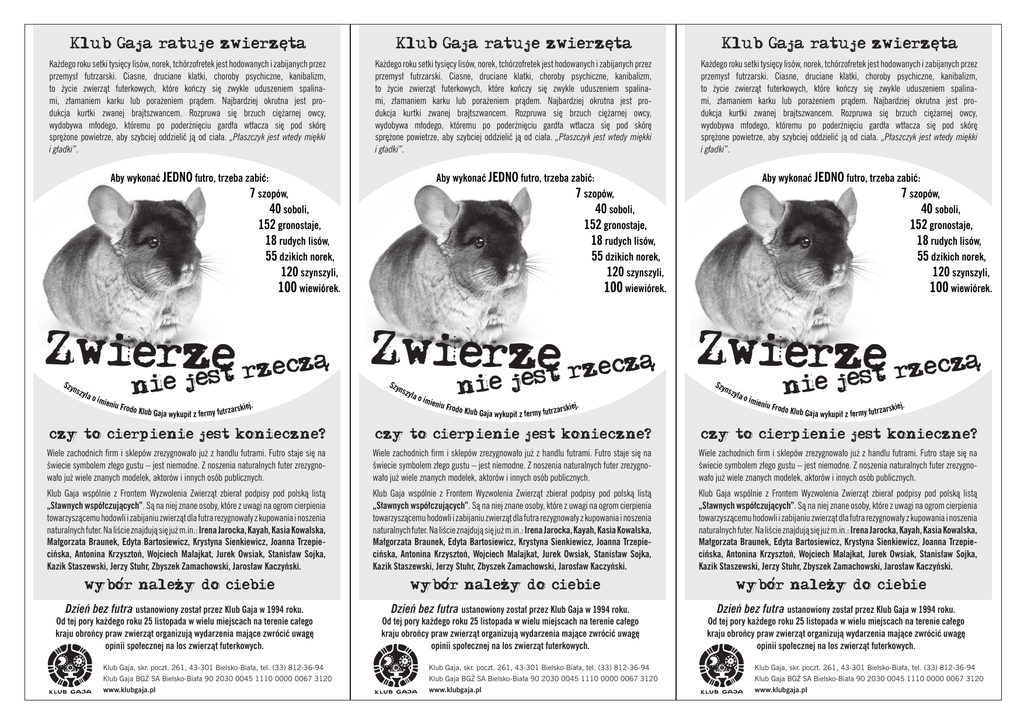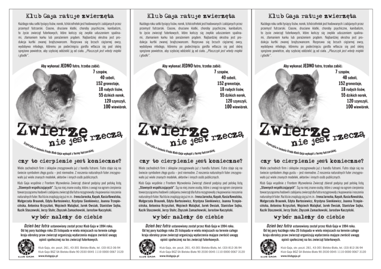 Klub Gaja ratuje zwierzeta Klub Gaja ratuje zwierzeta Klub Gaja ratuje zwierzeta Każdego roku setki tysięcy lisów, norek, tchórzofretek jest hodowanych i zabijanych przez przemysł futrzarski. Ciasne, druciane klatki, choroby psychiczne, kanibalizm, to życie zwierząt futerkowych, które kończy się zwykle uduszeniem spalinami, złamaniem karku lub porażeniem prądem. Najbardziej okrutna jest produkcja kurtki zwanej brajtszwancem. Rozpruwa się brzuch ciężarnej owcy, wydobywa młodego, któremu po poderżnięciu gardła wtłacza się pod skórę sprężone powietrze, aby szybciej oddzielić ją od ciała. „Płaszczyk jest wtedy miękki i gładki”. Każdego roku setki tysięcy lisów, norek, tchórzofretek jest hodowanych i zabijanych przez przemysł futrzarski. Ciasne, druciane klatki, choroby psychiczne, kanibalizm, to życie zwierząt futerkowych, które kończy się zwykle uduszeniem spalinami, złamaniem karku lub porażeniem prądem. Najbardziej okrutna jest produkcja kurtki zwanej brajtszwancem. Rozpruwa się brzuch ciężarnej owcy, wydobywa młodego, któremu po poderżnięciu gardła wtłacza się pod skórę sprężone powietrze, aby szybciej oddzielić ją od ciała. „Płaszczyk jest wtedy miękki i gładki”. Każdego roku setki tysięcy lisów, norek, tchórzofretek jest hodowanych i zabijanych przez przemysł futrzarski. Ciasne, druciane klatki, choroby psychiczne, kanibalizm, to życie zwierząt futerkowych, które kończy się zwykle uduszeniem spalinami, złamaniem karku lub porażeniem prądem. Najbardziej okrutna jest produkcja kurtki zwanej brajtszwancem. Rozpruwa się brzuch ciężarnej owcy, wydobywa młodego, któremu po poderżnięciu gardła wtłacza się pod skórę sprężone powietrze, aby szybciej oddzielić ją od ciała. „Płaszczyk jest wtedy miękki i gładki”. , Aby wykonać JEDNO futro, trzeba zabić: 7 szopów, 40 soboli, 152 gronostaje, 18 rudych lisów, 55 dzikich norek, 120 szynszyli, 100 wiewiórek. , , Aby wykonać JEDNO futro, trzeba zabić: 7 szopów, 40 soboli, 152 gronostaje, 18 rudych lisów, 55 dzikich norek, 120 szynszyli, 100 wiewiórek. Aby wykonać JEDNO futro, trzeba zabić: 7 szopów, 40 soboli, 152 gronostaje, 18 rudych lisów, 55 dzikich norek, 120 szynszyli, 100 wiewiórek. Zwierzset rzecza Zwierzset rzecza Zwierzset rzecza je je je wykupił z fermy futr , , wykupił z fermy futr j. zarskie nie S zy nsz yla o imien iu Frod o Klub Gaja j. zarskie nie S zy nsz yla o imien iu Frod o Klub Gaja wykupił z fermy futrz , nie S zy nsz yla o imien iu Frod o Klub Gaja . arskiej czy to cierpienie jest konieczne? czy to cierpienie jest konieczne? czy to cierpienie jest konieczne? Wiele zachodnich firm i sklepów zrezygnowało już z handlu futrami. Futro staje się na świecie symbolem złego gustu – jest niemodne. Z noszenia naturalnych futer zrezygnowało już wiele znanych modelek, aktorów i innych osób publicznych. Wiele zachodnich firm i sklepów zrezygnowało już z handlu futrami. Futro staje się na świecie symbolem złego gustu – jest niemodne. Z noszenia naturalnych futer zrezygnowało już wiele znanych modelek, aktorów i innych osób publicznych. Wiele zachodnich firm i sklepów zrezygnowało już z handlu futrami. Futro staje się na świecie symbolem złego gustu – jest niemodne. Z noszenia naturalnych futer zrezygnowało już wiele znanych modelek, aktorów i innych osób publicznych. Klub Gaja wspólnie z Frontem Wyzwolenia Zwierząt zbierał podpisy pod polską listą „Sławnych współczujących”. Są na niej znane osoby, które z uwagi na ogrom cierpienia towarzyszącemu hodowli i zabijaniu zwierząt dla futra rezygnowały z kupowania i noszenia naturalnych futer. Na liście znajdują się już m.in.: Irena Jarocka, Kayah, Kasia Kowalska, Małgorzata Braunek, Edyta Bartosiewicz, Krystyna Sienkiewicz, Joanna Trzepiecińska, Antonina Krzysztoń, Wojciech Malajkat, Jurek Owsiak, Stanisław Sojka, Kazik Staszewski, Jerzy Stuhr, Zbyszek Zamachowski, Jarosław Kaczyński. Klub Gaja wspólnie z Frontem Wyzwolenia Zwierząt zbierał podpisy pod polską listą „Sławnych współczujących”. Są na niej znane osoby, które z uwagi na ogrom cierpienia towarzyszącemu hodowli i zabijaniu zwierząt dla futra rezygnowały z kupowania i noszenia naturalnych futer. Na liście znajdują się już m.in.: Irena Jarocka, Kayah, Kasia Kowalska, Małgorzata Braunek, Edyta Bartosiewicz, Krystyna Sienkiewicz, Joanna Trzepiecińska, Antonina Krzysztoń, Wojciech Malajkat, Jurek Owsiak, Stanisław Sojka, Kazik Staszewski, Jerzy Stuhr, Zbyszek Zamachowski, Jarosław Kaczyński. Klub Gaja wspólnie z Frontem Wyzwolenia Zwierząt zbierał podpisy pod polską listą „Sławnych współczujących”. Są na niej znane osoby, które z uwagi na ogrom cierpienia towarzyszącemu hodowli i zabijaniu zwierząt dla futra rezygnowały z kupowania i noszenia naturalnych futer. Na liście znajdują się już m.in.: Irena Jarocka, Kayah, Kasia Kowalska, Małgorzata Braunek, Edyta Bartosiewicz, Krystyna Sienkiewicz, Joanna Trzepiecińska, Antonina Krzysztoń, Wojciech Malajkat, Jurek Owsiak, Stanisław Sojka, Kazik Staszewski, Jerzy Stuhr, Zbyszek Zamachowski, Jarosław Kaczyński. Klub Gaja, skr. poczt. 261, 43-301 Bielsko-Biała, tel. (33) 812-36-94 Klub Gaja BGŻ SA Bielsko-Biała 90 2030 0045 1110 0000 0067 3120 www.klubgaja.pl . wybor nalezy do ciebie Dzień bez futra ustanowiony został przez Klub Gaja w 1994 roku. Od tej pory każdego roku 25 listopada w wielu miejscach na terenie całego kraju obrońcy praw zwierząt organizują wydarzenia mające zwrócić uwagę opinii społecznej na los zwierząt futerkowych. Klub Gaja, skr. poczt. 261, 43-301 Bielsko-Biała, tel. (33) 812-36-94 Klub Gaja BGŻ SA Bielsko-Biała 90 2030 0045 1110 0000 0067 3120 www.klubgaja.pl - Dzień bez futra ustanowiony został przez Klub Gaja w 1994 roku. Od tej pory każdego roku 25 listopada w wielu miejscach na terenie całego kraju obrońcy pra