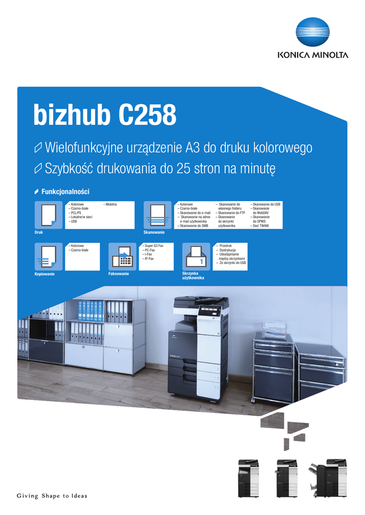 bizhub C258 Wielofunkcyjne urządzenie A3 do druku kolorowego Szybkość drukowania do 25 stron na minutę Funkcjonalności –Kolorowe –Czarno-białe –PCL/PS –Lokalne/w sieci –USB –Mobilna Druk – Skanowanie do własnego folderu –Skanowanie do FTP –Skanowanie do skrzynki użytkownika Skanowanie –Super G3 Fax –PC-Fax –i-Fax –IP-Fax –Kolorowe –Czarno-białe Kopiowanie –Kolorowe –Czarno-białe –Skanowanie do e-mail – Skanowanie na adres e-mail użytkownika –Skanowanie do SMB Faksowanie 1 Skrzynka użytkownika – Przedruk – Dystrybucja – Udostępnianie między skrzynkami – Ze skrzynki do USB –Skanowanie do USB –Skanowanie do WebDAV –Skanowanie do DPWS –Sieć TWAIN BROSZURA bizhub C258 Technologia Kontroler druku Emperon™ Kompatybilny z użytkownikami i środowiskami IT dzięki jednolitej technologii druku Konica Minolta Toner polimeryzowany Simitri® HD Zapewnia wysoką jakość druku, a przy tym jest ekonomiczny i korzystny dla środowiska Platforma OpenAPI Umożliwia efektywną organizację pracy urządzeń wielofunkcyjnych za pomocą aplikacji serwerowych Specjalne funkcje i-Option Zwiększenie zakresu funkcjonalności urządzeń wielofunkcyjnych od podstawowych do zaawansowanych Zdalna diagnostyka serwisowa CSRC Utrzymywanie wydajności za pomocą modułu internetowego do monitorowania materiałów eksploatacyjnych 4 4 4 4 4 Możliwość dopasowania panelu Lepsza współpraca użytkownik-urządzenie i zwiększona wydajność dzięki możliwości dostosowania panelu do indywidualnych potrzeb 4 Schemat opcji UCHWYT KLAWIATURY KH-102 ROZSZERZENIE OBSŁUGI PLIKÓW PDF LK-102v3 CZCIONKI UNICODE LK-107 ROZPOZNAWANIE TEKSTU OCR LK-105v4 CZCIONKI OCR AIB LK-108 CZCIONKI KODÓW KRESKOWYCH LK-106 MODUŁ INTERFEJSU FOR IC-416 VI-508 Pokrywa oryginału OC-511 Podajnik dokumentów DF-704 USB I/F MODUŁ EK-608 LUB MODUŁ PLATFORMY ZAUFANEJ LK-115v2 KONWERTER DOKUMENTÓW LK-110v2 TWORZENIE KOPII DYSKU TWARDEGO HD-524 KLIENT THINPRINT LK-111 (x2) Klawiatura numeryczna KP-101 JOB SEPARATOR JS-506 Moduł przekazujący dla FS-534/SD RU-513 Finiszer zszywający/ do broszur FS-534SD PODAJNIK BANNERÓW BT-C1e DZIURKOWANIA MODUŁ PK-519 Kaseta dużej pojemności LU-302 Podstawa kopiarki DK-510 1 x podajnik uniwersalny, oraz przestrzeń do przechowywania PC-110 2 x podajnik uniwersalny, PC-210 MODUŁ ZABEZPIECZEŃ SC-508 (2 x wymagane jeśli zainstalowano DF-704) MODUŁ ROZSZERZAJĄCY MK-745 BEZPRZEWODOWY LAN UK-212 MODUŁ OCZYSZCZANIA POWIETRZA CU-101 UWIERZYTELNIANIE BIOMETRYCZNE AU-102 CZYTNIK KART IDENTYFIKACYJNYCH RÓŻNE TECHNOLOGIE UWIERZYTELNIANIA KART IDENTYFIKACYJNYCH LUB Finiszer zszywający FS-534 MODUŁ FAKSU FK-514 BEZPRZEWODOWY LAN SX-BR-4600 LUB Finiszer wewnętrzny FS-533 USB I/F MODUŁ EK-609 LUB PÓŁKA BOCZNA WT-506 DODATKOWA PAMIĘĆ UK-211 KONTROLER FIERY IC-416 MODUŁ DZIURKOWANIA PK-520 Podajnik dokumentów DF-629 Kaseta dużej pojemności PC-410 MODUŁ DO MONTAŻU MK-735 Opcje wykańczania Zszywanie narożne Zszywanie Dziurkowanie Dziurkowanie Druk dwupunktowe dwupunktowe czteropunktowe dwustronny / Duplex Połączone mixplex/ mixmedia Składanie na pół Wstawianie gotowych przekładek raportów Składanie listowe Broszura Sortowanie Drukowanie z przesunięciem bannerów BROSZURA bizhub C258 Opisy bizhub C258 DF-629 Podajnik dokumentów DF-704 Podajnik dokumentów OC-511 Pokrywa oryginału PC-110 1 x podajnik uniwersalny PC-210 2 x podajnik uniwersalny PC-410 Kaseta dużej pojemności DK-510 Podstawa kopiarki LU-302 Kaseta dużej pojemności FS-533 Finiszer wewnętrzny PK-519 Moduł dziurkowania dla FS-533 FS-534 Finiszer zszywający FS-534SD Finiszer do broszur RU-513 Moduł przekazujący dla FS-534/SD PK-520 Moduł dziurkowania dla FS-534/SD JS-506 Separator prac KP-101 Klawiatura numeryczna WT-506 Półka boczna FK-514 Moduł faksu Urządzenie wielofunkcyjne A3 do druku czarno-białego i kolorowego z szybkością 25 str./min. Standardowy kontroler druku Emperon™ z obsługą PCL, PostScript i obsługą XPS. Pojemność papieru 500 + 500 arkuszy i 150 arkuszy z podajnika bocznego. Nośniki od A6 do SRA3, banner 1,2 m i 52 – 300 g/m2. pamięć 2 GB, twardy dysk 250 GB i standardowy Gigabit Ethernet. Automatyczny podajnik z funkcją obracania dokumentów, pojemność 100 arkuszy Automatyczny podajnik z funkcją dwustronnego skanowania, pojemność 100 arkuszy Pokrywa zamiast ADF A5–A3, 500 arkuszy, 52–256 g/m2 A5–A3, 2 x 500 arkuszy, 52–256 g/m2 A4, 2,500 arkuszy, 52–256 g/m2 Zapewnia przestrzeń do magazynowania materiałów eksploatacyjnych A4, 3000 arkuszy, 52–256 g/m2 Zszywanie 50 arkuszy, taca wyjściowa maks. 500 arkuszy Dziurkowanie 2/4 otworów, automatyczne obracanie Zszywanie 50 arkuszy, taca wyjściowa maks. 3300 arkuszy Finiszer zszywający 50 arkuszy, finiszer do broszur 20 arkuszy, taca wyjściowa 2 300 arkuszy Dla instalacji FS-534/SD Dziurkowanie 2/4 otworów, automatyczne obracanie Separacja dla wydruków z faksu itp. Zamiast ekranu dotykowego Umieszczenie urządzenia uwierzytelniającego Faks Super G3, funkcja faksu cyfrowego IC-416 Kontroler Fiery VI-508 Moduł interfejsu dla IC-416 KH-102 Uchwyt klawiatury EK-608 Moduł USB I/F EK-609 Moduł USB I/F Czytnik kart identyfikacyjnych Moduł do montażu MK-735 AU-102 Moduł autoryzacji biometrycznej SC-508 Moduł zabezpieczeń Profesjonalny kontroler kolorów druku Karta interfejsu kontrolera Fiery Do mocowania klawiatury USB Złącze klawiatury USB Złącze klawiatury USB, Bluetooth Różne technologie uwierzytelniania kart identyfikacyjnych Moduł do montażu czytnika kart ID Skaner linii papilarnych w palcu HD-524 Tworzenie kopii dysku twardego BT-C1e Podajnik bannerów LK-102v3 Rozszerzenie obsługi plików PDF LK-105v4 Rozpoznawanie tekstu OCR LK-106 Czcionki kodów kreskowych LK-107 Czcionki Unicode LK-108 Czcionki OCR A i B LK-110v2 Konwerter dokumentów LK-111 Klient ThinPrint® LK-115v2 Aktywacja TPM UK-211 Dodatkowa pamięć UK-212 Bezprzewod