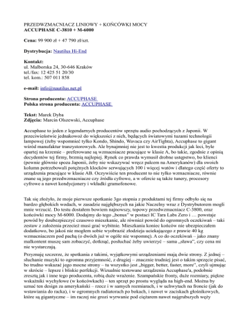 PRZEDWZMACNIACZ LINIOWY + KOŃCÓWKI MOCY ACCUPHASE C-3810 + M-6000 Cena: 99 900 zł + 47 790 zł/szt. Dystrybucja: Nautilus Hi-End Kontakt: ul. Malborska 24, 30-646 Kraków tel./fax: 12 425 51 20/30 tel. kom.: 507 011 858 e-mail: [email protected] Strona producenta: ACCUPHASE Polska strona producenta: ACCUPHASE Tekst: Marek Dyba Zdjęcia: Marcin Olszewski, Accuphase Accuphase to jeden z legendarnych producentów sprzętu audio pochodzących z Japonii. W przeciwieństwie jednakowoż do większości z nich, będących światowymi tuzami technologii lampowej (żeby wspomnieć tylko Kondo, Shindo, Wavaca czy AirTighta), Accuphase to gigant wśród manufaktur tranzystorowych. Ale bynajmniej nie jest to kwestia produkcji jak leci, byle opartej na krzemie – preferowane są wzmacniacze pracujące w klasie A, bo takie, zgodnie z opinią decydentów tej firmy, brzmią najlepiej. Rynek co prawda wymusił drobne ustępstwo, bo klienci (pewnie głównie spoza Japonii, żeby nie wskazywać wręcz palcem na Amerykanów) dla swoich kolumn potrzebowali potężnych klocków serwujących 100 i więcej watów i dlatego część oferty to urządzenia pracujące w klasie AB. Oczywiście ten producent to nie tylko wzmacniacze, równie znane są jego przedwzmacniacze czy źródła cyfrowe, a w ofercie są także tunery, procesory cyfrowe a nawet kondycjonery i wkładki gramofonowe. Tak się złożyło, że moje pierwsze spotkanie 3go stopnia z produktami tej firmy odbyło się na bardzo głębokich wodach, w zasadzie najgłębszych na jakie Naczelny wraz z Dystrybutorem mogli mnie wrzucić. Do testu dostałem bowiem najnowszy, topowy przedwzmacniacz C-3800, oraz końcówki mocy M-6000. Dodajmy do tego „bonus” w postaci IC Tara Labs Zero i … powstaje powód by doubezpieczyć czasowo mieszkanie, ale również powód do ogromnych oczekiwań – taki zestaw z założenia przecież musi grać wybitnie. Mieszkania koniec końców nie ubezpieczałem dodatkowo, bo jakoś nie mogłem sobie wyobrazić złodzieja uciekającego z prawie 40 kg wzmacniaczem pod pachą (o dwóch już w ogóle nie wspomnę). A co do oczekiwań – jako znany malkontent muszę sam zobaczyć, dotknąć, posłuchać żeby uwierzyć – sama „sława”, czy cena mi nie wystarczają. Przyznaję szczerze, że spotkania z takimi, wyjątkowymi urządzeniami mają dwie strony. Z jednej – słuchanie muzyki to ogromna przyjemność, z drugiej – znacznie trudniej jest o takim sprzęcie pisać, bo trudno wskazać jego mocne strony – tu wszystko jest „bigger, better, faster, more”, czyli ujmując w skrócie – lepsze i bliskie perfekcji. Wizualnie testowane urządzenia Accuphase'a, podobnie zresztą jak i inne tego producenta, robią duże wrażenie. Szampańskie fronty, duże rozmiary, piękne wskaźniki wychyłowe (w końcówkach) – ten sprzęt po prostu wygląda na high-end. Można by uznać ten design za amerykański – rzecz i w samych rozmiarach, i w uchwytach na froncie (jak do wstawiania do racka), i w ogromnych radiatorach po bokach, i nawet w zaciskach głośnikowych, które są gigantyczne – im raczej nie grozi wyrwanie pod ciężarem nawet najgrubszych węży ogrodowych, tj chciałem powiedzieć kabli głośnikowych. Nawet przedwzmacniacz waży więcej niż niejedna końcówka innej firmy. Trzeba jednak przyznać, że gdy spojrzeć na wnętrza tych urządzeń to okazuje się, że muszą być tak duże, że to nie jest żadna gigantomania – wewnątrz obudów jest bardzo niewiele „audiofilskiego powietrza”. Ogromne transformatory, kondensatory wielkości puszki napoju (i to po dwa w każdej końcówce) i w pełni zbalansowana budowa wymagają dużej ilości miejsca. Końcówki, jak już pisałem, są urządzeniami w pełni zbalansowanymi stąd wejścia zarówno XLR jak i RCA. Jeśli komuś mało będzie mocy z dwóch monobloków M-6000 (producent informuje, że potrafią oddać 1200W / 1Ω) to każdych z nich można zbridżować z kolejnym, czyli użyć w systemie czterech takich smoków i stąd w każdym wzmacniaczu również wyjścia, a nie tylko wejścia. Przedwzmacniacz C-3810 to również urządzenie zbalansowane i podobnie jak poprzednik - C-2810, posiada ogromną baterię wejść RCA oraz XLR, zdolną obsłużyć nawet najbardziej rozbudowany system. Płyty użyte do testu: • • • • • • • Arne Domnerus, Jazz at the Pawnshop, Proprius/First Impression Music, 012-013, XRCD. Dick Hayman, In recital, Reference Recordings, RR-84, HDCD. Janos Starker, Schuman: Cello Concerto, Merkury, 475 6621, SACD. Raul Midon, State of mind, EMI, 0946 3560012 4. Buddy Guy, Blues Singer, Silvertone, 01241-41843-2. Beethoven, Symphonie No. 9, Deutsche Grammophon, DG 445 503-2. Pink Floyd, Dark side of the Moon, Toshiba-EMI, TOGP-15001, SACD/CD. ODSŁUCH Jako człowiek funkcjonujący wśród znajomych audiofilów i na forach internetowych nie mogłem nie zetknąć się z różnymi opiniami o urządzeniach tej firmy. To co mi jakoś głównie zostało w głowie to „ocieplone” granie – oczywiście opisy były różne, ale generalnie rzecz biorąc można było z nich wnosić, że Accuphase = granie raczej po ciepłej stronie mocy. Oczywiście nikt nie mówił o przesadnym ociepleniu, ale niemal we wszystkich wypowiedziach pojawiało się jakieś „ocieplenie/ciepełko” etc, a w zasadzie nie spotkałem się z opinią, żeby któryś z tych japończyków grał zimno. Być może większość owych ludzi miała styczność z wzmacniaczami w klasie A, po których można się spodziewać nie tylko ogromnych ilości faktycznego ciepła, jakie produkują, ale i choć odrobinę ocieplonego dźwięku. Klasa AB, jak się okazało, ogrzewa pomieszczenie też całkiem nieźle, ale w samym dźwięku specjalnie owego Accuphase'owego ciepełka jakoś się dosłuchać nie mogłem. Pewnie że zdarzyło mi się słuchać jeszcze „zimniejszych” wzmacniaczy - choćby Gryphona Atilli, ale M-6000, jak na moje uszy, zagrały bardzo 