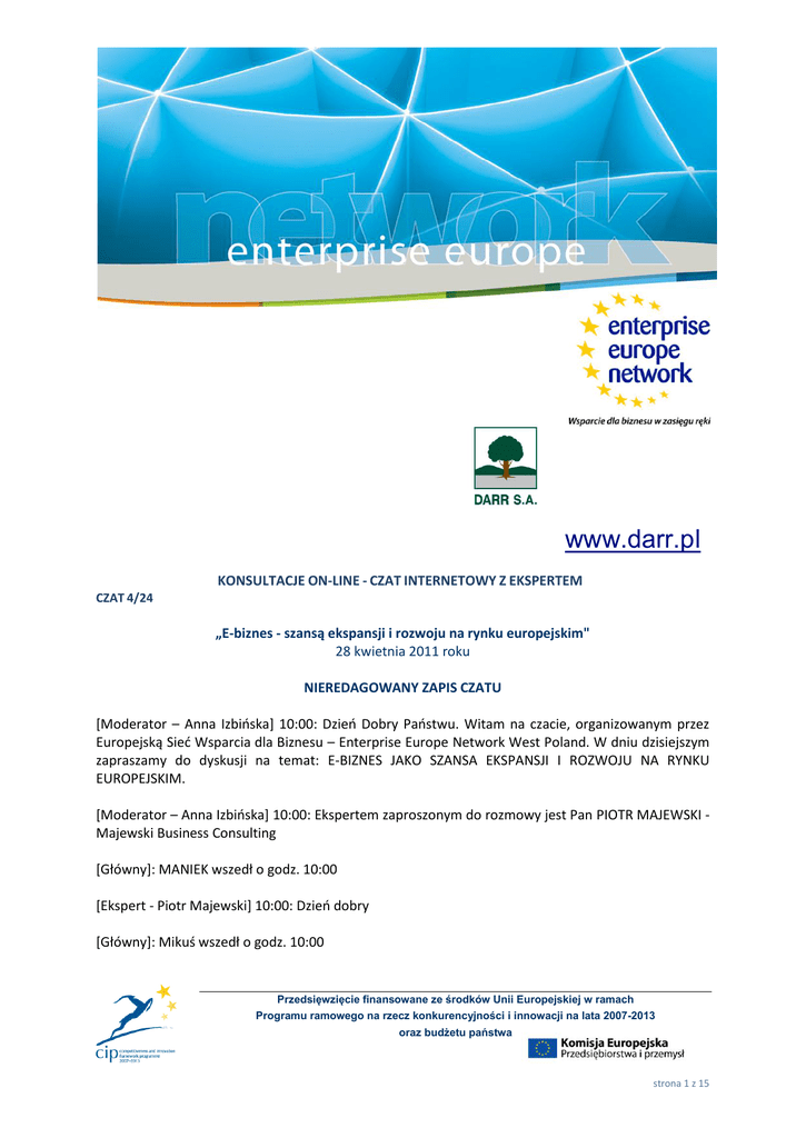 www.darr.pl KONSULTACJE ON-LINE - CZAT INTERNETOWY Z EKSPERTEM CZAT 4/24 „E-biznes - szansą ekspansji i rozwoju na rynku europejskim" 28 kwietnia 2011 roku NIEREDAGOWANY ZAPIS CZATU [Moderator – Anna Izbioska+ 10:00: Dzieo Dobry Paostwu. Witam na czacie, organizowanym przez Europejską Sied Wsparcia dla Biznesu – Enterprise Europe Network West Poland. W dniu dzisiejszym zapraszamy do dyskusji na temat: E-BIZNES JAKO SZANSA EKSPANSJI I ROZWOJU NA RYNKU EUROPEJSKIM. [Moderator – Anna Izbioska+ 10:00: Ekspertem zaproszonym do rozmowy jest Pan PIOTR MAJEWSKI Majewski Business Consulting *Główny+: MANIEK wszedł o godz. 10:00 [Ekspert - Piotr Majewski] 10:00: Dzieo dobry *Główny+: Mikuś wszedł o godz. 10:00 Przedsięwzięcie finansowane ze środków Unii Europejskiej w ramach Programu ramowego na rzecz konkurencyjności i innowacji na lata 2007-2013 oraz budżetu państwa strona 1 z 15 [Moderator – Anna Izbioska+ 10:00: PIOTR MAJEWSKI jest prawdopodobnie najbardziej znanym doradcą małych i średnich e-biznesów w Polsce. Uczy poprzez swoje publikacje, doradza i szkoli od 2000 roku. [Moderator – Anna Izbioska+ 10:01: Jest redaktorem serwisu CzasNaE-Biznes liczącego 90 000 czytelników i administratorem Polskiego Forum E-Biznesu. Napisał bestseller Czas na e-biznes. [Moderator – Anna Izbioska+ 10:01: Stworzył najpopularniejszy system mailingowy w Polsce FreeBot.pl, z którego korzysta kilkanaście tysięcy osób. Nasz ekspert zaprojektował również od początku do kooca od strony merytorycznej i napisał ponad 300 stronnicowy poradnik do największego projektu szkoleniowego w historii polskiego e-biznesu. *Główny+: Elizabeth wszedł o godz. 10:01 [Moderator – Anna Izbioska+ 10:01: W dotowanych przez Unię Europejską szkoleniach RozwijamyEBiznes.pl wzięło udział 1900 przedstawicieli polskich firm. Niemalże wszyscy wykładowcy w tym projekcie pochodzili z rekomendacji Piotra Majewskiego. *Główny+: Sokół wszedł o godz. 10:01 [Moderator – Anna Izbioska+ 10:01: PIOTR MAJEWSKI jest też twórcą Pierwszej Otwartej Platformy ELearningowej Ekademia.pl i organizatorem corocznych konferencji z tematyki e-biznesu. Szczegółowe informacje o ekspercie oraz firmie Majewski Business Consulting znajdą Paostwo na stronie: http://www.majewskibc.pl [Moderator – Anna Izbioska+ 10:01: Informacje na temat Eksperta znajdą Paostwo również na naszej stronie (www.darr.pl) w zakładce: Projekty / Enterprise Europe Network / Więcej informacji / Porozmawiaj z ekspertem – czaty (http://www.darr.pl/pl/1037/Czaty_internetowe) *Główny+: slawek wszedł o godz. 10:01 [slawek] 10:02: dzieo dobry [Moderator – Anna Izbioska+ 10:02: Na wstępie spotkania proszę Eksperta o komentarz dlaczego warto prowadzid e-biznes, z perspektywy MSP działającego na rynku europejskim i poza nim? [Ekspert - Piotr Majewski] 10:02: witam [Ekspert - Piotr Majewski] 10:03: E-Biznes daje każdej firmie - nie tylko tej, która chce sprzedawad w Internecie, niesamowite możliwości, które nigdy wcześniej nie były dostępne [Ekspert - Piotr Majewski] 10:03: przede wszystkim Internet jest kanałem komunikacyjnym (a dopiero pozniej handlowym) [Moderator – Anna Izbioska+ 10:03: Informacja techniczna - Ekspert koocząc wypowiedź użyje znak ">" - maksymalna ilośd znaków do jednorazowego wpisu to 500. [Ekspert - Piotr Majewski] 10:03: o bardzo niskim koszcie dotarcia z informacja do odbiorcy oraz o bardzo wysokich możliwościach śledzenia, co z ta informacja sie dzieje i jak komunikacja przekłada się na sprzedaż strona 2 z 15 [Ekspert - Piotr Majewski] 10:04: nigdy wcześniej nie było takiej możliwości [Ekspert - Piotr Majewski] 10:04: Firmy, które nie chcą sprzedawad w Internecie również mogą odnieśd wiele korzyści z bardzo aktywnej obecności w sieci [Ekspert - Piotr Majewski] 10:04: > [Moderator – Anna Izbioska+ 10:04: Bardzo dziękuję za odpowiedz na pytanie. Zapraszam Paostwa do zadawania pytao. *Zbyszek+ 10:05: Witam, chciałbym zapytad jak mają prawa polscy konsumenci przy zakupach w zagranicznych sklepach, czy jest to w jakiś sposób uregulowane przez Unię Europejską? [Ekspert - Piotr Majewski] 10:06: Och, trochę wybiegliśmy poza moje kompetencje - nie zajmuję się niestety prawem EU. [Ekspert - Piotr Majewski] 10:07: > [Ekspert - Piotr Majewski] 10:07: Chętnie odpowiem na pytania dot. e-marketingu. [Moderator – Anna Izbioska+ 10:07: Proszę zatem o kolejne pytanie. [slawek] 10:08: Czy istnieje jakaś mierzalna granica pod względem użytkowników i odwiedzin po której serwis może generowad zyski wyłącznie z reklam? *Główny+: aaa wszedł o godz. 10:08 *Zbyszek+ 10:08: Właściwie to chodzi mi o to dlaczego w niektórych sklepach zagranicznych nie mogą jeszcze kupowad polscy konsumenci? *Główny+: aaa wyszedł o godz. 10:09 [Ekspert - Piotr Majewski] 10:09: Możliwośd generowania zysków z reklam bardziej zależy od jakości użytkowników niż od ich ilości. Oczywiście jeśli nastawiamy sie na zarobek z kampanii masowych (typu Run On Network albo Run On Site), wtedy liczy sie jak największy ruch. Serwis posiadający +10 000 wizyt dziennie może generowad bardzo solidny dochód z reklam, o ile nie będzie się polegało wyłącznie na sieciach reklamowych w kwestii pozyskiwania zleceniodawców [Ekspert - Piotr Majewski] 10:09: i o ile będziemy budowali również listę adresowa odwiedzających i stosowali aktywnie e-mail marketing [Ekspert - Piotr Majewski] 10:09: > [Ekspert - Piotr Majewski] 10:10: Dodam jeszcze [Ekspert - Piotr Majewski] 10:10: ze ja posiadam serwisy o mniejszym ruchu, które dzięki temu, że sami dobieramy produkty i usługi do promocji generują więcej pieniędzy niż niejeden wielokrotnie popularniejszy portal zarabiający na reklamach dostarczanych przez sieci reklamowe. > [Moderator – Anna Izbioska+ 10:11: Pytanie oczekujące od *Zbyszek+ 10:08: Właściwie to chodzi mi o to dlaczego w niektórych sklepach zagranicznych 