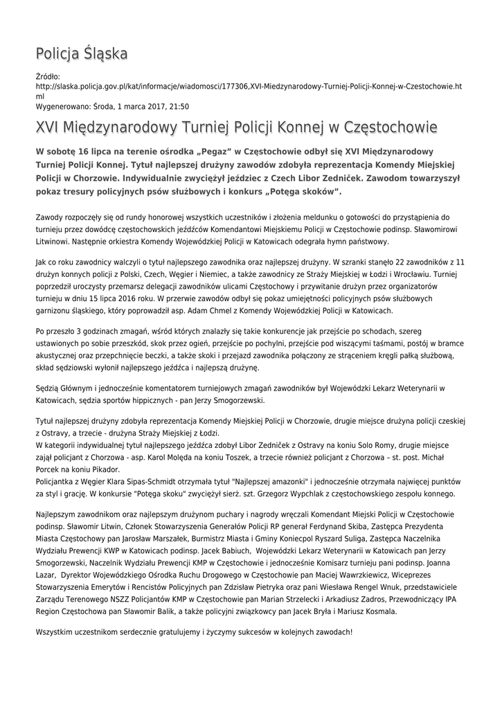 Policja Śląska Źródło: http://slaska.policja.gov.pl/kat/informacje/wiadomosci/177306,XVI-Miedzynarodowy-Turniej-Policji-Konnej-w-Czestochowie.ht ml Wygenerowano: Środa, 1 marca 2017, 21:50 XVI Międzynarodowy Turniej Policji Konnej w Częstochowie W sobotę 16 lipca na terenie ośrodka „Pegaz” w Częstochowie odbył się XVI Międzynarodowy Turniej Policji Konnej. Tytuł najlepszej drużyny zawodów zdobyła reprezentacja Komendy Miejskiej Policji w Chorzowie. Indywidualnie zwyciężył jeździec z Czech Libor Zedniček. Zawodom towarzyszył pokaz tresury policyjnych psów służbowych i konkurs „Potęga skoków”. Zawody rozpoczęły się od rundy honorowej wszystkich uczestników i złożenia meldunku o gotowości do przystąpienia do turnieju przez dowódcę częstochowskich jeźdźców Komendantowi Miejskiemu Policji w Częstochowie podinsp. Sławomirowi Litwinowi. Następnie orkiestra Komendy Wojewódzkiej Policji w Katowicach odegrała hymn państwowy. Jak co roku zawodnicy walczyli o tytuł najlepszego zawodnika oraz najlepszej drużyny. W szranki stanęło 22 zawodników z 11 drużyn konnych policji z Polski, Czech, Węgier i Niemiec, a także zawodnicy ze Straży Miejskiej w Łodzi i Wrocławiu. Turniej poprzedził uroczysty przemarsz delegacji zawodników ulicami Częstochowy i przywitanie drużyn przez organizatorów turnieju w dniu 15 lipca 2016 roku. W przerwie zawodów odbył się pokaz umiejętności policyjnych psów służbowych garnizonu śląskiego, który poprowadził asp. Adam Chmel z Komendy Wojewódzkiej Policji w Katowicach. Po przeszło 3 godzinach zmagań, wśród których znalazły się takie konkurencje jak przejście po schodach, szereg ustawionych po sobie przeszkód, skok przez ogień, przejście po pochylni, przejście pod wiszącymi taśmami, postój w bramce akustycznej oraz przepchnięcie beczki, a także skoki i przejazd zawodnika połączony ze strąceniem kręgli pałką służbową, skład sędziowski wyłonił najlepszego jeźdźca i najlepszą drużynę. Sędzią Głównym i jednocześnie komentatorem turniejowych zmagań zawodników był Wojewódzki Lekarz Weterynarii w Katowicach, sędzia sportów hippicznych - pan Jerzy Smogorzewski. Tytuł najlepszej drużyny zdobyła reprezentacja Komendy Miejskiej Policji w Chorzowie, drugie miejsce drużyna policji czeskiej z Ostravy, a trzecie - drużyna Straży Miejskiej z Łodzi. W kategorii indywidualnej tytuł najlepszego jeźdźca zdobył Libor Zedniček z Ostravy na koniu Solo Romy, drugie miejsce zajął policjant z Chorzowa - asp. Karol Molęda na koniu Toszek, a trzecie również policjant z Chorzowa – st. post. Michał Porcek na koniu Pikador. Policjantka z Węgier Klara Sipas-Schmidt otrzymała tytuł "Najlepszej amazonki" i jednocześnie otrzymała najwięcej punktów za styl i grację. W konkursie "Potęga skoku" zwyciężył sierż. szt. Grzegorz Wypchlak z częstochowskiego zespołu konnego. Najlepszym zawodnikom oraz najlepszym drużynom puchary i nagrody wręczali Komendant Miejski Policji w Częstochowie podinsp. Sławomir Litwin, Członek Stowarzyszenia Generałów Policji RP generał Ferdynand Skiba, Zastępca Prezydenta Miasta Częstochowy pan Jarosław Marszałek, Burmistrz Miasta i Gminy Koniecpol Ryszard Suliga, Zastępca Naczelnika Wydziału Prewencji KWP w Katowicach podinsp. Jacek Babiuch, Wojewódzki Lekarz Weterynarii w Katowicach pan Jerzy Smogorzewski, Naczelnik Wydziału Prewencji KMP w Częstochowie i jednocześnie Komisarz turnieju pani podinsp. Joanna Lazar, Dyrektor Wojewódzkiego Ośrodka Ruchu Drogowego w Częstochowie pan Maciej Wawrzkiewicz, Wiceprezes Stowarzyszenia Emerytów i Rencistów Policyjnych pan Zdzisław Pietryka oraz pani Wiesława Rengel Wnuk, przedstawiciele Zarządu Terenowego NSZZ Policjantów KMP w Częstochowie pan Marian Strzelecki i Arkadiusz Zadros, Przewodniczący IPA Region Częstochowa pan Sławomir Balik, a także policyjni związkowcy pan Jacek Bryła i Mariusz Kosmala. Wszystkim uczestnikom serdecznie gratulujemy i życzymy sukcesów w kolejnych zawodach! Ocena: 5/5 (3) Tweetnij