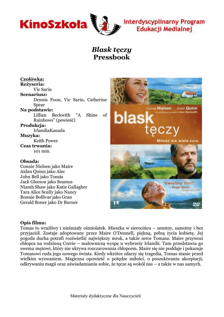 Blask tęczy Pressbook Czołówka: Reżyseria: Vic Sarin Scenariusz: Dennis Foon, Vic Sarin, Catherine Spear Na podstawie: Lillian Beckwith "A Shine of Rainbows" (powieść) Produkcja: IrlandiaKanada Muzyka: Keith Power Czas trwania: 101 min. Obsada: Connie Nielsen jako Maire Aidan Quinn jako Alec John Bell jako Tomás Jack Gleeson jako Seamus Niamh Shaw jako Katie Gallagher Tara Alice Scully jako Nancy Bonnie Bollivar jako Gran Gerald Boner jako Dr Burner Opis filmu: Tomas to wrażliwy i nieśmiały ośmiolatek. Mieszka w sierocińcu – smutny, samotny i bez przyjaciół. Zostaje adoptowany przez Maire O’Donnell, piękną, pełną życia kobietę. Jej pogoda ducha potrafi rozświetlić największy mrok, a także serce Tomasa. Maire przywozi chłopca na rodzinną Corrie – malowniczą wyspę u wybrzeży Irlandii. Tam przedstawia go swemu mężowi, który nie ukrywa rozczarowania chłopcem. Maire się nie poddaje i pokazuje Tomasowi cuda jego nowego świata. Kiedy wkrótce zdarzy się tragedia, Tomas stanie przed wielkim wyzwaniem. Magiczna opowieść o potędze miłości, o poszukiwaniu akceptacji, odkrywaniu magii oraz uświadamianiu sobie, że tęcze są wokół nas – a także w nas samych. Materiały dydaktyczne dla Nauczycieli O PRODUKCJI: Blask tęczy to historia Tomasa wrażliwego chłopca, którego poznajemy w chwili, gdy zostaje zabrany z sierocińca przez Maire O’Donnell. Początkowo niepewne zamiary kobiety oraz przyszłość, która czeka Tomasa, dość szybko stają się jasne. Ba, nawet sam finał historii jest przewidywalny. Pomimo to film niejednokrotnie wzruszył mnie do łez. Oprócz fabuły film urzeka pięknem krajobrazów i postacią Maire wykreowaną przez Connie Nielsen. Być może to właśnie Maire sprawia, że obraz wyróżnia się na tle podobnych ekranizacji. Jej siła wewnętrzna, niezaprzeczalny urok i kolory, którymi zdaje się zaklinać surową wyspiarską rzeczywistość hipnotyzują. Blask tęczy to bajka dla dorosłych, która budzi w odbiorcy chęć czynienia dobra i kreowania lepszej rzeczywistości chociażby dla najbliższych. Na podstawie materiałów: http://www.filmweb.pl/film/Blask+t%C4%99czy-2009-432110 http://rzeczyzebrane.blogspot.com/2014/02/ale-kino-blask-teczy-2009.html Materiały dydaktyczne dla Nauczycieli